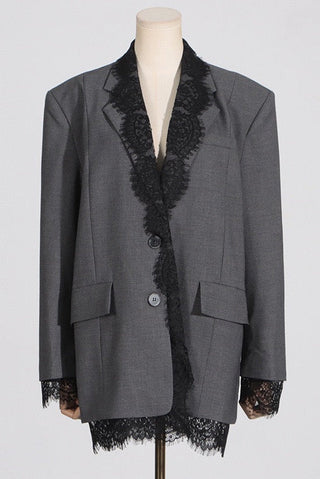 Lace-Trimmed Oversized Blazer Dress with Structured Shoulders