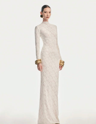 Long Sleeve High-Neck Lace Maxi Dress with Sheer Corset Design