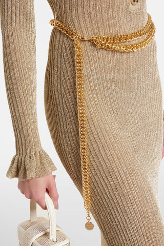 Metallic Ribbed Knit Long Sleeve Midi Dress with Gold Chain Belt