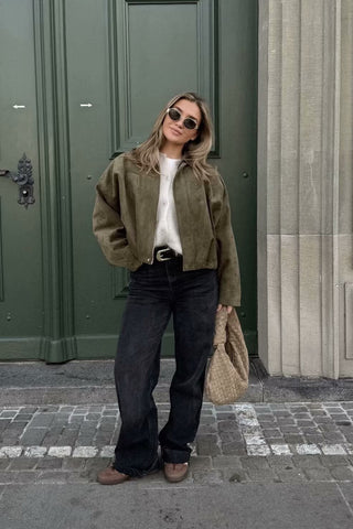 Oversized Faux Suede Jacket with Shoulder Flap Detail and Elastic Hem