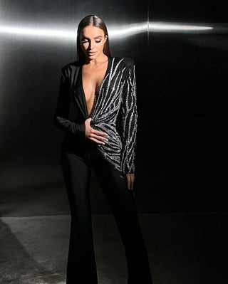 Sexy Deep V-Neck Rhinestone Flared Jumpsuit - Slim Fit Long Sleeve