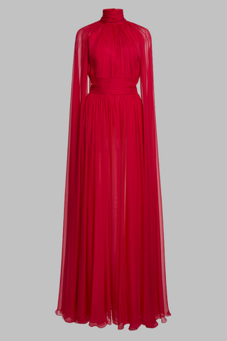 Red Pleated Cape Long Dress with High Neck and Chiffon Overlay