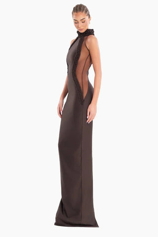 Chocolate Brown Halter Neck Long Dress – Sculpted Bodycon Gown with Braided Trim