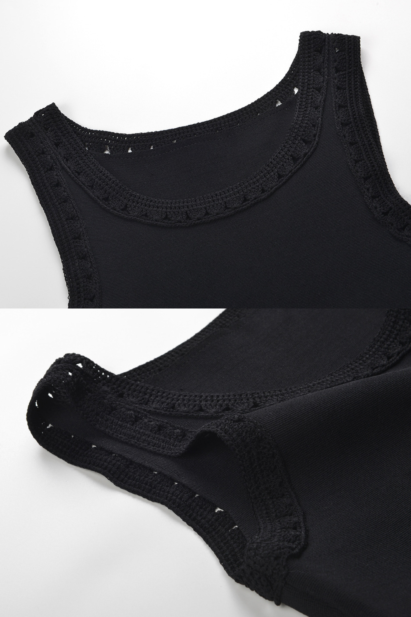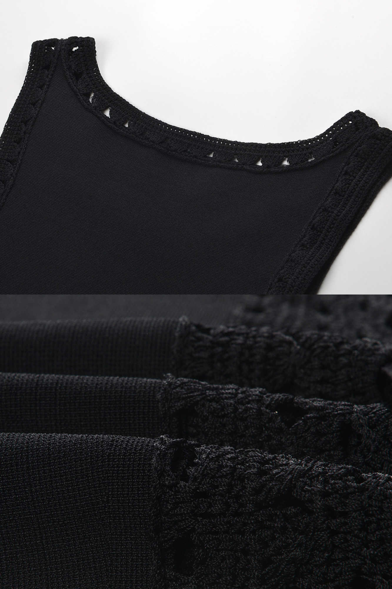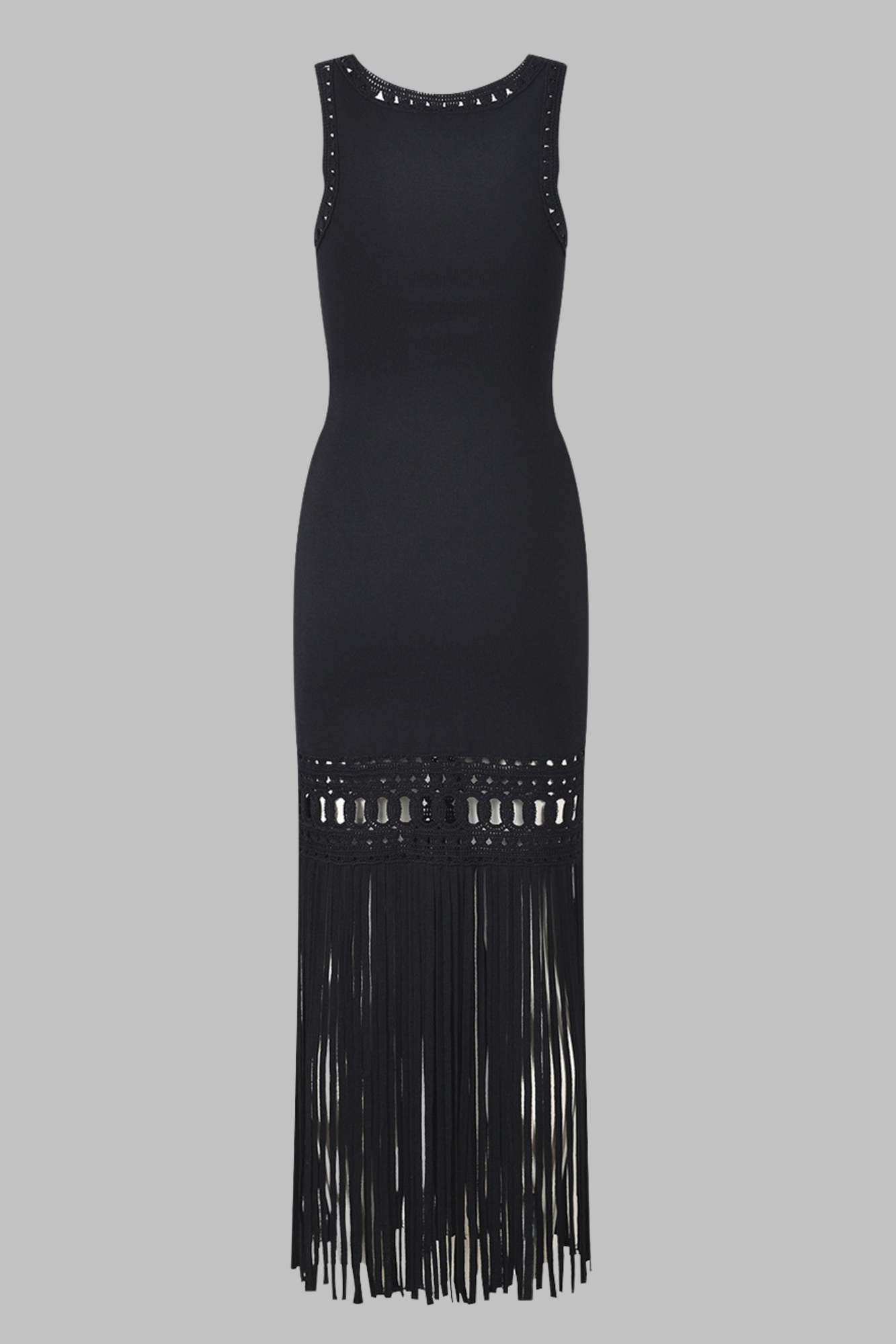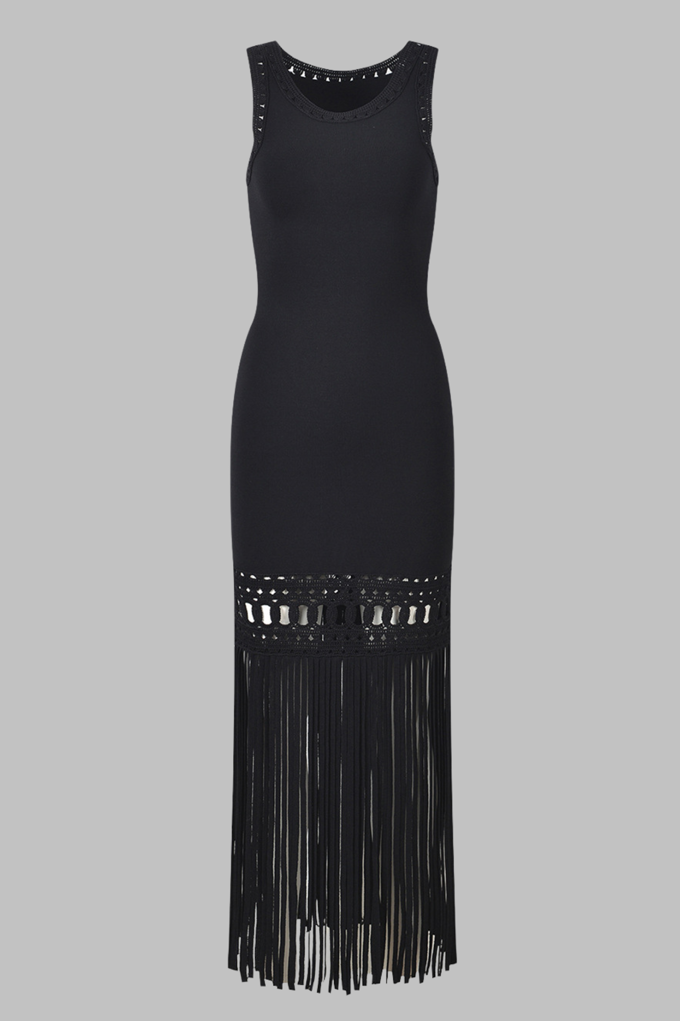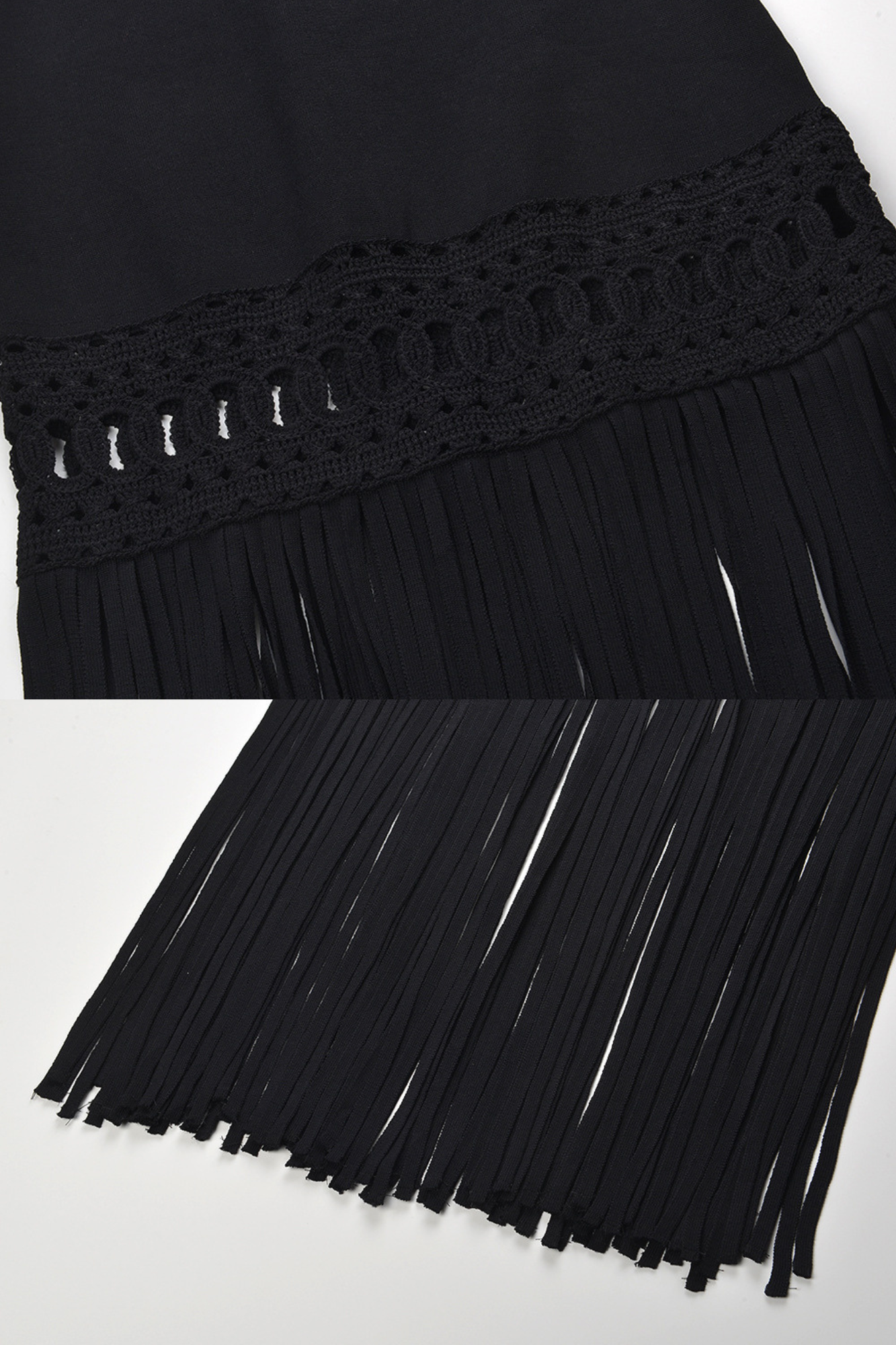 Turn heads in this elegant black midi dress featuring a sleeveless bodycon silhouette, crochet-trimmed neckline and waist, and a statement fringe hemline that sways with every step. Perfect for evening events, summer nights, or chic parties, this dress combines modern sophistication with a playful bohemian edge