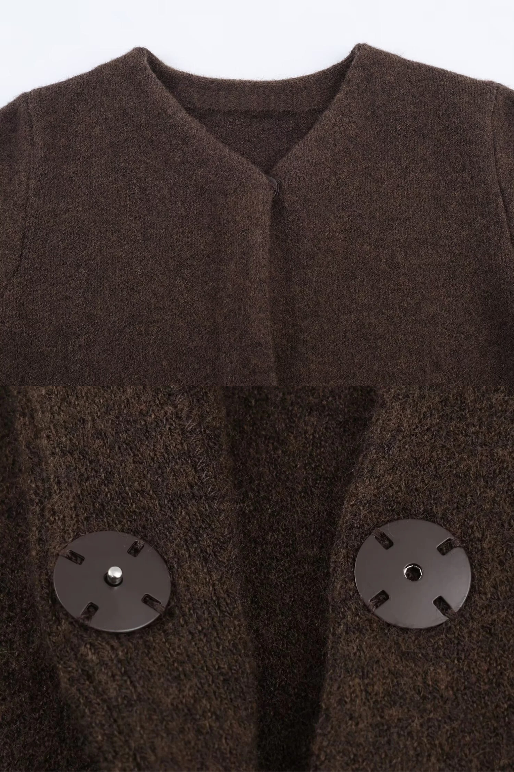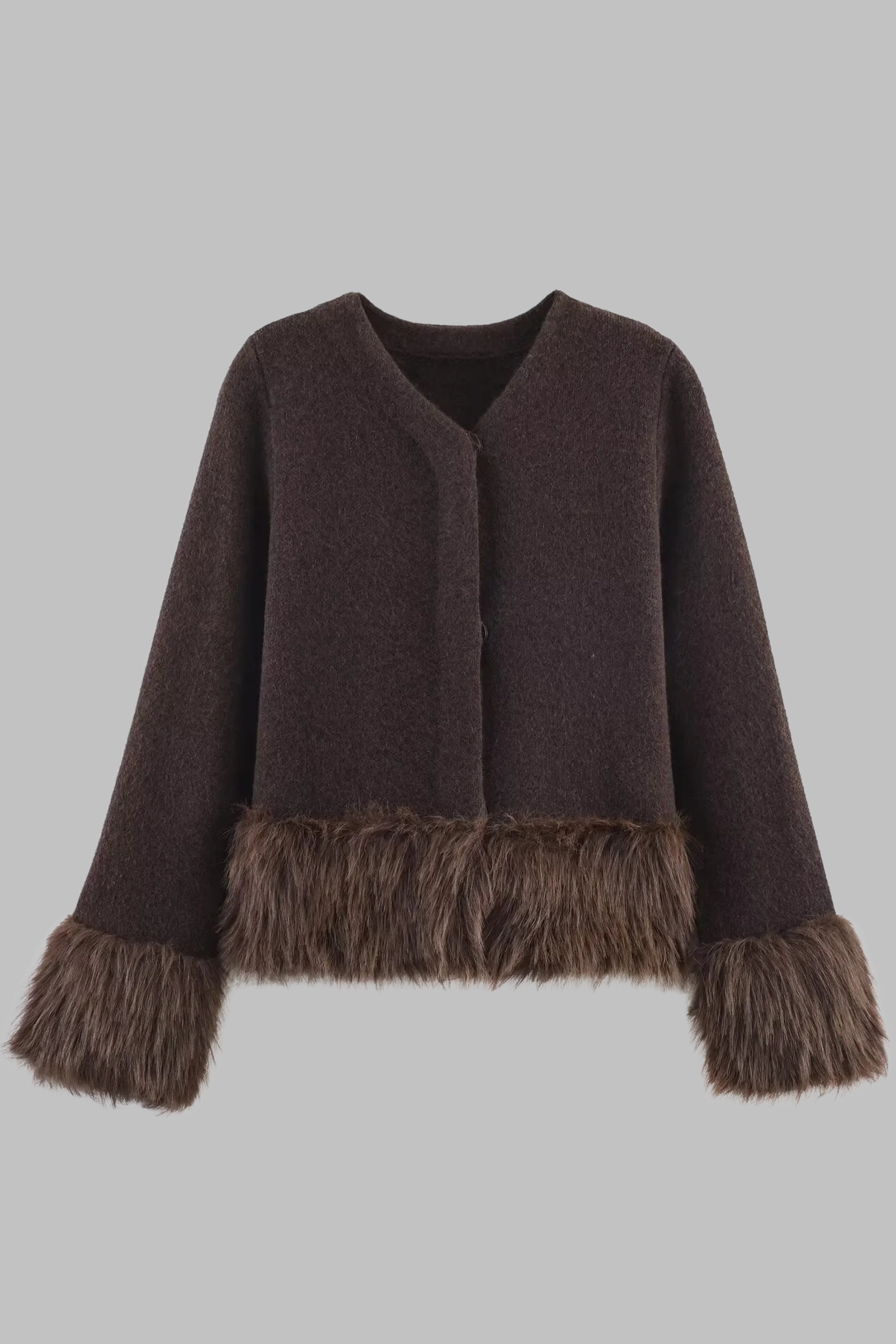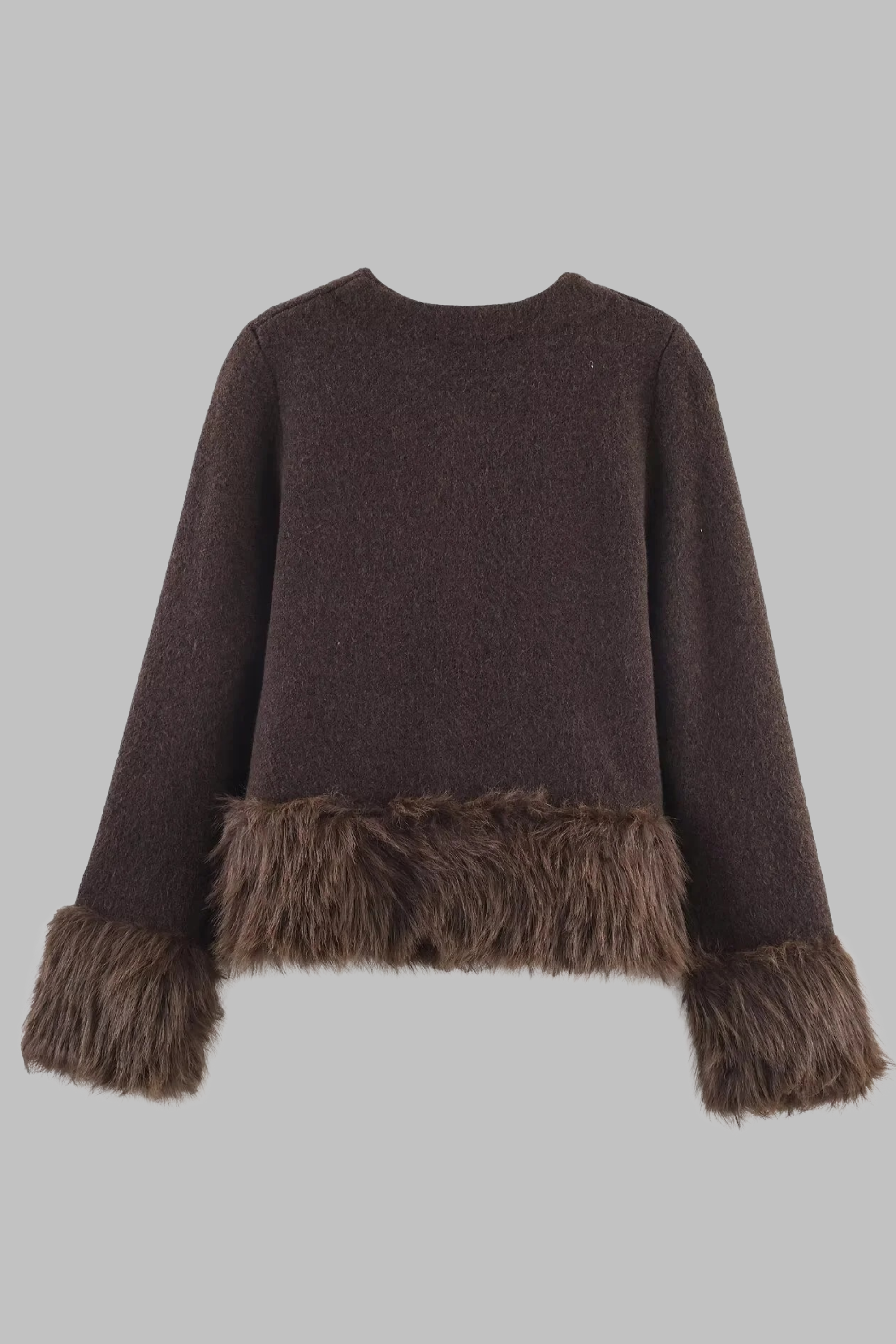 Elegant brown wool-blend jacket detailed with plush faux fur cuffs and hemline. The soft texture and cropped silhouette create a cozy yet polished look, ideal for winter layering or pairing with matching wool skirts for a chic coordinated outfit.