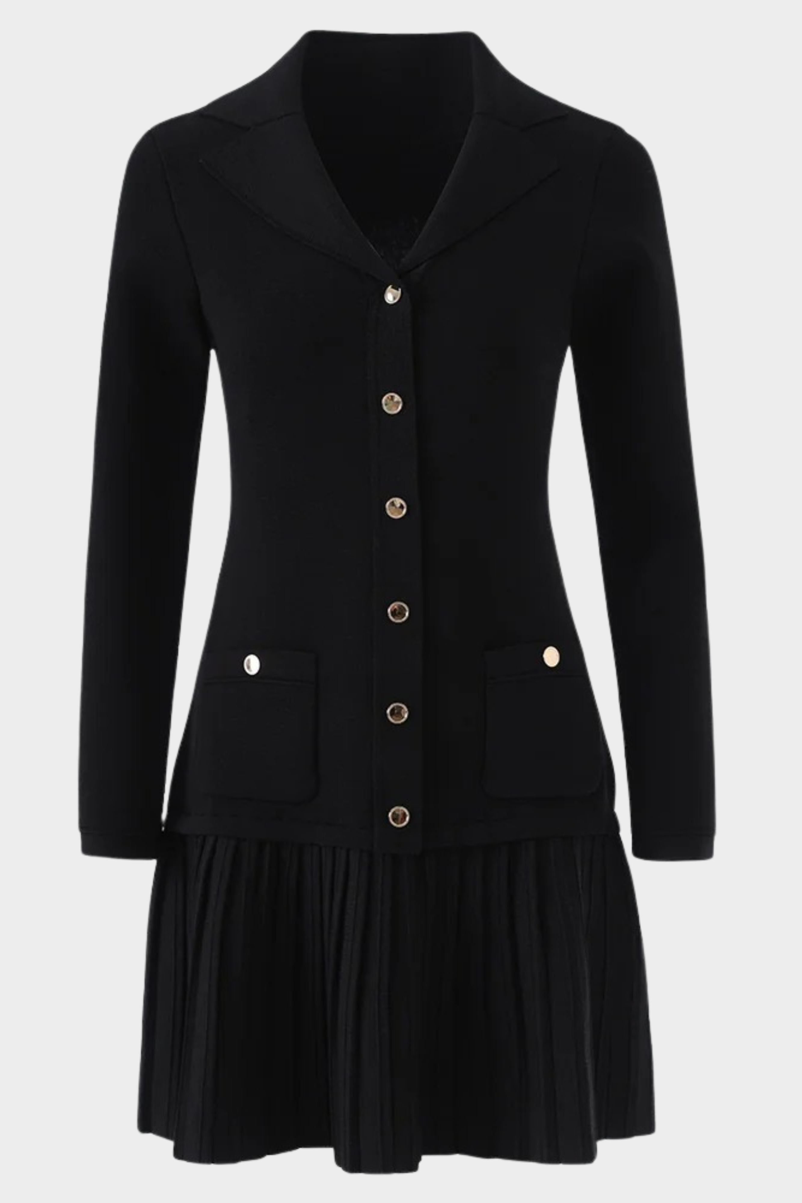 An effortless silhouette that blends polish with everyday ease. This long knit dress features a tailored upper body with a soft lapel neckline, full-length sleeves, and a button-front closure that adds a refined finish.