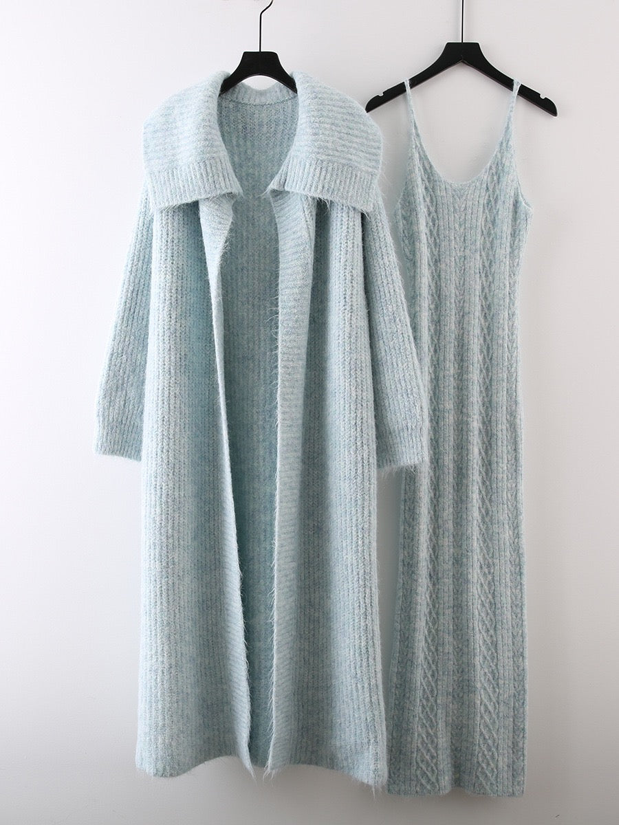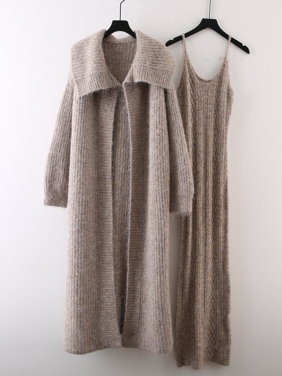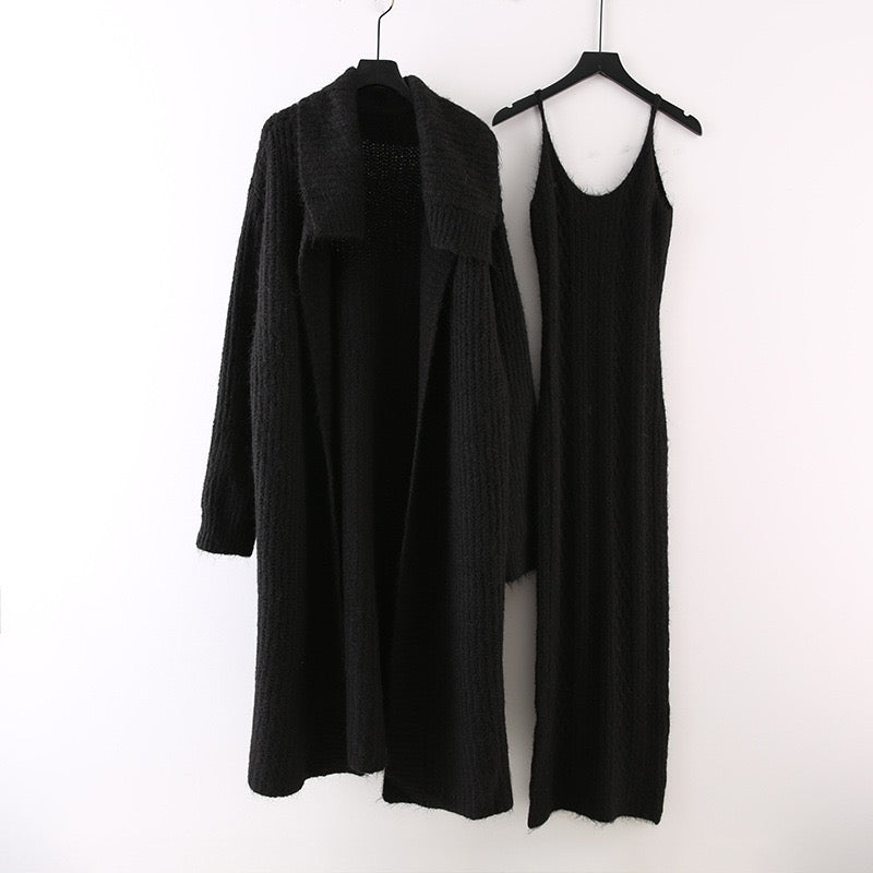 Chic, cozy, and effortlessly elegant — this 2 piece knit set includes a long fuzzy knit cardigan coat and a matching spaghetti strap maxi dress. Crafted from a soft, plush knit fabric, it offers warmth without sacrificing style, making it perfect for cooler days and evenings out.