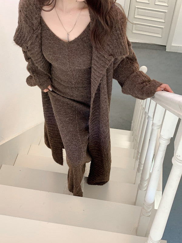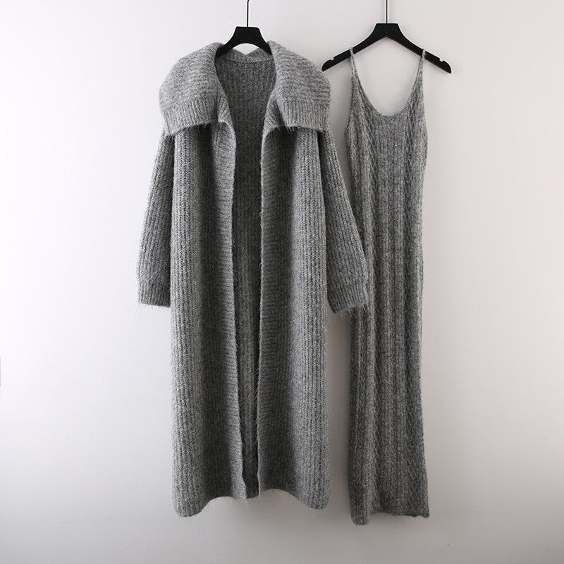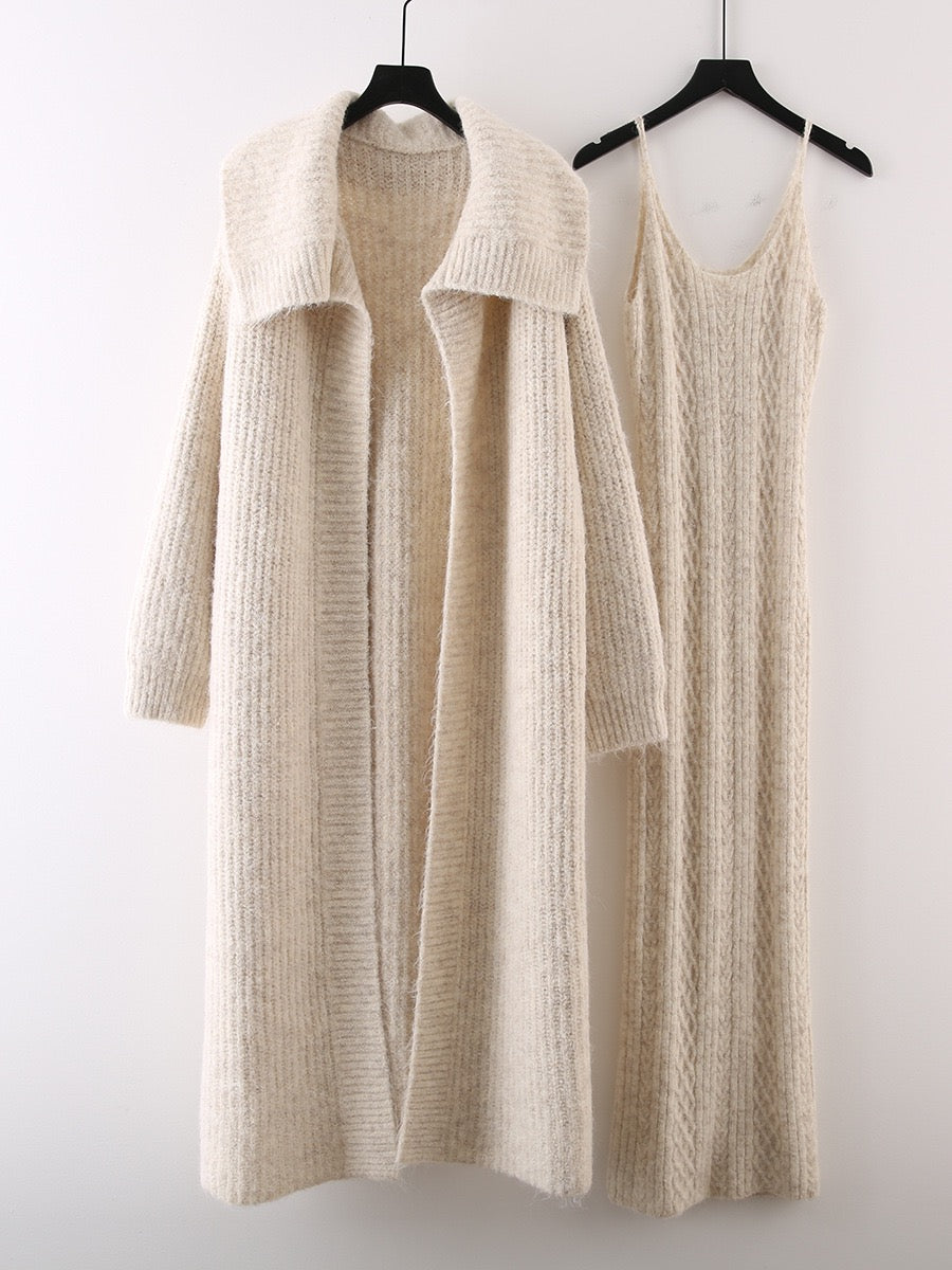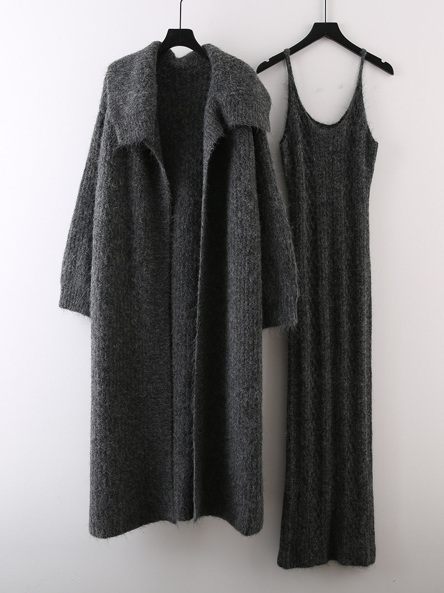 The flowy cardigan adds graceful movement, while the slim-fit dress flatters the silhouette with a minimalist, modern feel. Pair it with boots for an elevated day look or heels for a refined evening outfit.