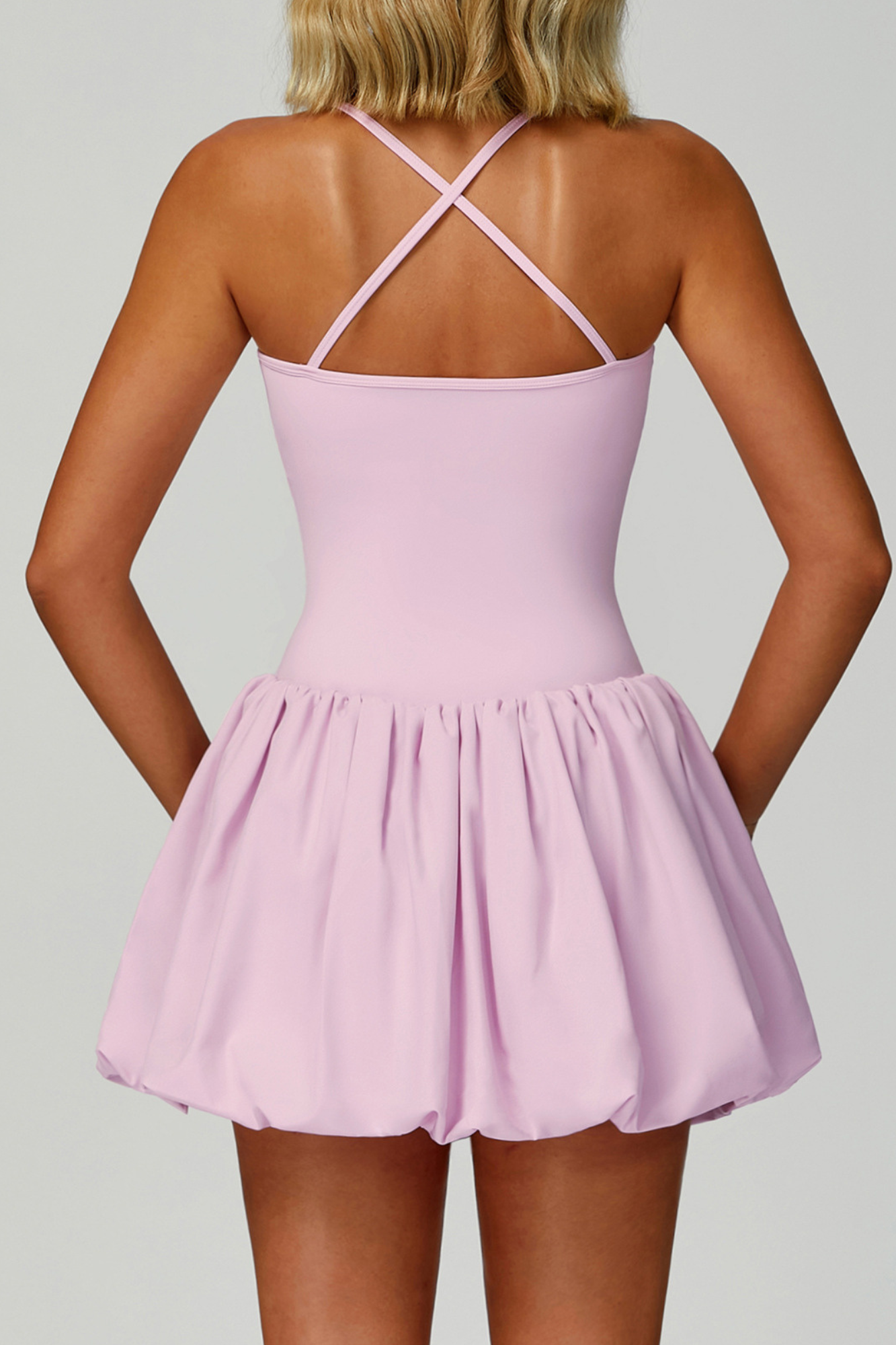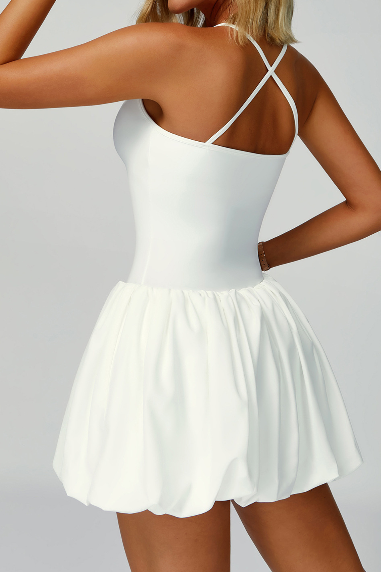 A sleek, all-black athletic dress with a flattering V‑neck and slim spaghetti straps that cross at the back for secure support. The bodice is smooth and sculpting, flowing into a lightweight, gathered skater skirt with a subtle bubble hem for easy movement. Made from soft, stretch, sweat-wicking fabric, it’s perfect for tennis, pickleball, golf, workouts, or athleisure. Dress it up with sneakers for the court or a casual day out. Features a minimal, streamlined look with a stay-put crossback design and a comfortable, breathable fit.