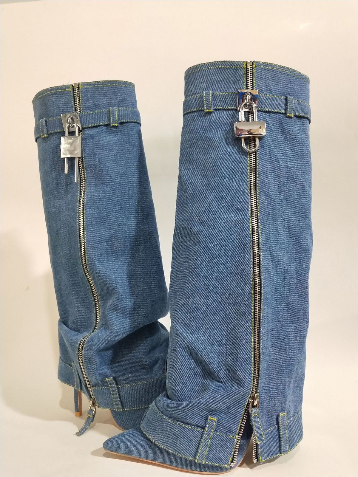 Turn heads with these statement denim knee-high boots, designed to blend casual edge with high-fashion allure. Crafted from premium denim fabric, they feature a sharp pointed toe, sleek stiletto heel, and bold exposed zipper detailing that adds a touch of modern street-style glamour. The structured shaft and fold-over cuff finish enhance the silhouette, offering a flattering fit that pairs effortlessly with dresses, skirts, or skinny jeans. Perfect for day-to-night styling, these boots redefine denim chic with a runway-ready attitude.