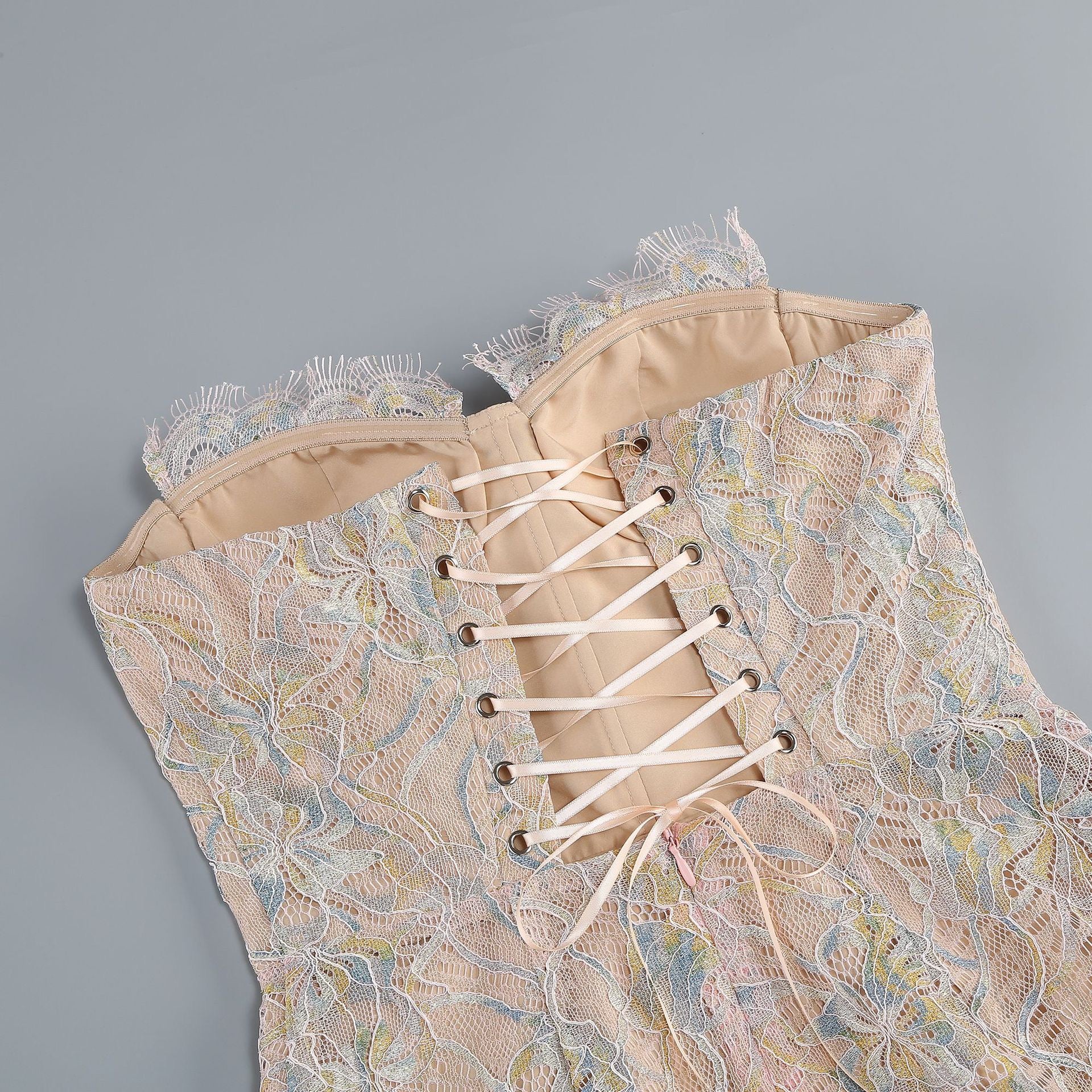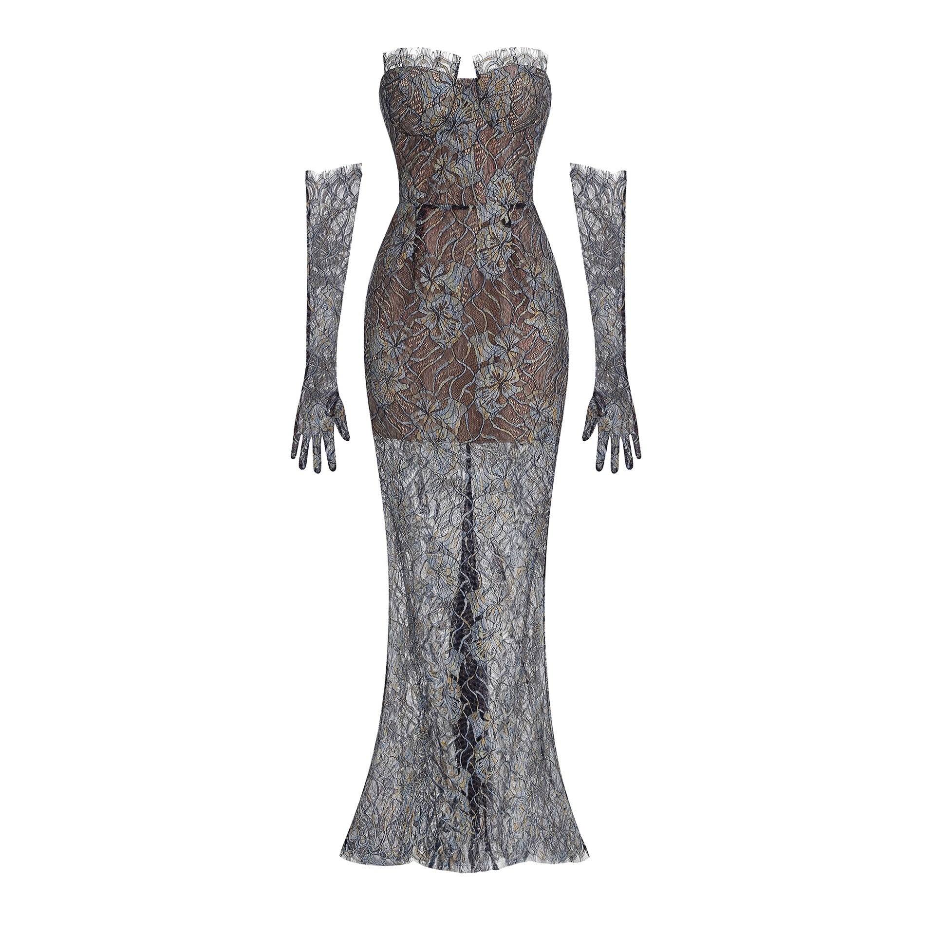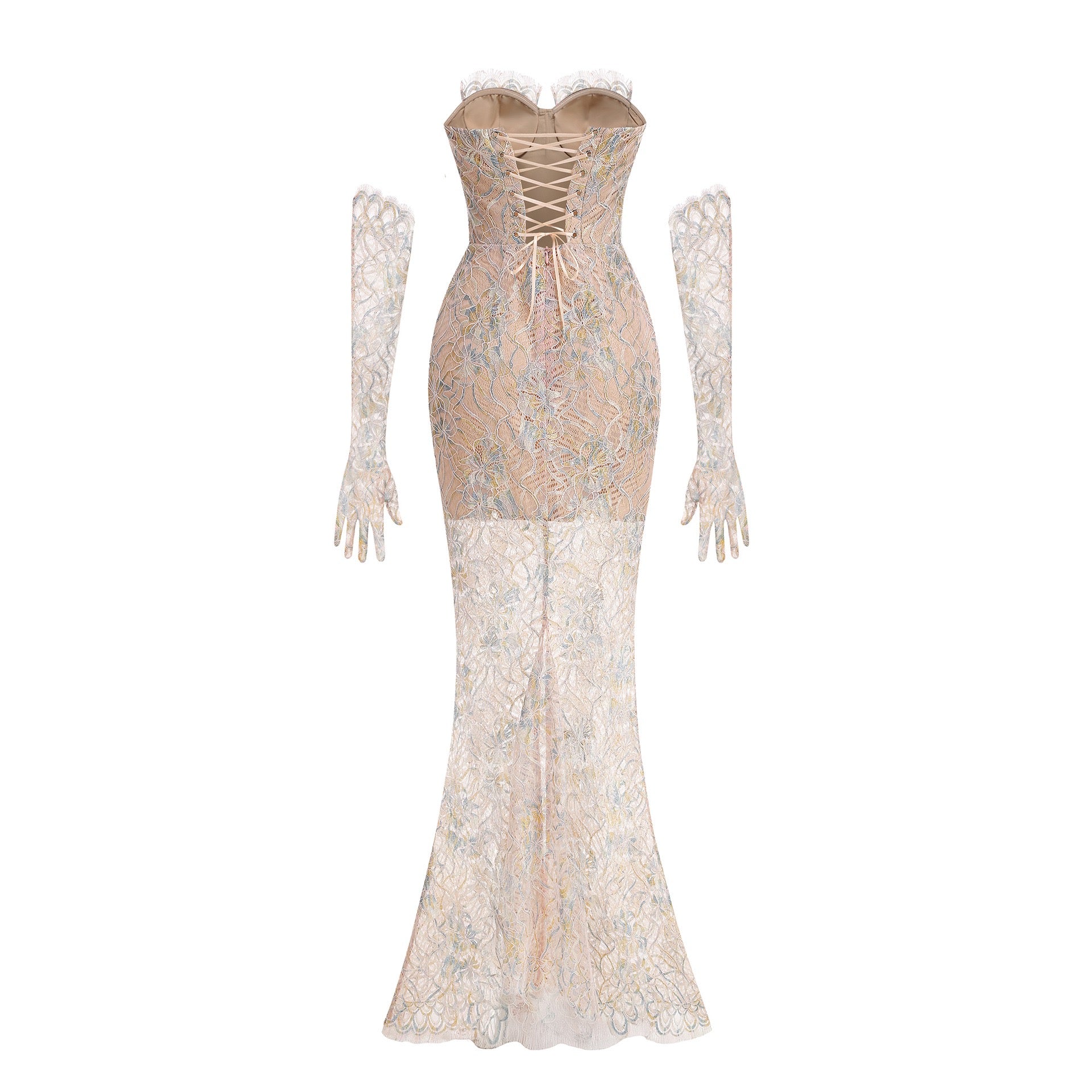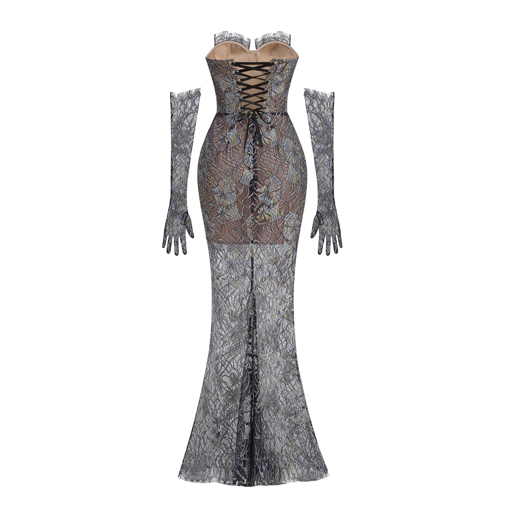 Elevate your evening look with this show-stopping black lace corset gown. Designed with a strapless sweetheart neckline and sheer floral lace overlay, this long fishtail silhouette features a built-in nude lining, delicate scalloped trim, and dramatic lace-up back detail. Comes complete with matching lace gloves for a glamorous, coordinated finish. Perfect for red carpet moments, galas, or upscale soirées.