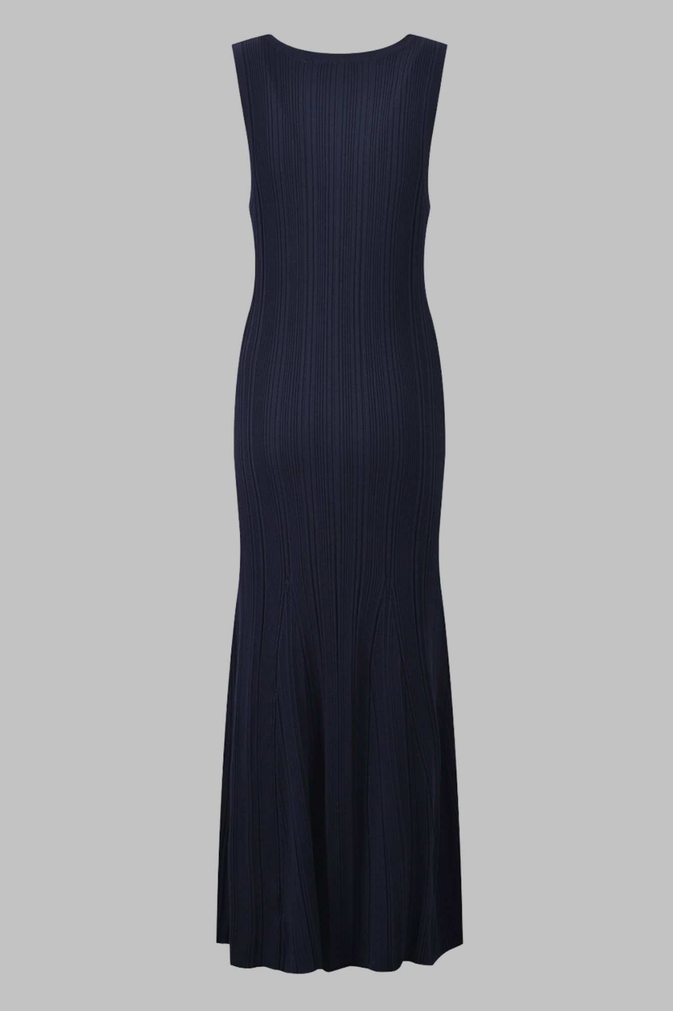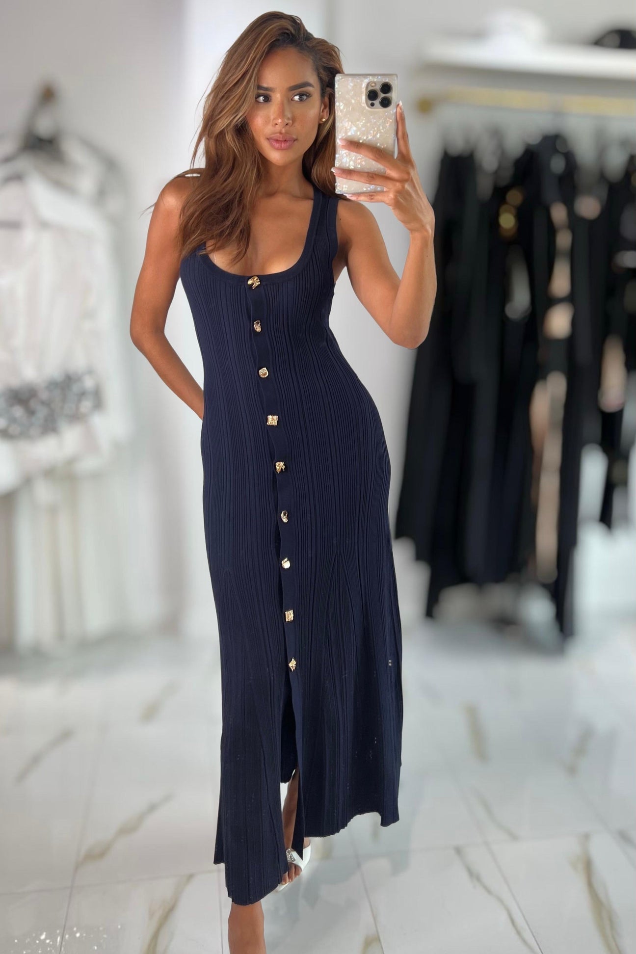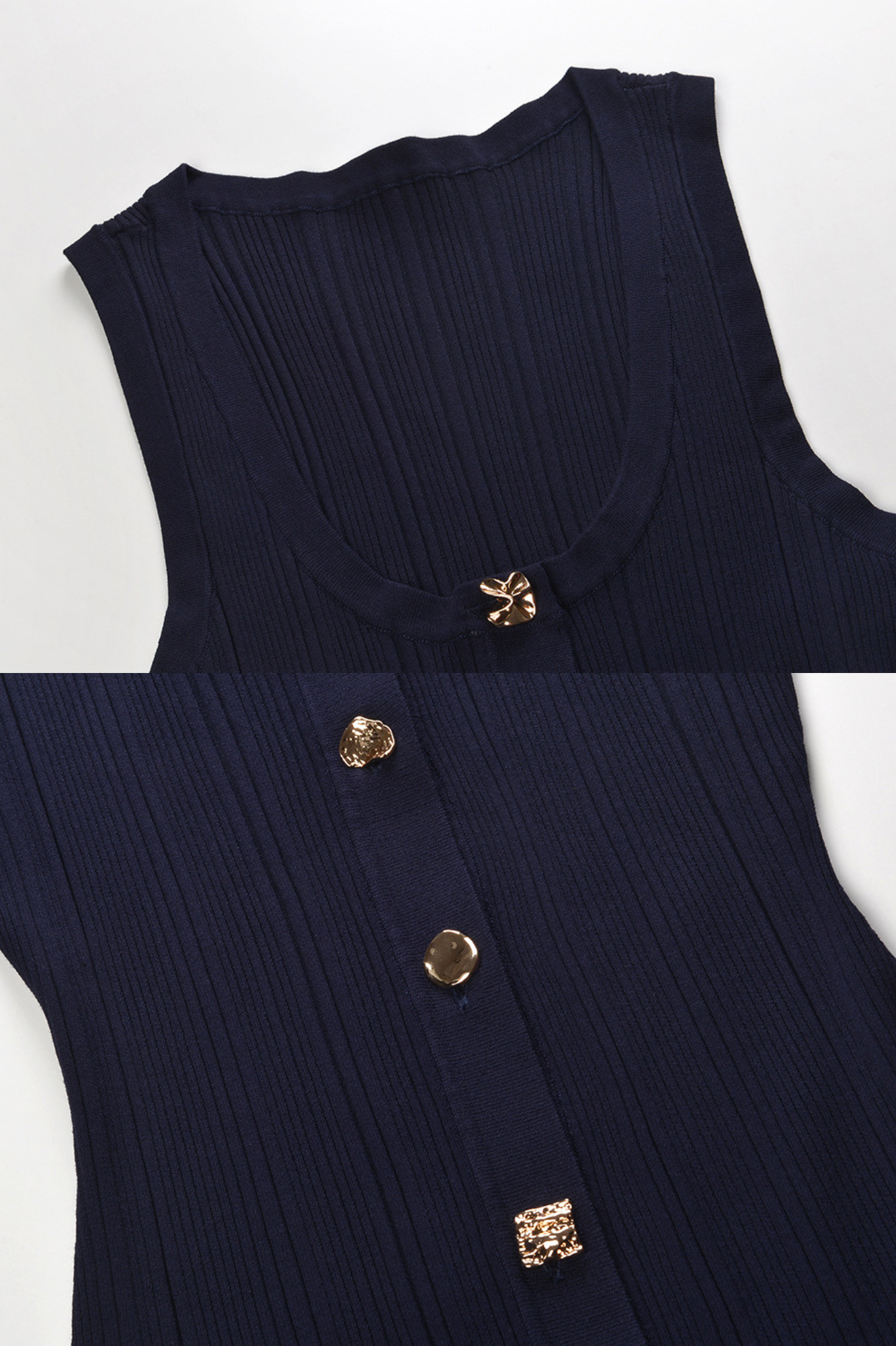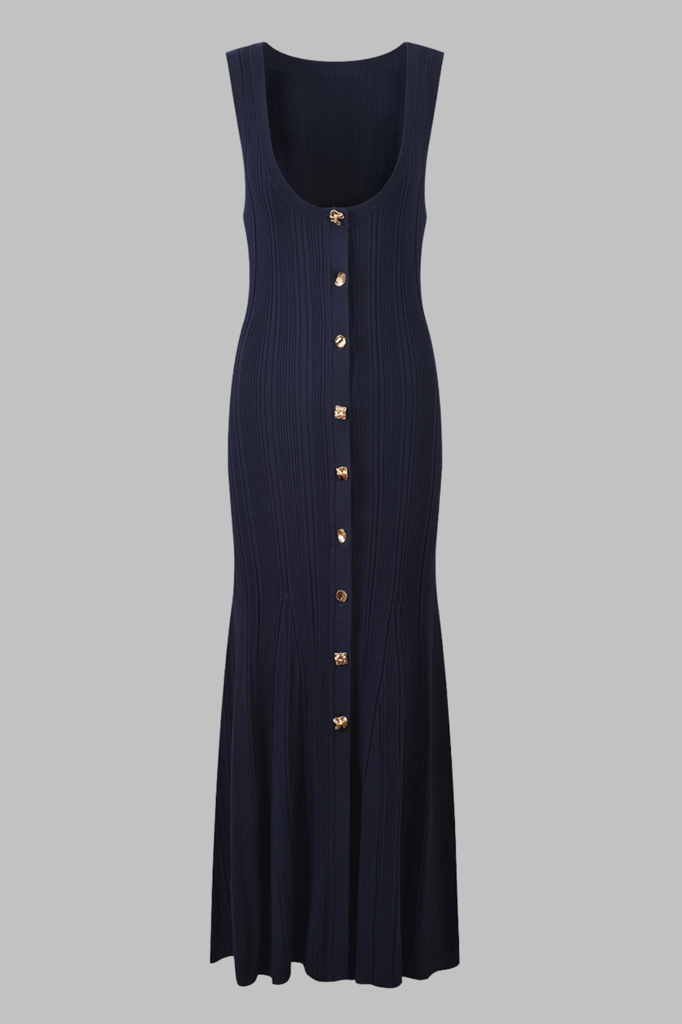 Crafted from a soft, stretchy ribbed knit, this sleeveless maxi dress offers a refined yet effortless silhouette. The deep U-neckline flatters the collarbone, while the slim-fit bodice gently hugs the waist before flowing into a graceful flared hem. Featuring a full-length gold button front for a touch of luxe and versatile styling, this piece moves beautifully with every step. Perfect for both daytime elegance and evening sophistication, it’s a timeless wardrobe essential.