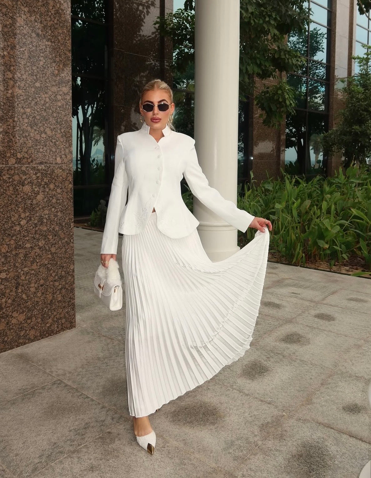Exude sophistication with this elegant blazer and pleated skirt set, perfect for formal occasions, business events, or refined evening wear. The structured blazer features a curved asymmetric button-up front, delicate embroidery detailing, and a cinched waist for a flattering, tailored fit. The accompanying flowing pleated maxi skirt adds a graceful, feminine touch, creating a timeless and polished look.