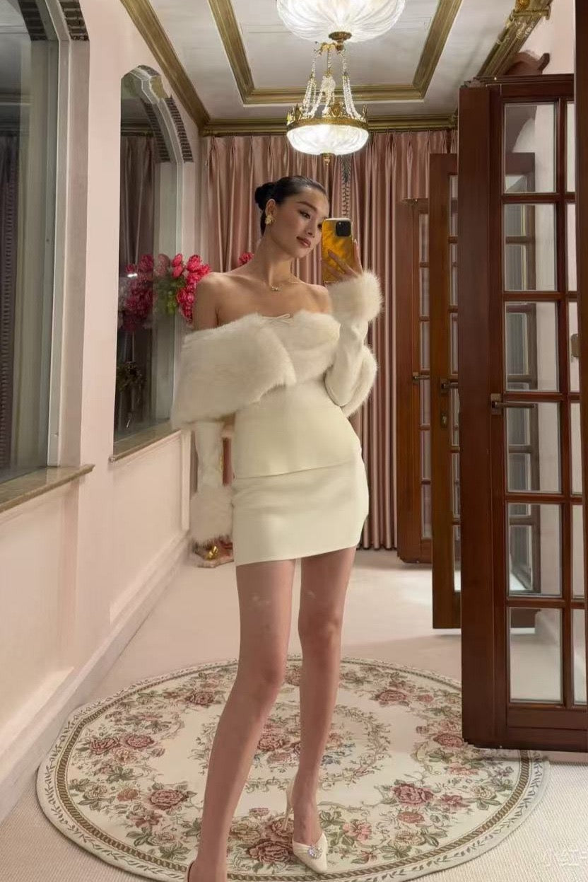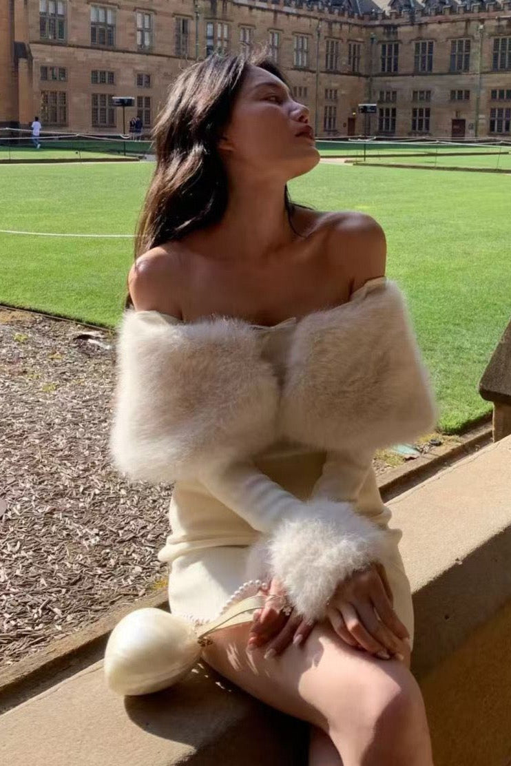 Elevate your look with this chic two-piece set featuring an off-shoulder faux fur top and a matching mini skirt. Designed for a flattering fit, this set blends elegance with modern glamour—perfect for nights out, special occasions, or stylish events.
