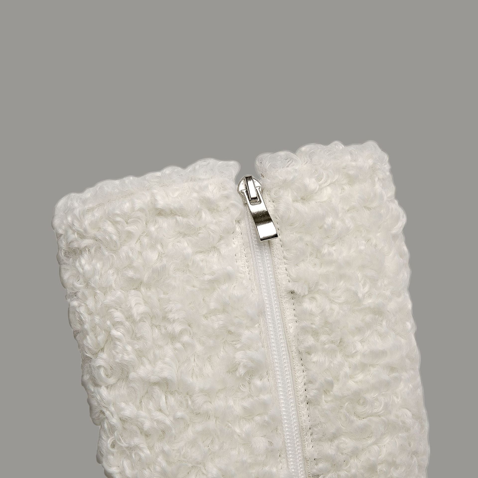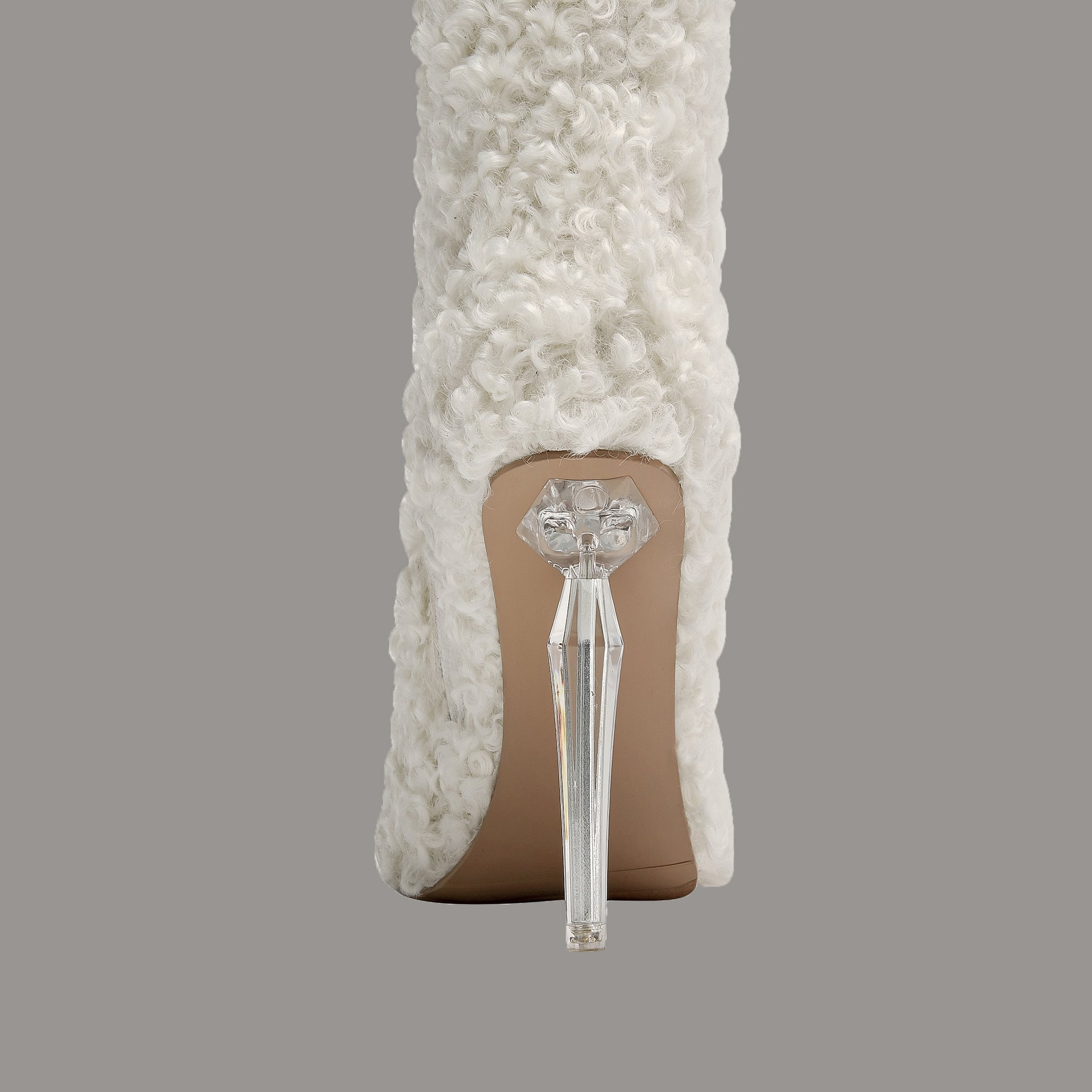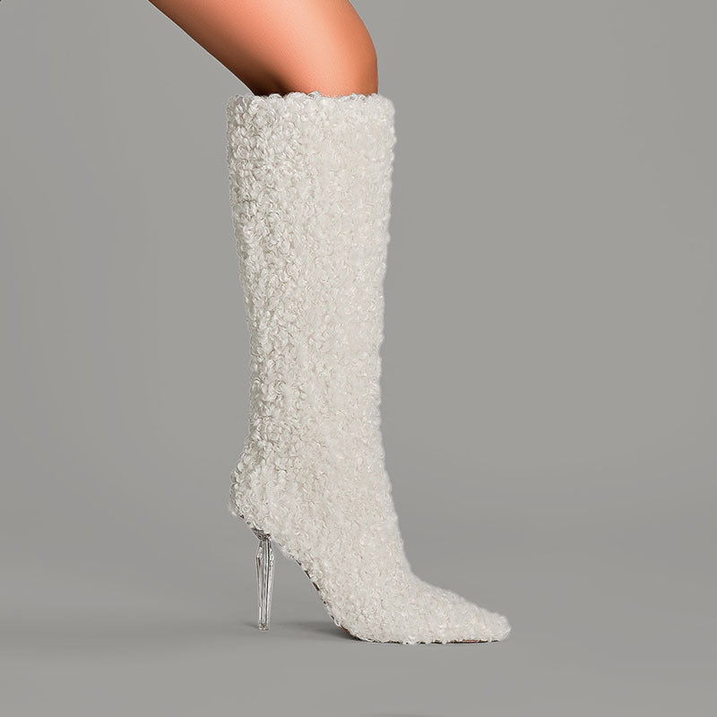 Add cozy elegance to your winter style with these faux shearling knee-high boots. Designed with soft curly texture and a sculpted clear stiletto heel, they bring warmth and modern edge together. Perfect for cold-weather outfits, these boots pair beautifully with knits, coats, and dresses for a chic seasonal statement.