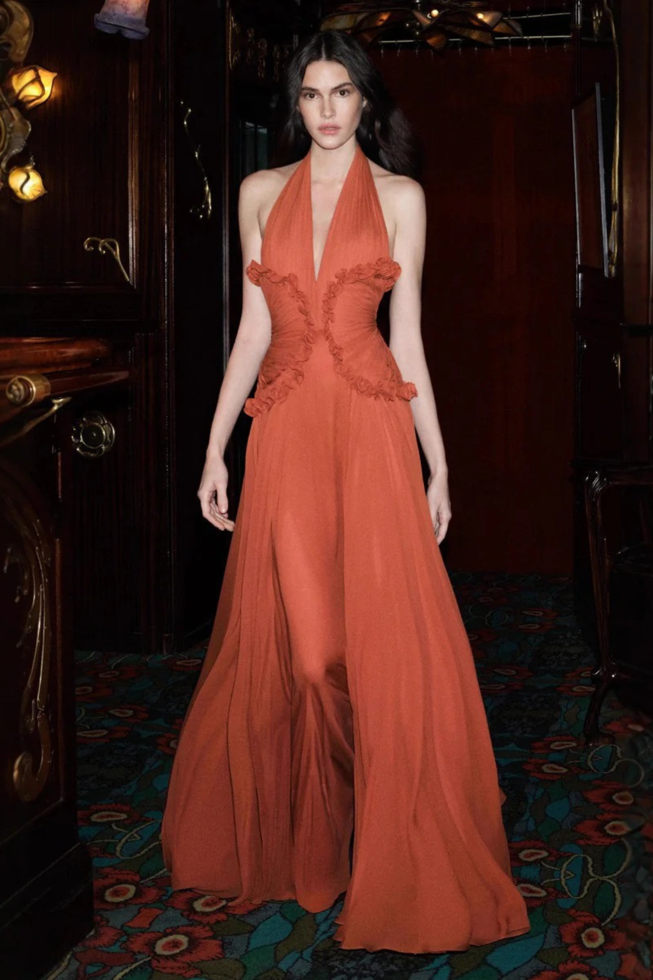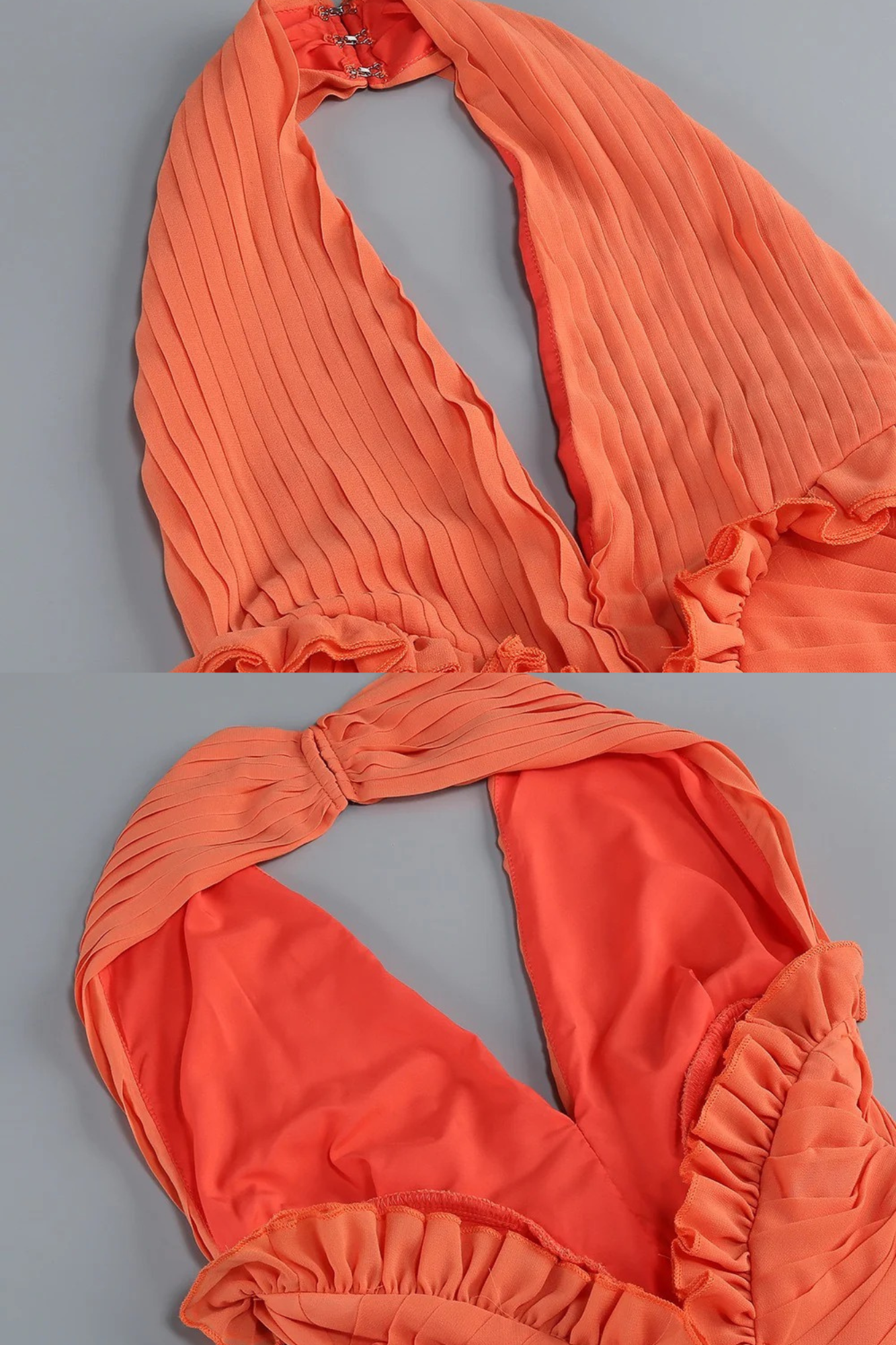 Graceful and romantic, this halter neck chiffon long dress is designed to captivate with its elegant silhouette and fluid movement. The deep V neckline enhances femininity, while the ruffled waist detailing adds a sculpted, flattering shape that accentuates the figure beautifully. Crafted from lightweight, breathable chiffon, the flowing full-length skirt drapes effortlessly with each step, creating an ethereal look. Perfect for evening events, formal occasions, or elegant celebrations, this dress combines timeless allure with modern sophistication.