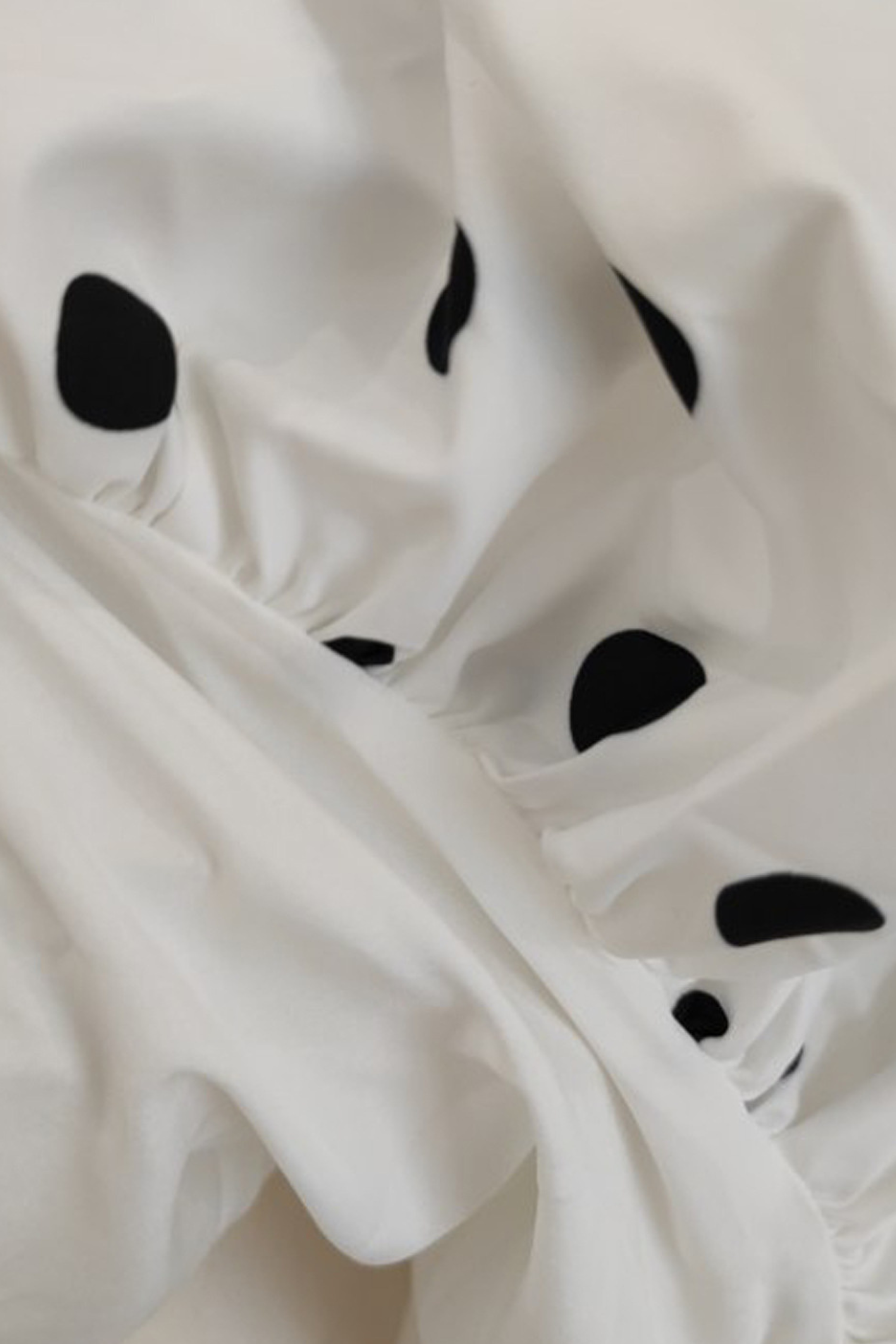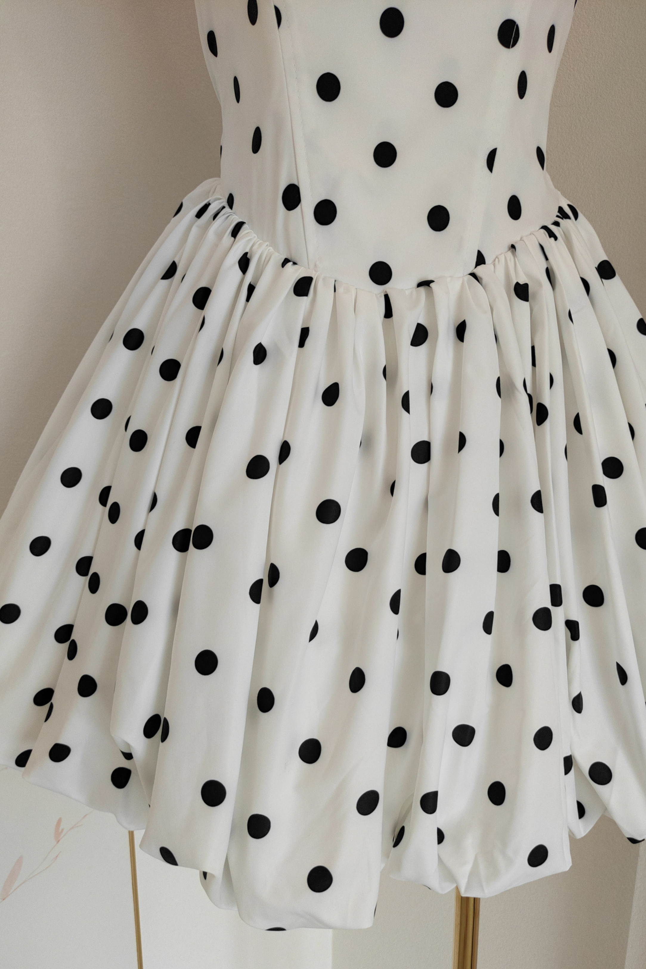retro charm with this polka dot puff mini dress, featuring a structured halter neck and a flattering square neckline. The fitted bodice is supported by a shirred lace-up back for an adjustable, snug fit. The voluminous puffball skirt is enhanced with an inner lining that adds shape and bounce to every step. Crafted in a smooth, breathable fabric, this dress ties elegantly at the neck and comes with a clean white inner layer for versatile styling. Available in two options: classic black polka dots or solid white.