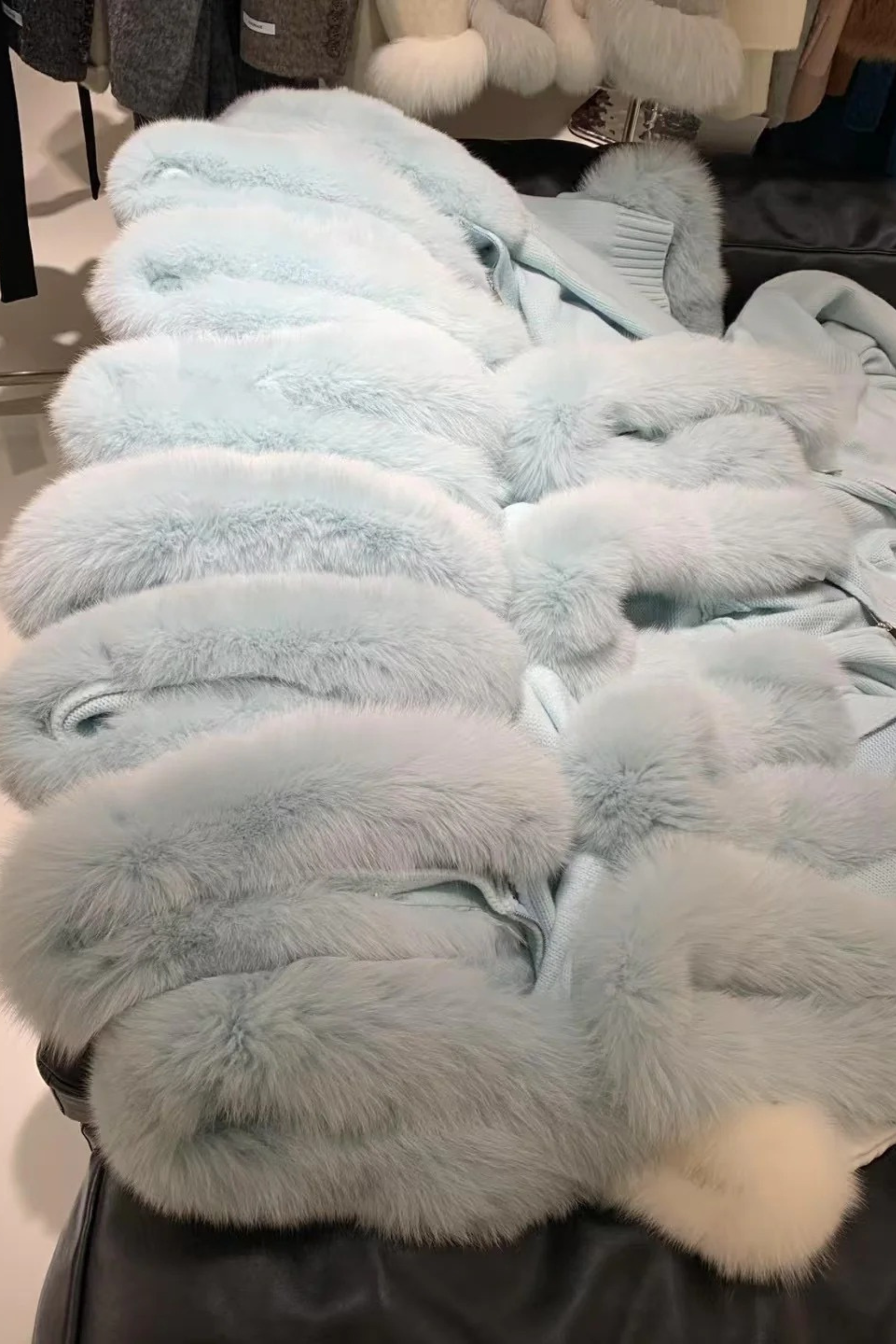 Cozy and stylish knitted zip-up jacket featuring a plush faux fox fur trim along the hood. Designed for warmth and elegance, it combines a soft knit texture with a luxurious look. Perfect for layering over casual or dressy outfits during the colder months.