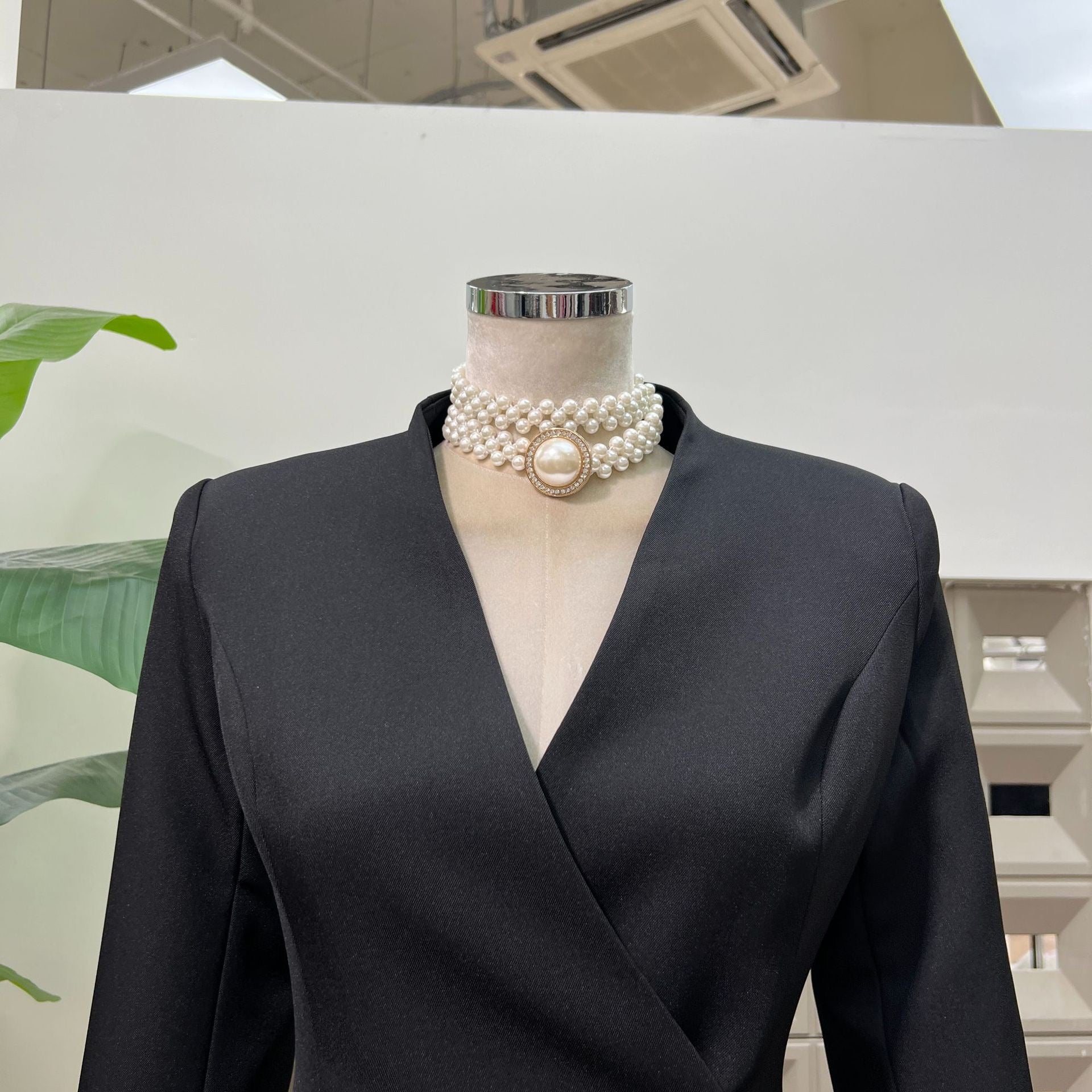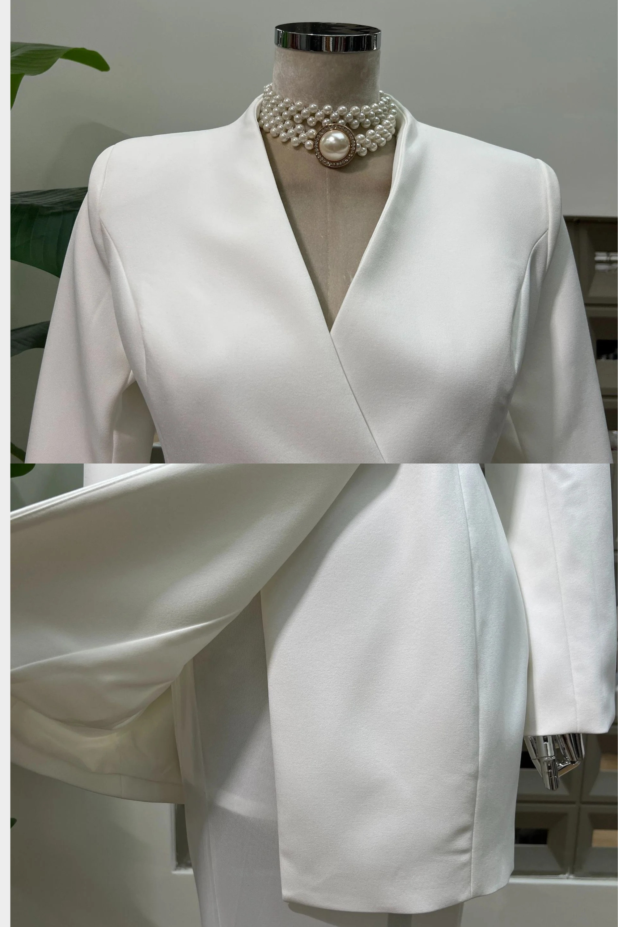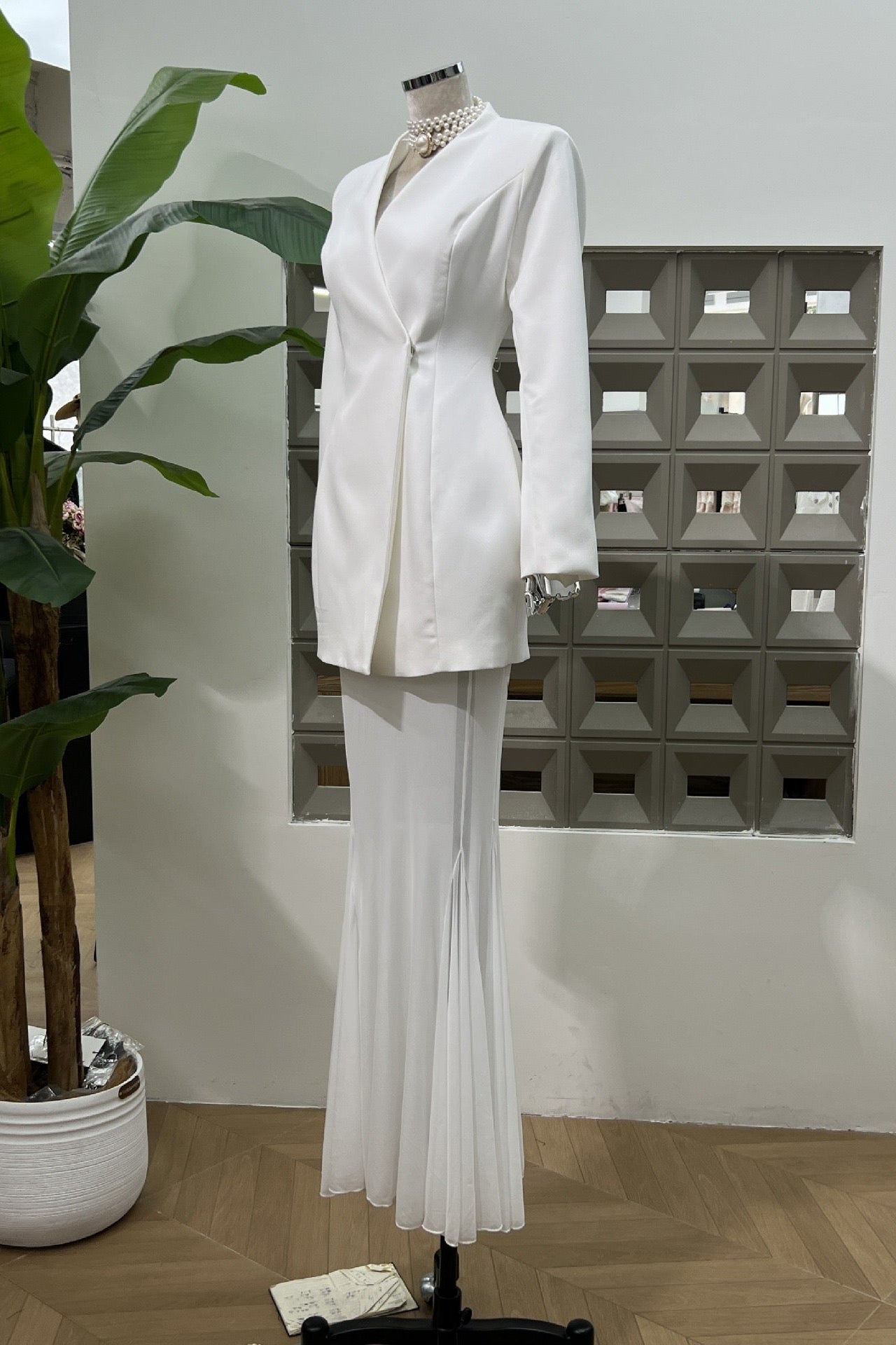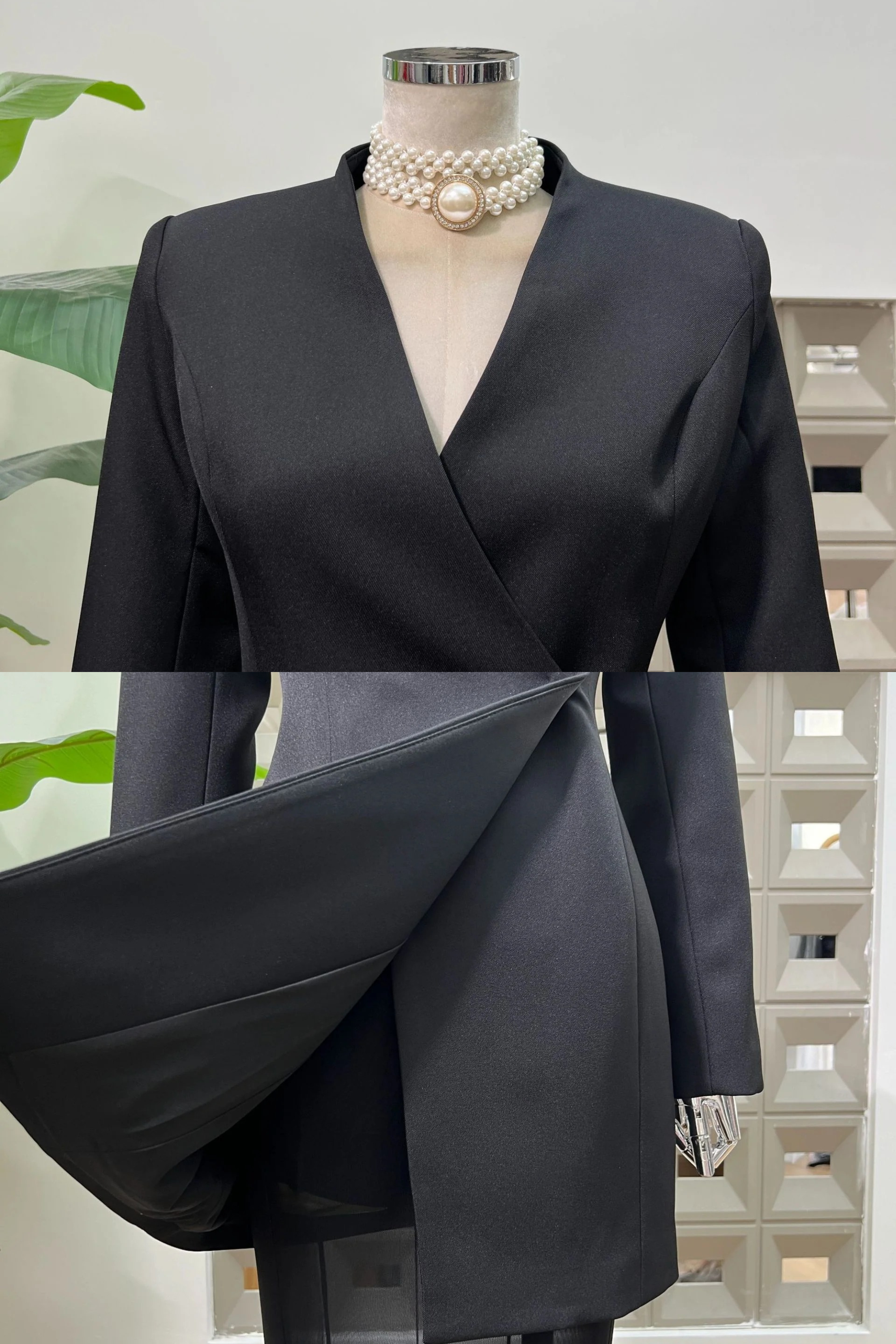 This elegant two-piece set combines sharp tailoring with soft movement for a timeless, feminine look. The top features a long-sleeve structured blazer design, crafted from smooth premium crepe material that holds its shape while giving a clean, refined silhouette. The front has a minimal wrap-style structure with precise stitching that enhances the waist and elongates the body.