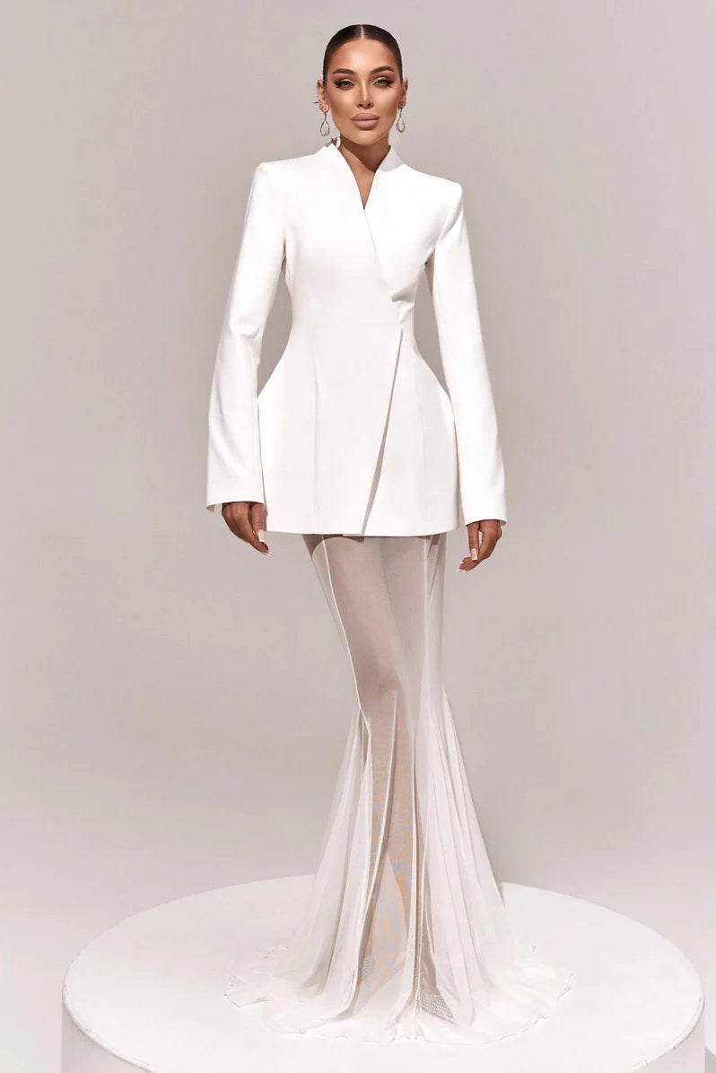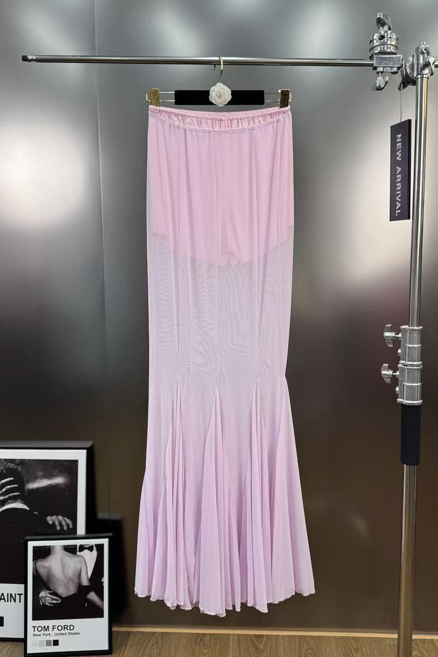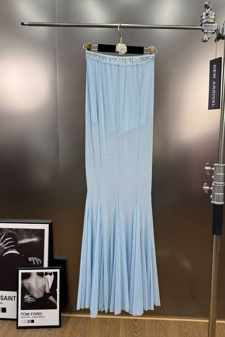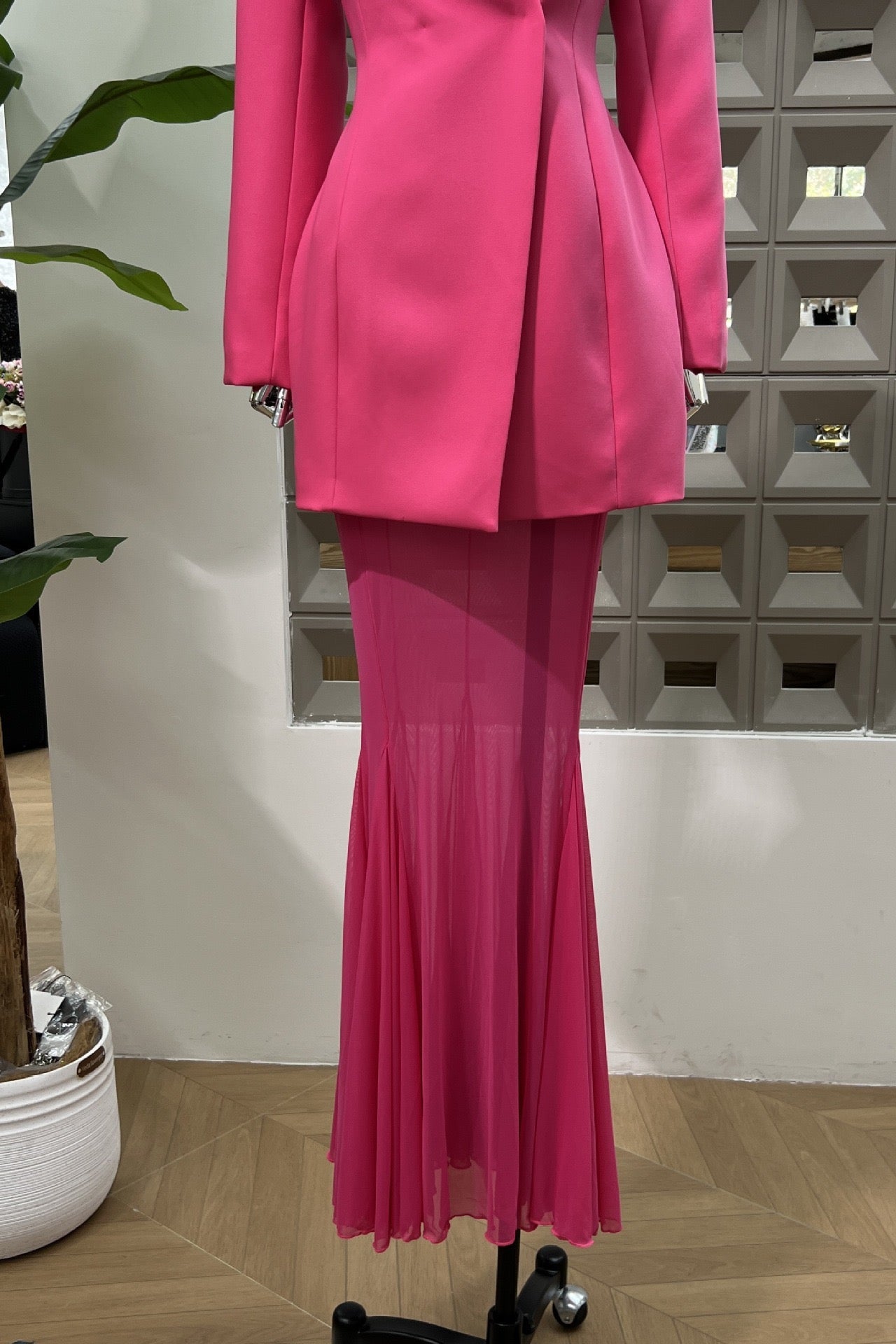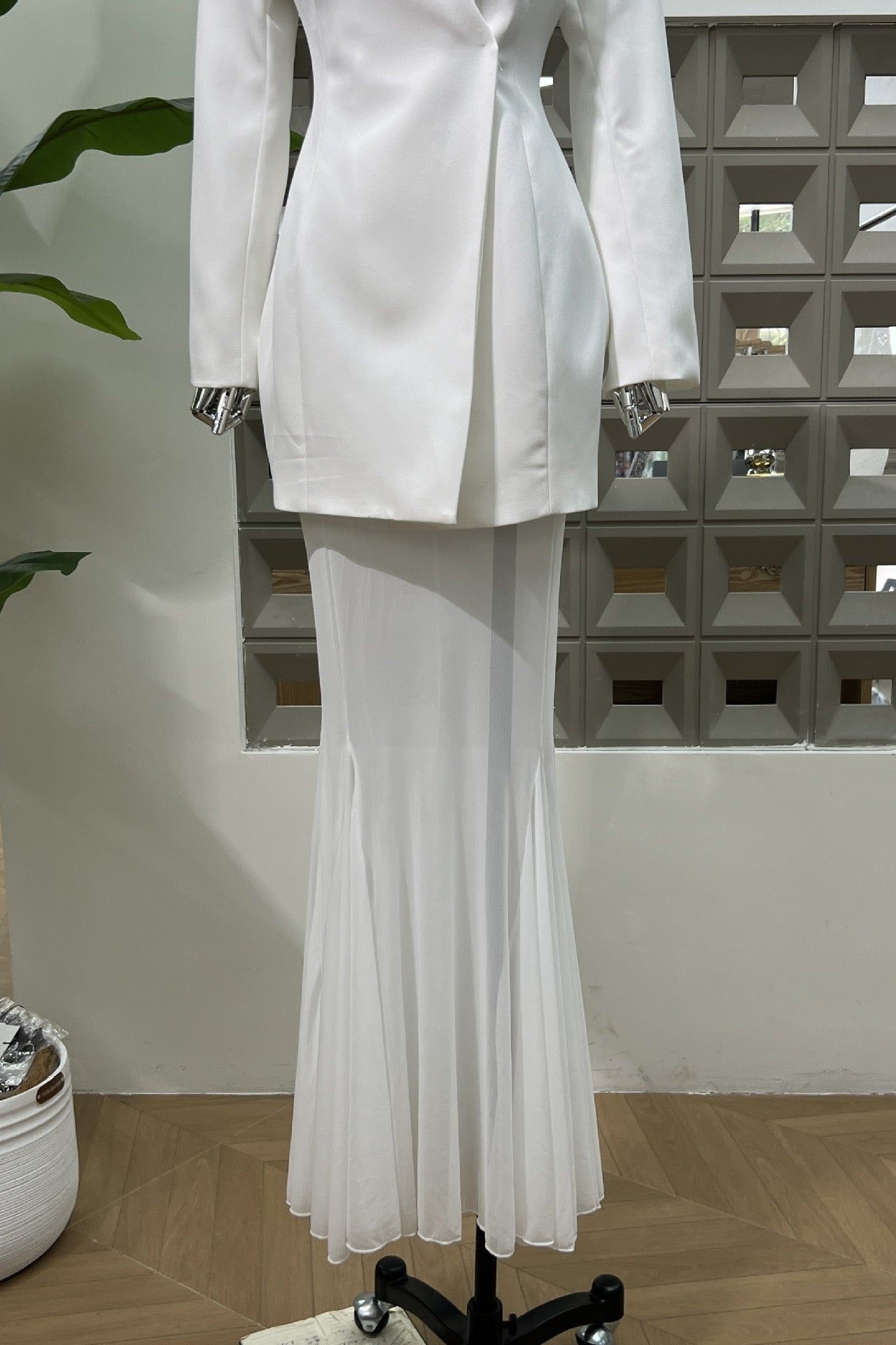 The matching skirt is made from lightweight pleated mesh, designed with a soft flow and gentle flare that adds fluidity to the outfit. It includes an inner lining for coverage and an elastic waistband for comfortable wear. The contrast between the blazer’s modern structure and the skirt’s airy pleats creates a balanced, polished look suitable for events, evenings, or elevated daily style.