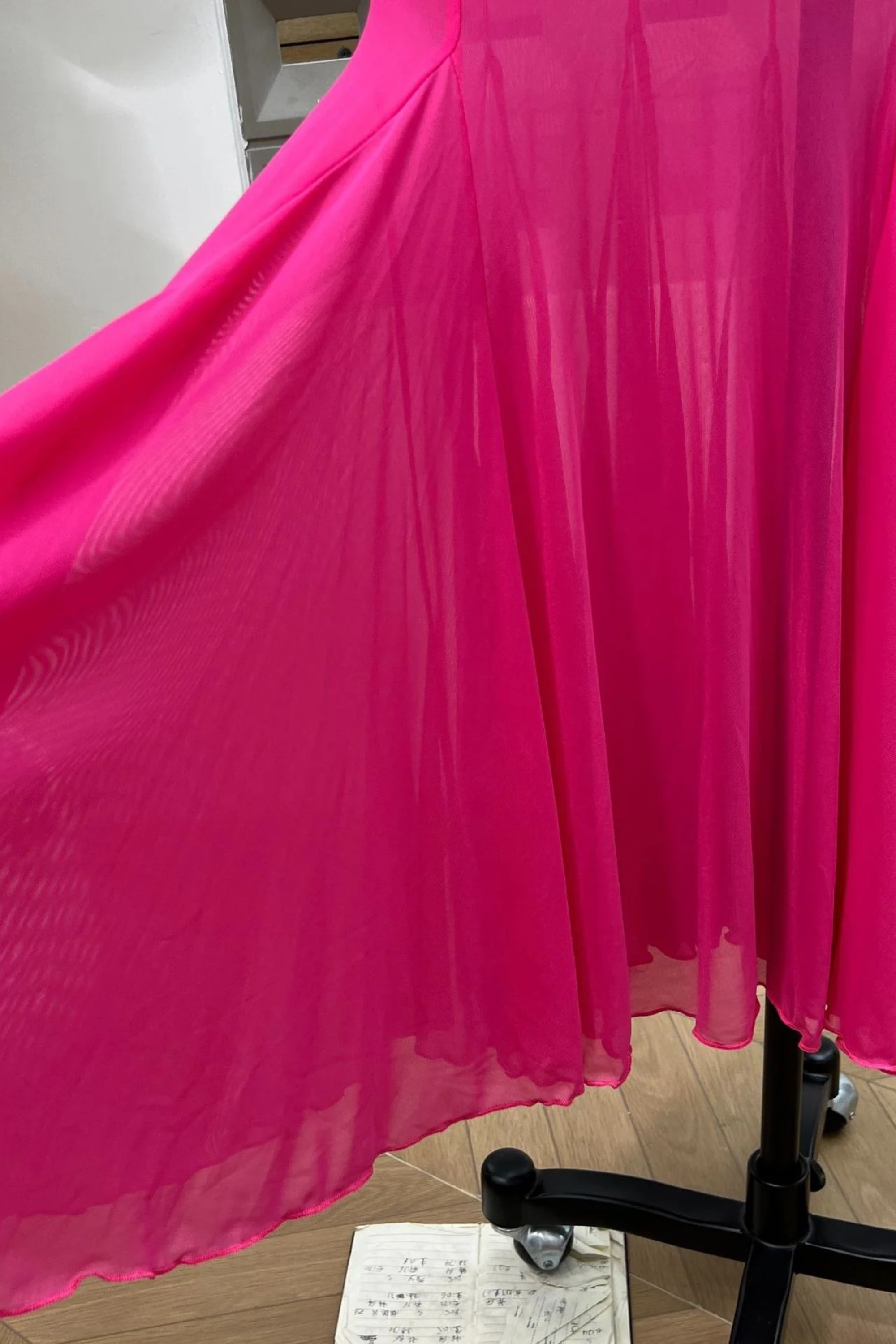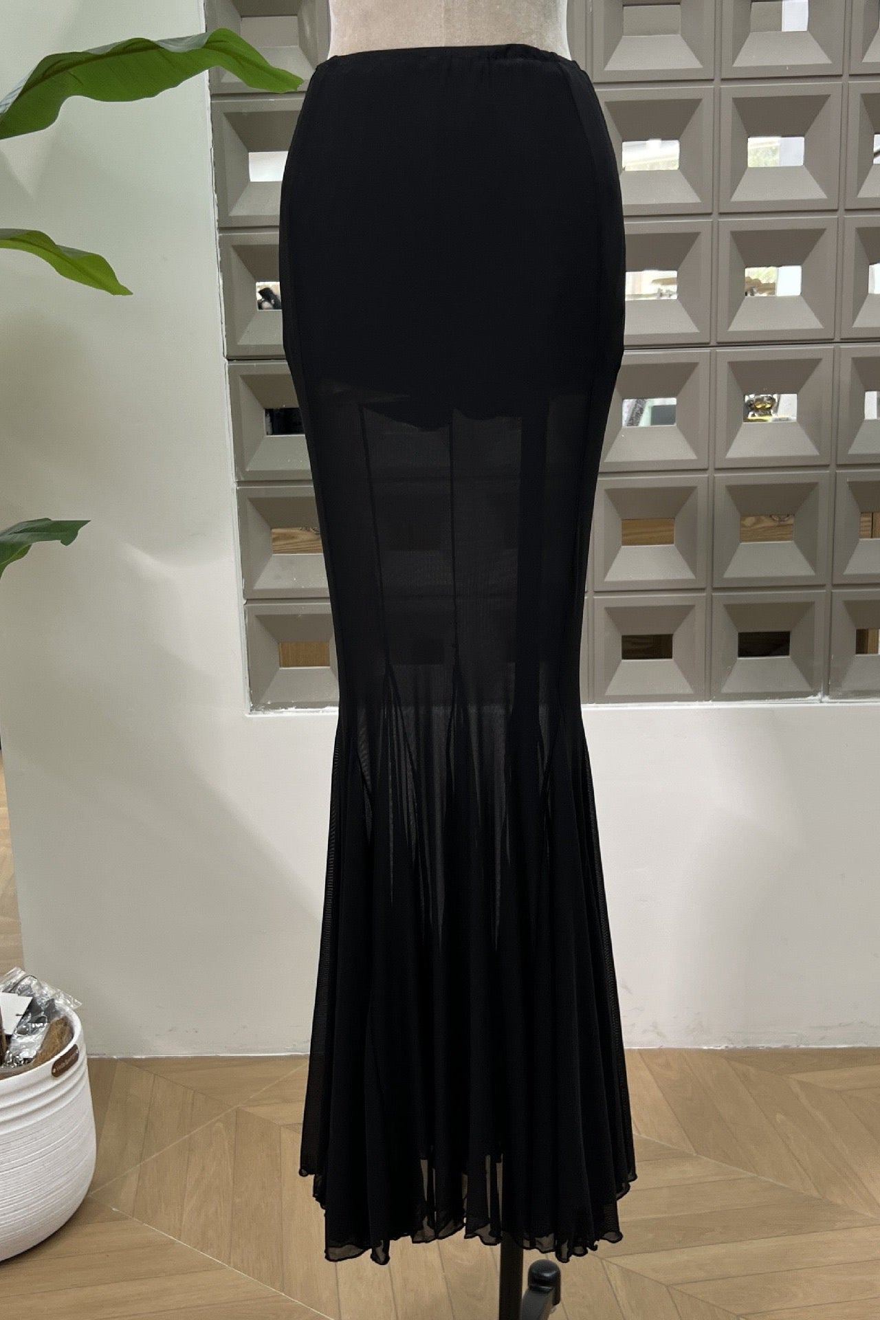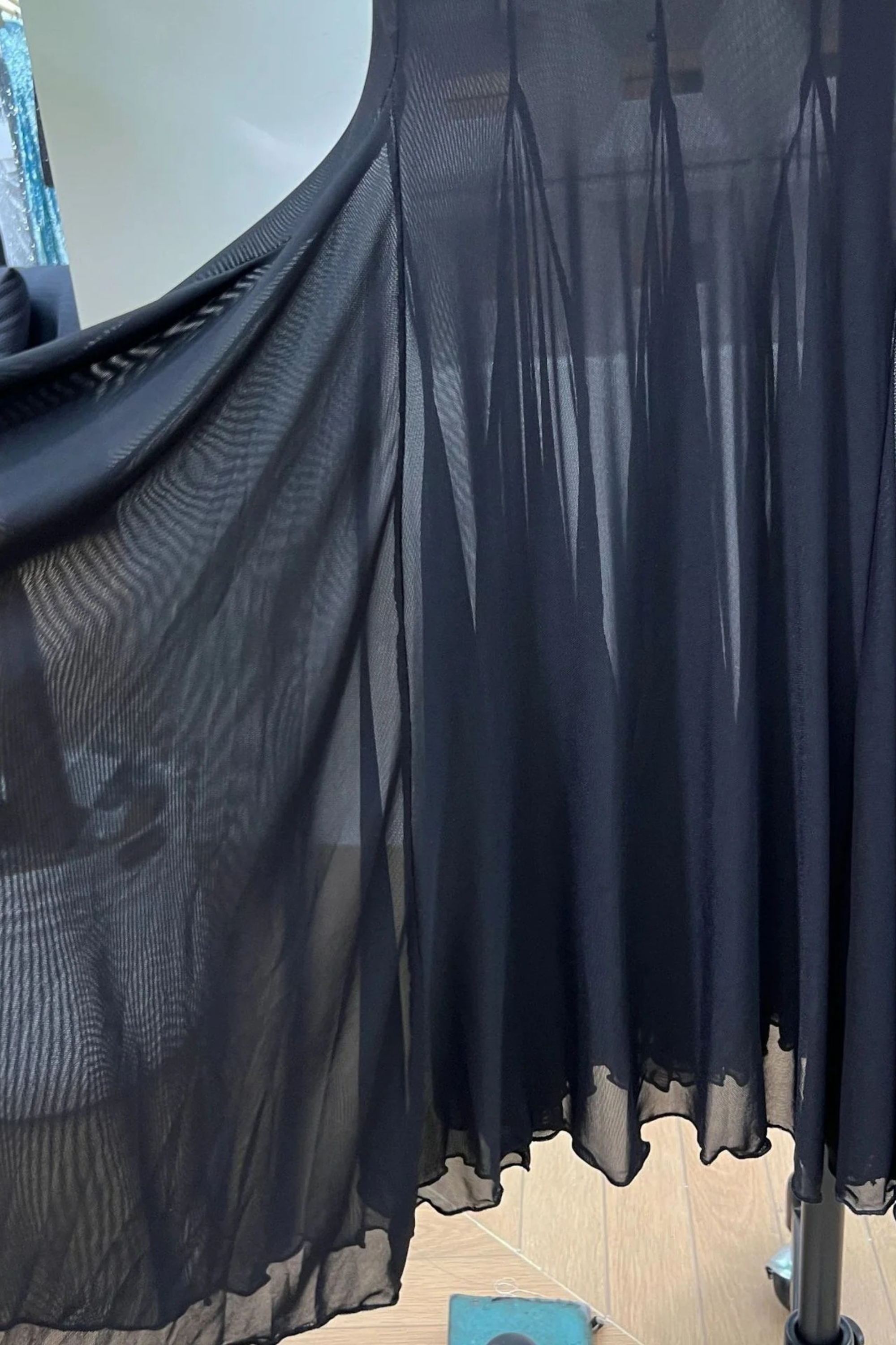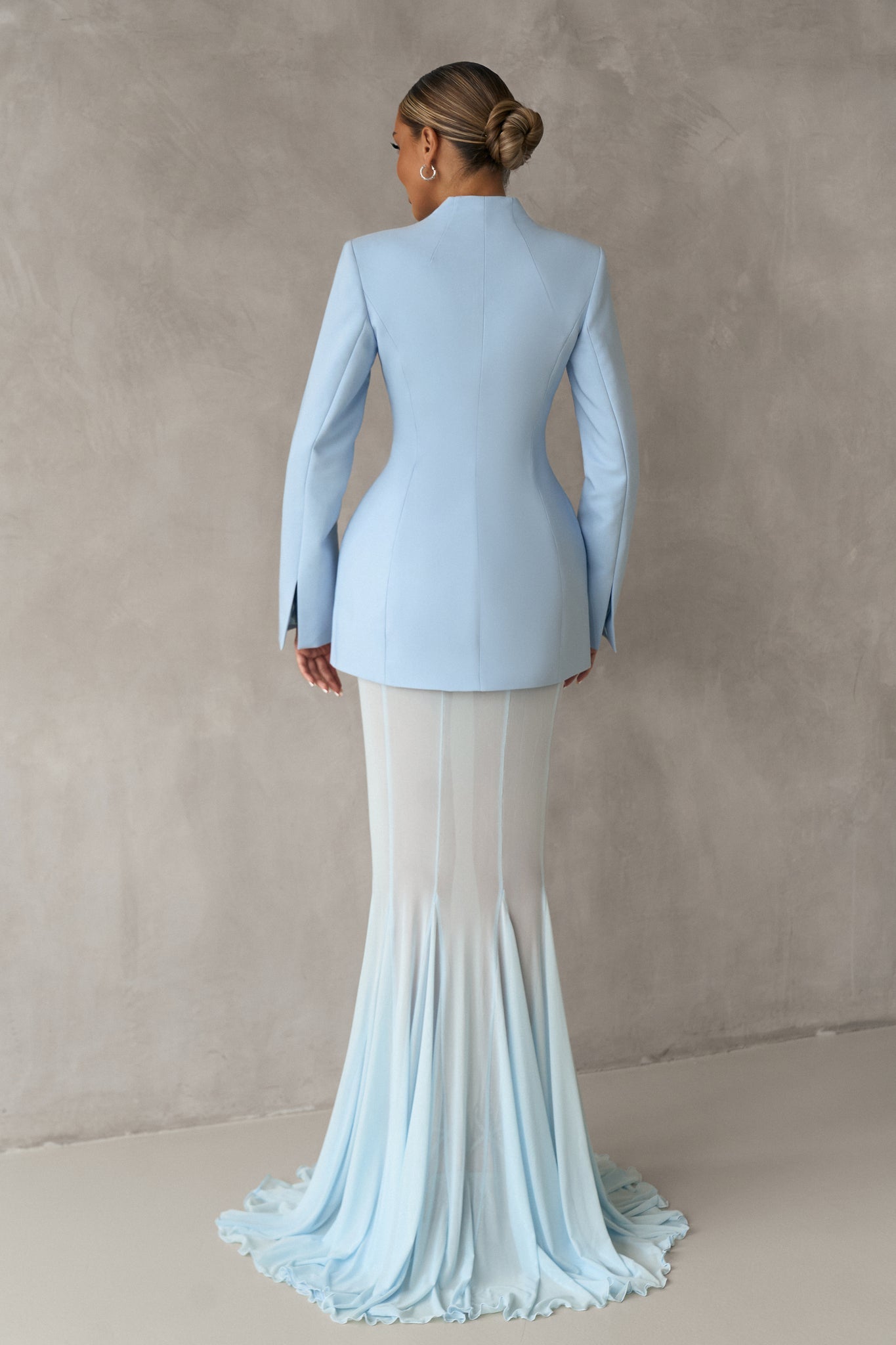The matching skirt is made from lightweight pleated mesh, designed with a soft flow and gentle flare that adds fluidity to the outfit. It includes an inner lining for coverage and an elastic waistband for comfortable wear. The contrast between the blazer’s modern structure and the skirt’s airy pleats creates a balanced, polished look suitable for events, evenings, or elevated daily style.