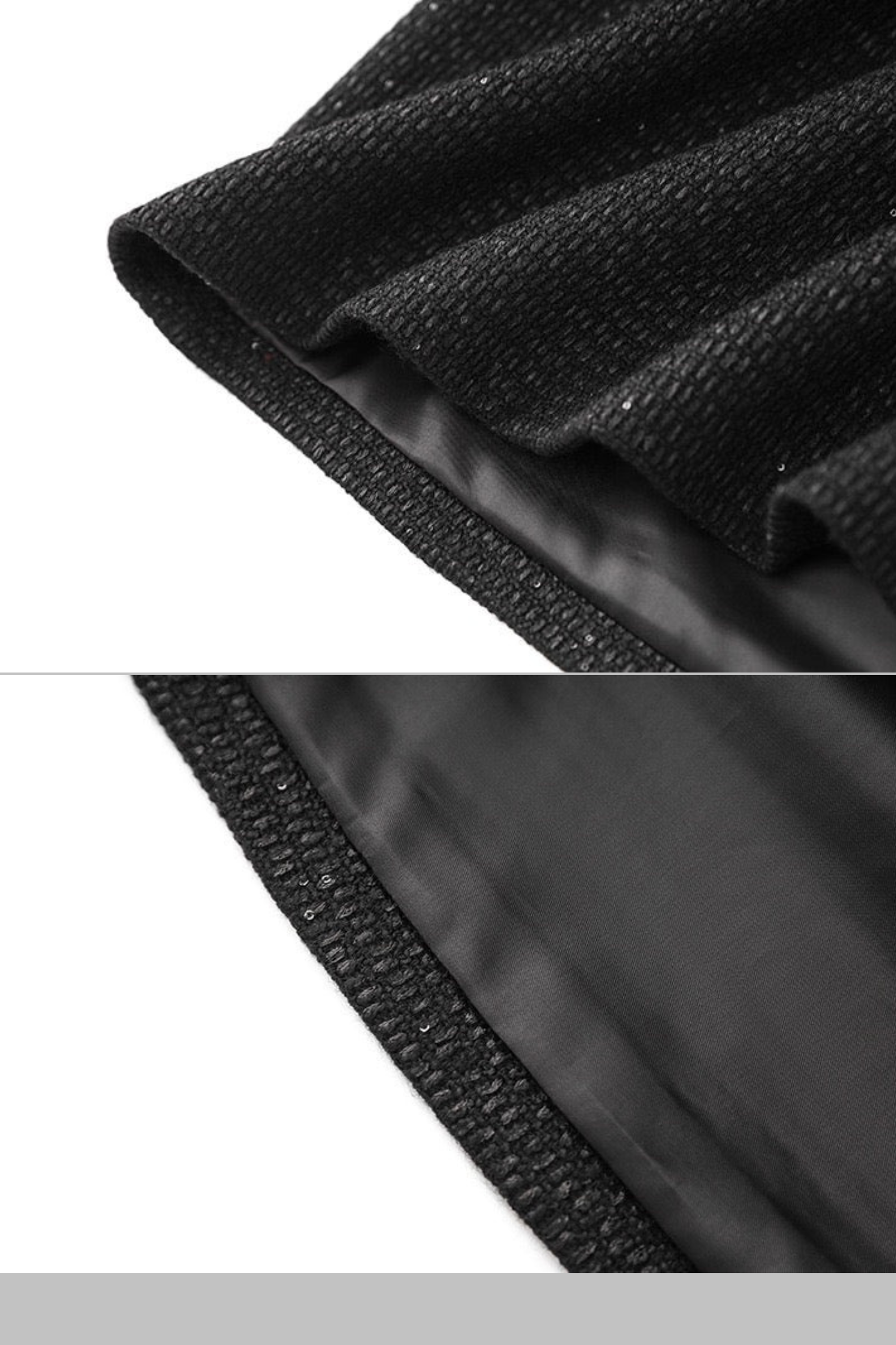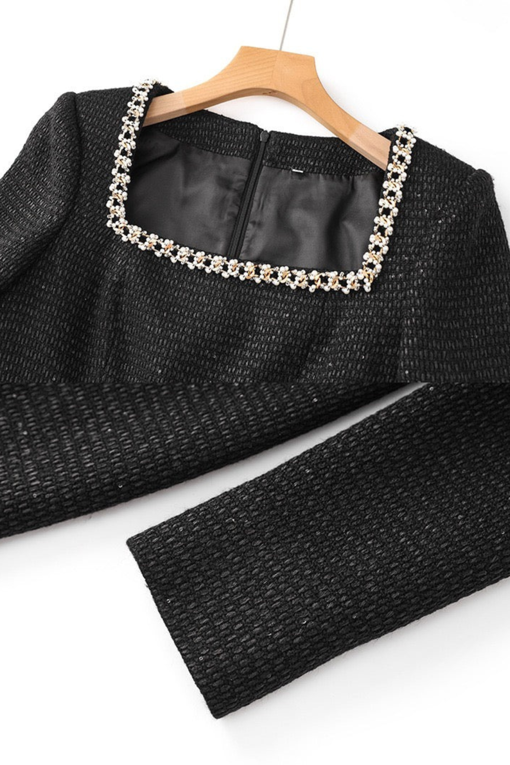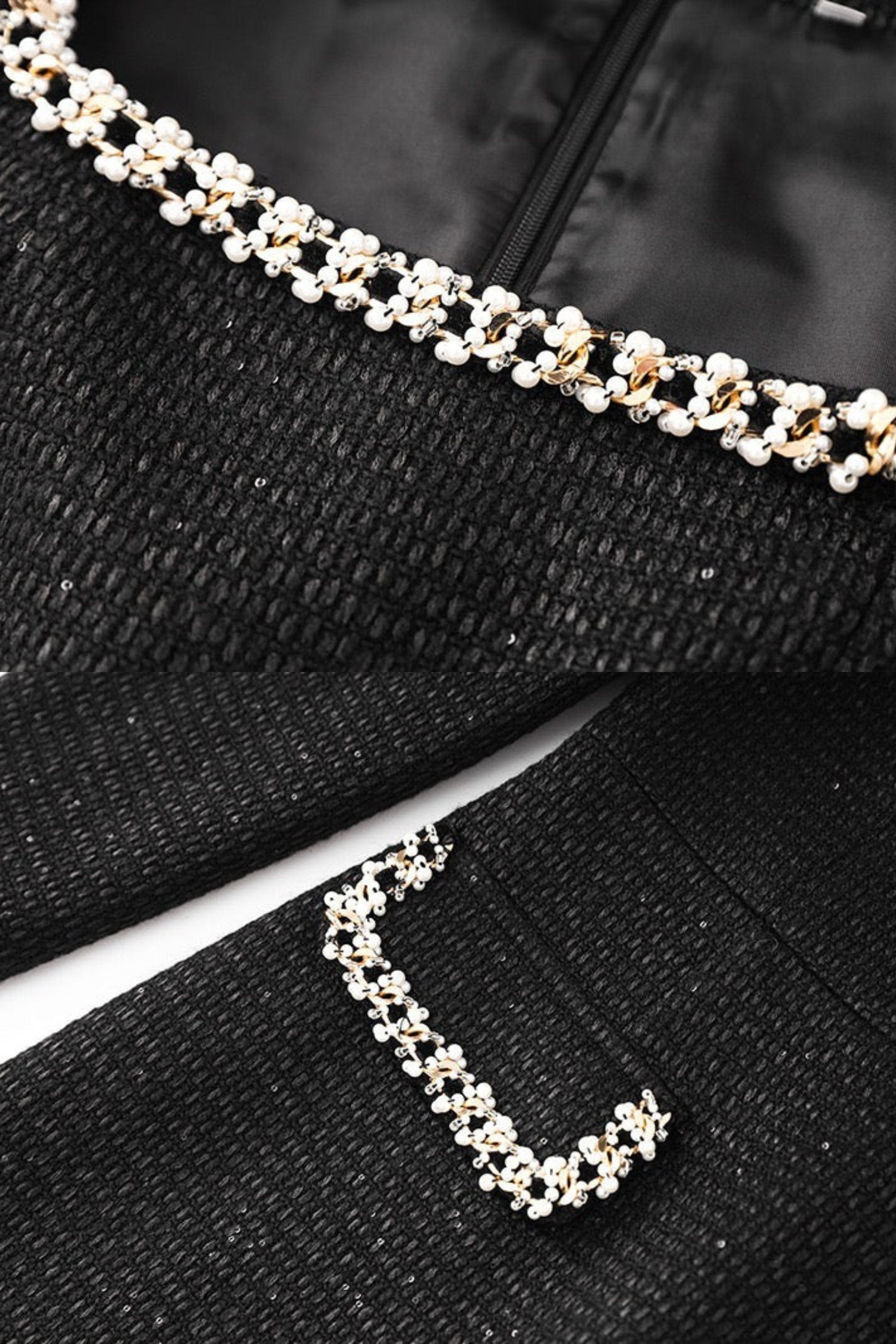 This elegant black tweed mini dress exudes timeless sophistication with its structured silhouette and refined texture. Designed with long sleeves and a flattering square neckline, it features exquisite pearl and bead trim along the collar and pocket flaps, adding a touch of luxury. The fitted waist accentuates the figure, while the hidden back zipper ensures a sleek finish. Perfect for evening gatherings, special occasions, or chic daytime looks, this dress combines classic charm with modern refinement.