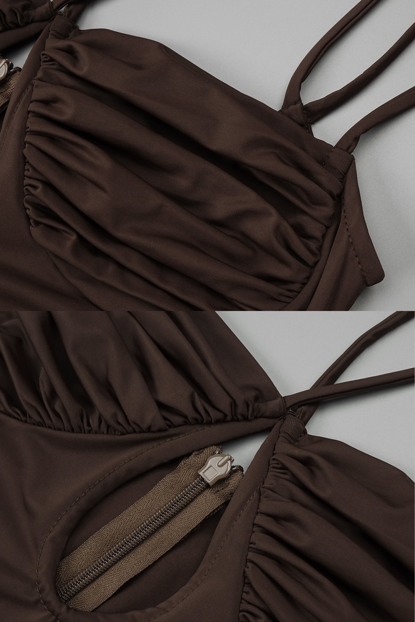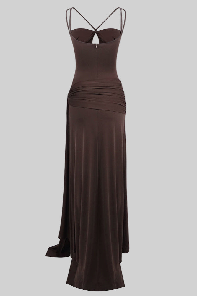 Turn every entrance into a statement with our Mocha Goddess Draped Keyhole Maxi Gown. Designed in a rich mocha-brown hue, this floor-length dress features a daring front keyhole cut-out, ruched bust detail, and double spaghetti straps that add modern allure. The waist is defined by intricate draped fabric that cascades into a side-tied sash, enhancing your silhouette while adding fluid movement. A thigh-high slit completes the look with bold sophistication. Perfect for galas, black-tie events, or any evening where glamour is a must