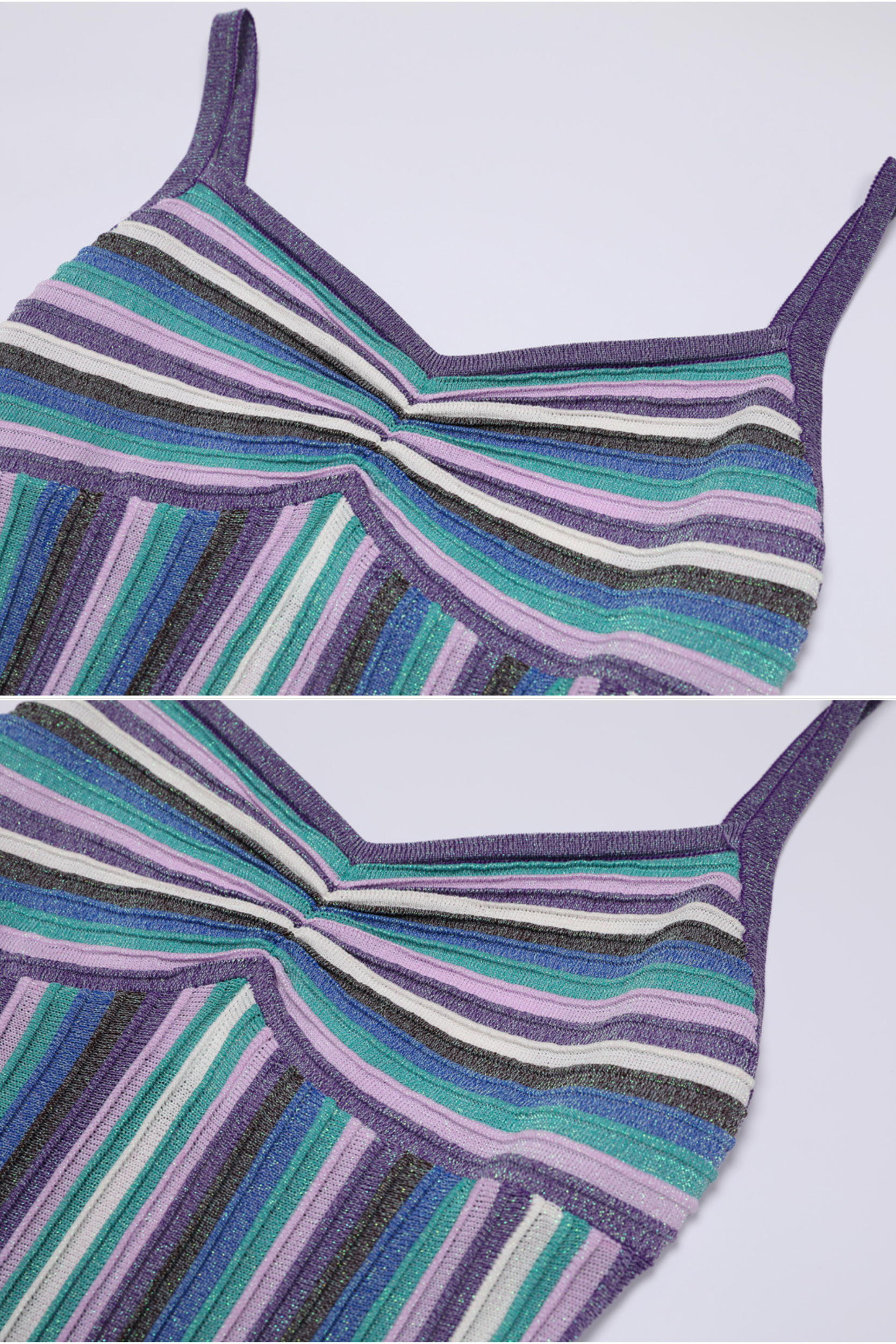 This sleeveless maxi dress is crafted from a soft knitted bright silk blend, featuring vertical multi-color stripes in shades of purple, teal, blue, black, white, and lilac. The bodice has a subtle sweetheart neckline with contouring stripe patterns, thin shoulder straps, and a figure-flattering silhouette that gently flares towards the hem. The fabric has a shimmering finish, adding a touch of sparkle to the vibrant palette.