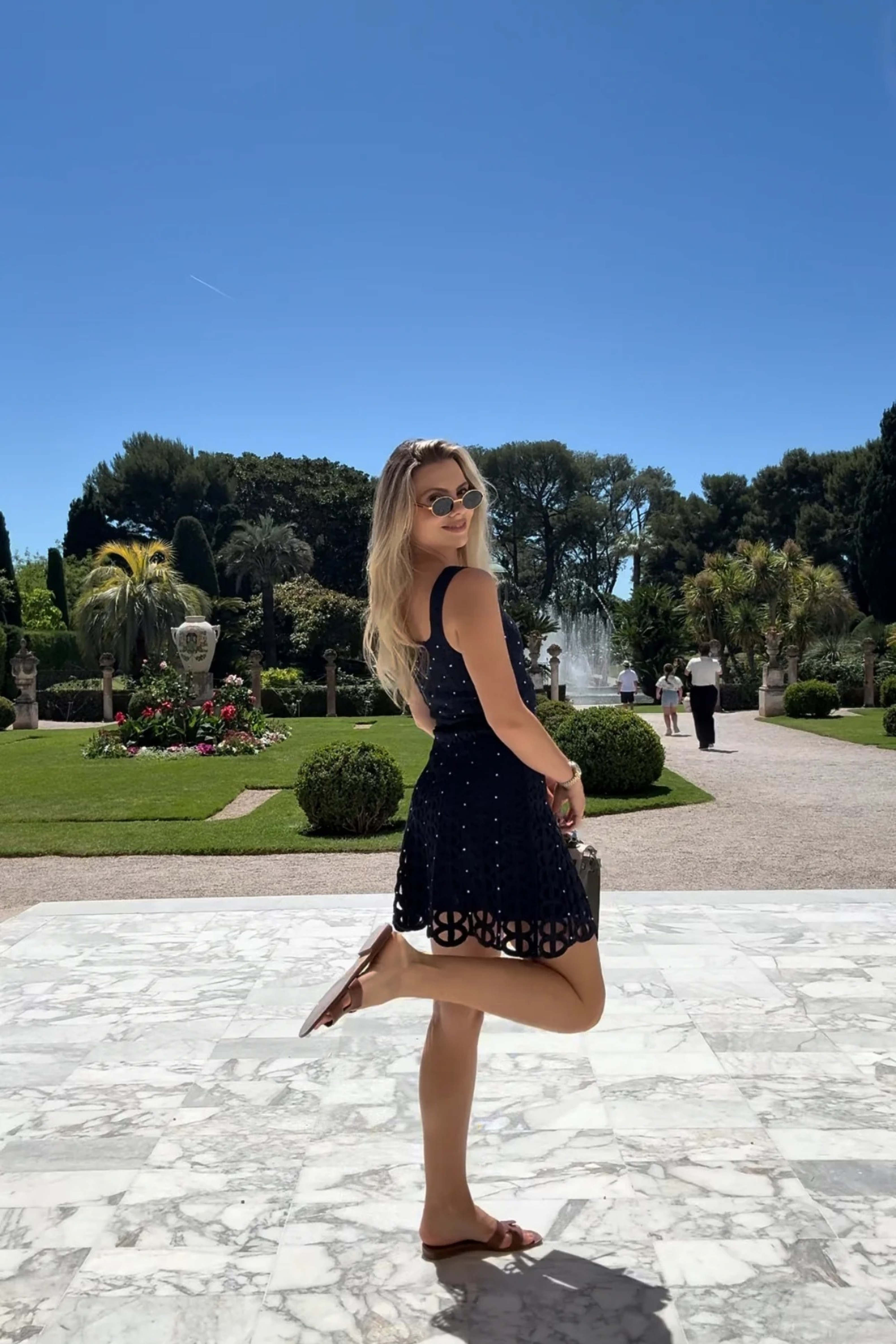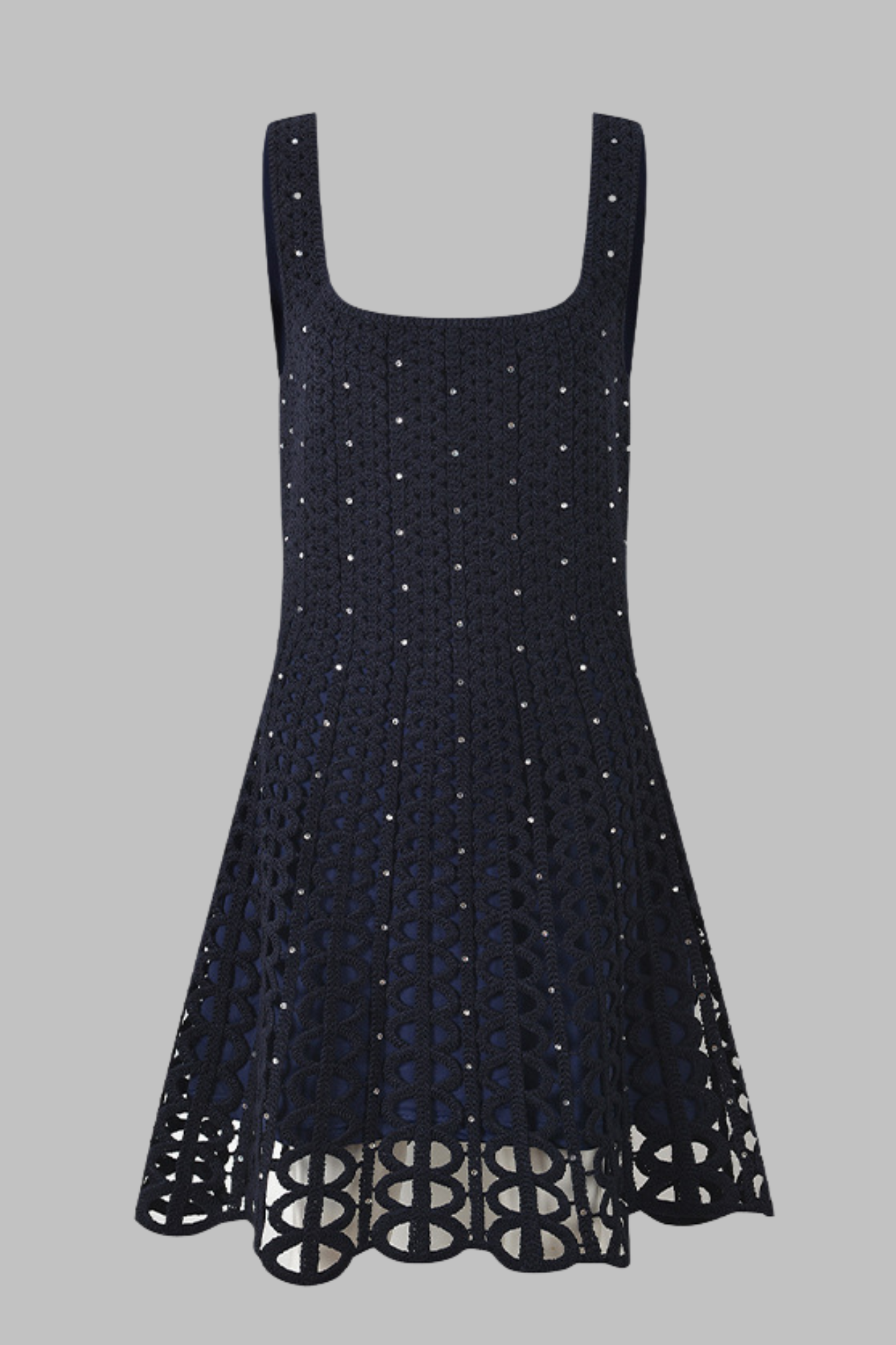 Step into timeless sophistication with the Midnight Elegance Beaded Hollow Knit Mini Dress. Crafted from intricate navy crochet knit, this piece features a delicate all-over hollow pattern adorned with shimmering crystal beads that catch the light with every movement. The flattering square neckline and sleeveless cut enhance the feminine silhouette, while the soft inner lining ensures comfort without compromising the airy, textured design. Perfect for evening soirées or special occasions, this dress blends modern charm with artisanal craftsmanship, making it a standout addition to your wardrobe.