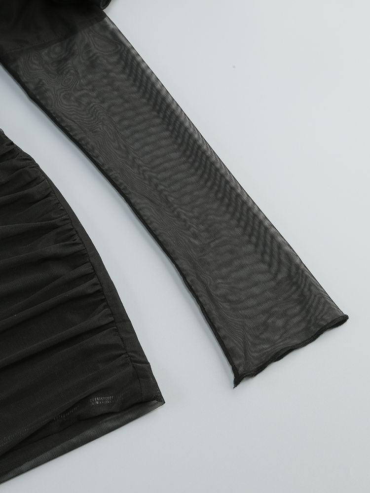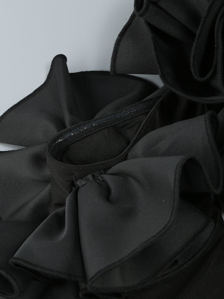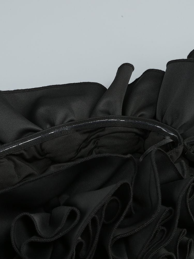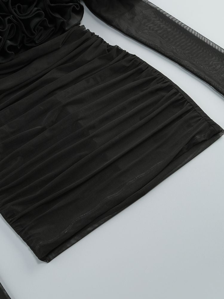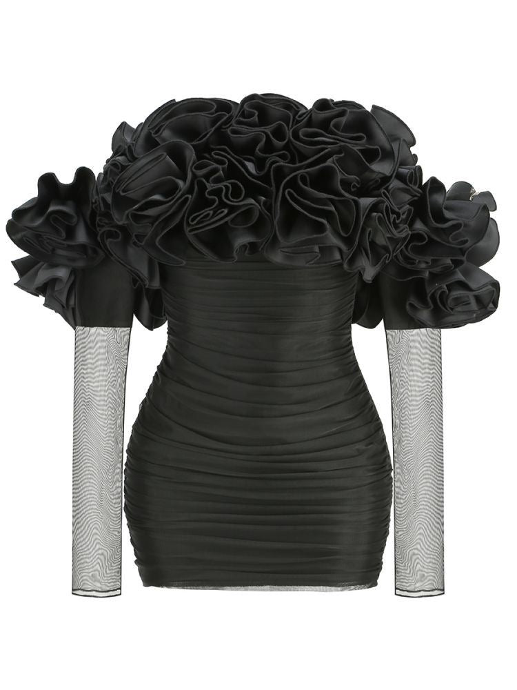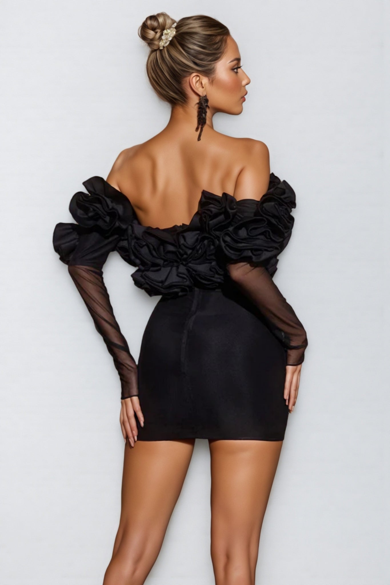 A striking off-shoulder mini dress designed with layered ruffle detailing across the neckline for a dramatic, feminine look. The fitted bodycon silhouette enhances the figure, while the sheer mesh sleeves add a soft, elegant touch. Made with ruched fabric that smooths and shapes, this dress is perfect for evenings out, parties, and special events.