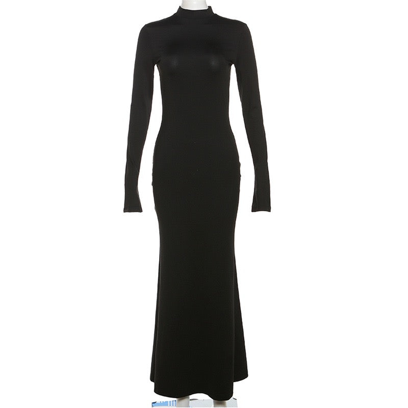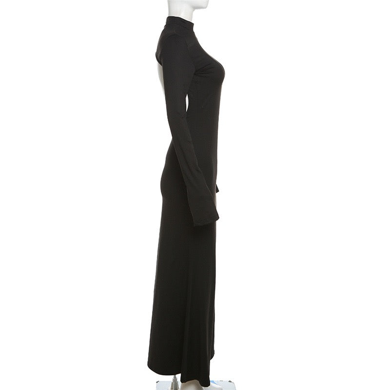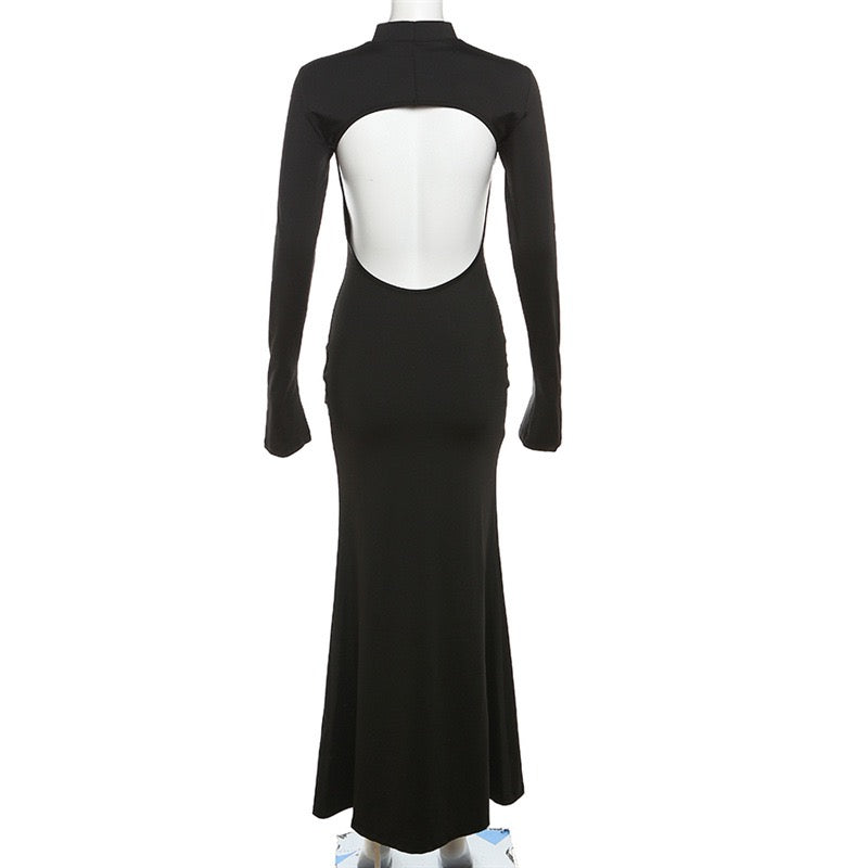 A timeless statement of sophistication and allure, this long sleeve maxi dress features a sleek high neckline and a dramatic open-back design that adds a bold, modern twist. The body-hugging silhouette flows into a soft flared hem for an effortlessly elegant look. Crafted from smooth stretch fabric that enhances your shape, this dress is perfect for formal evenings, galas, or chic night-out occasions.