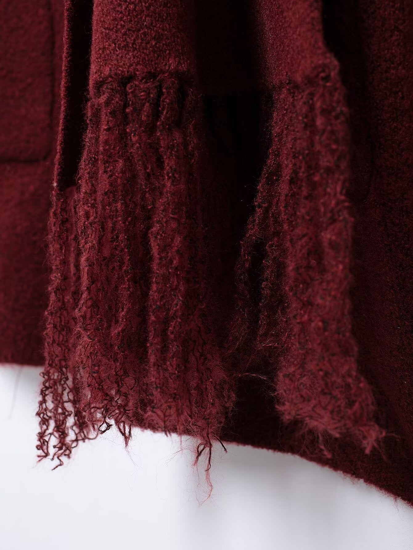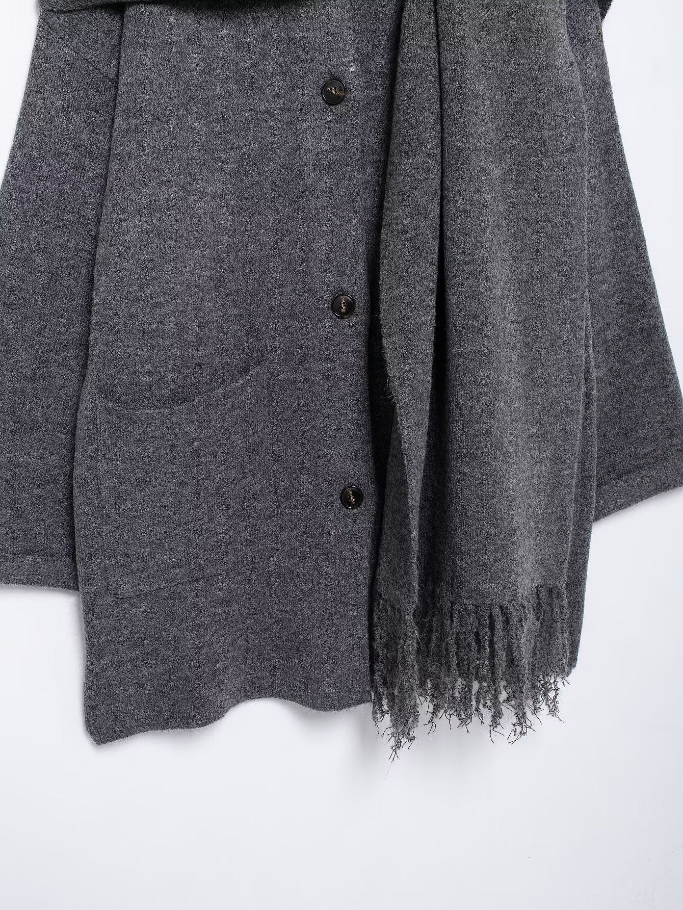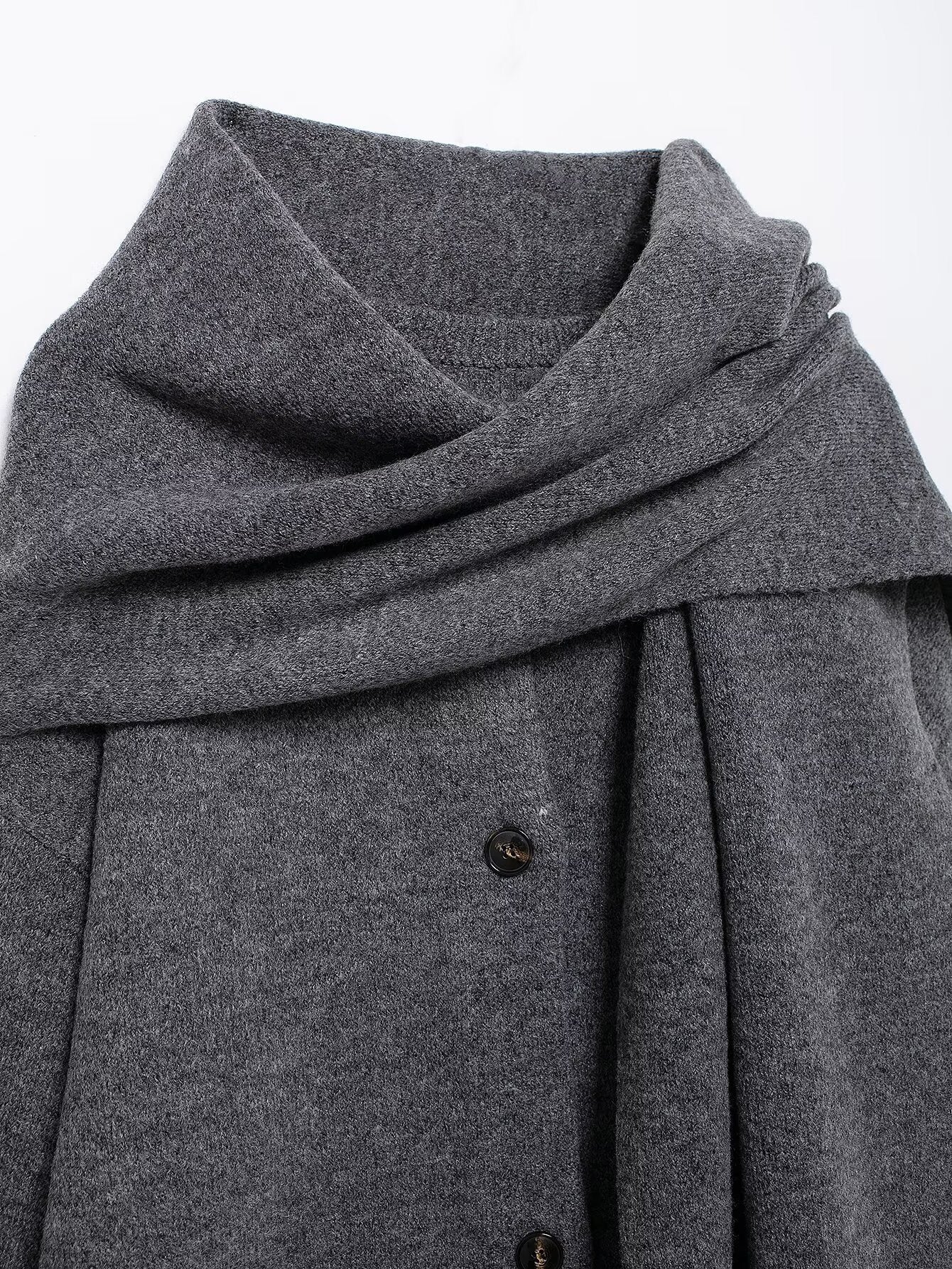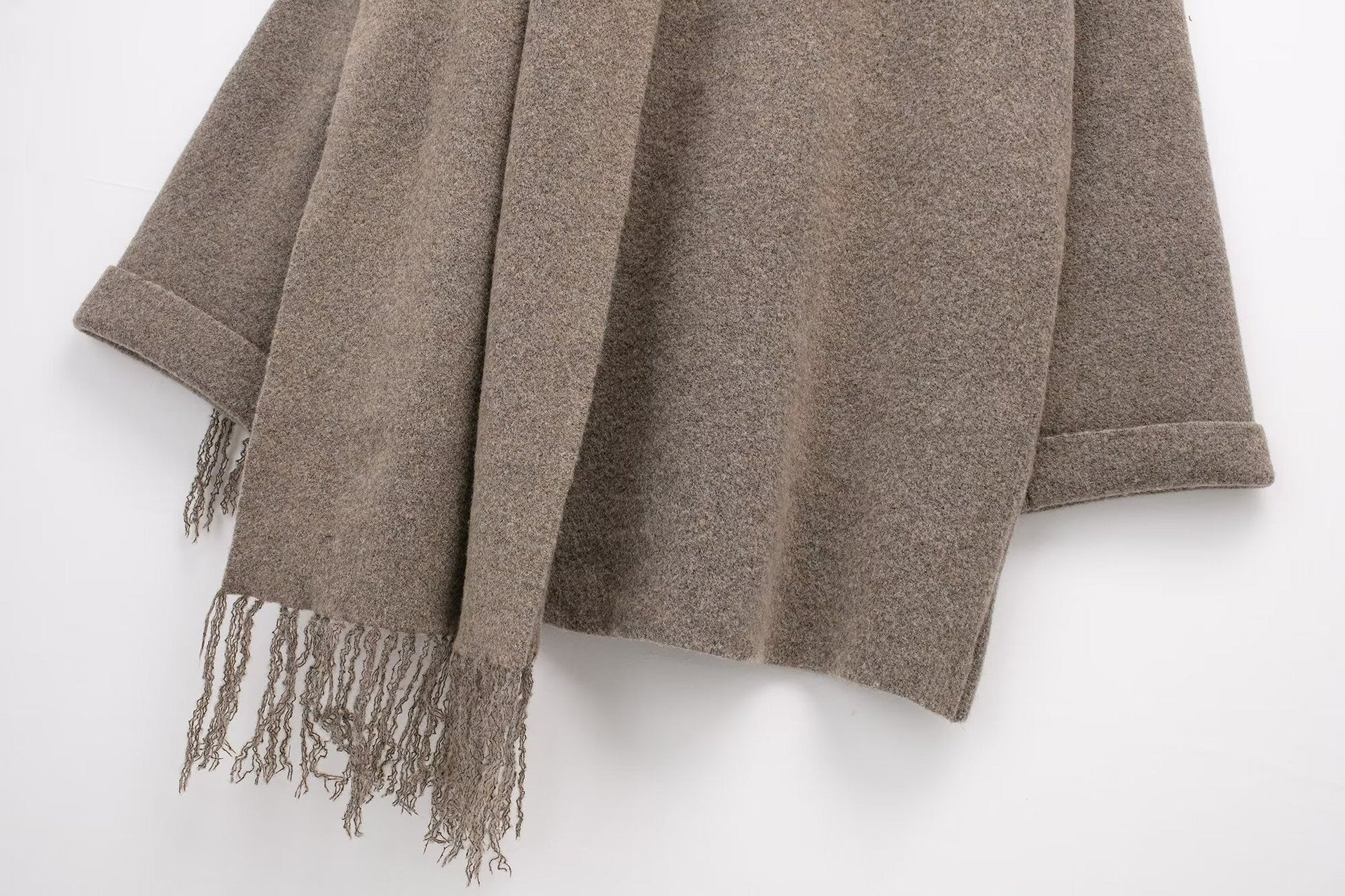 Stay warm and stylish with this oversized wool-blend coat featuring a built-in wrap scarf and soft fringe detailing. Designed with wide sleeves, front pockets, and easy button closure for a relaxed, effortless look. Perfect for layering on cold days.