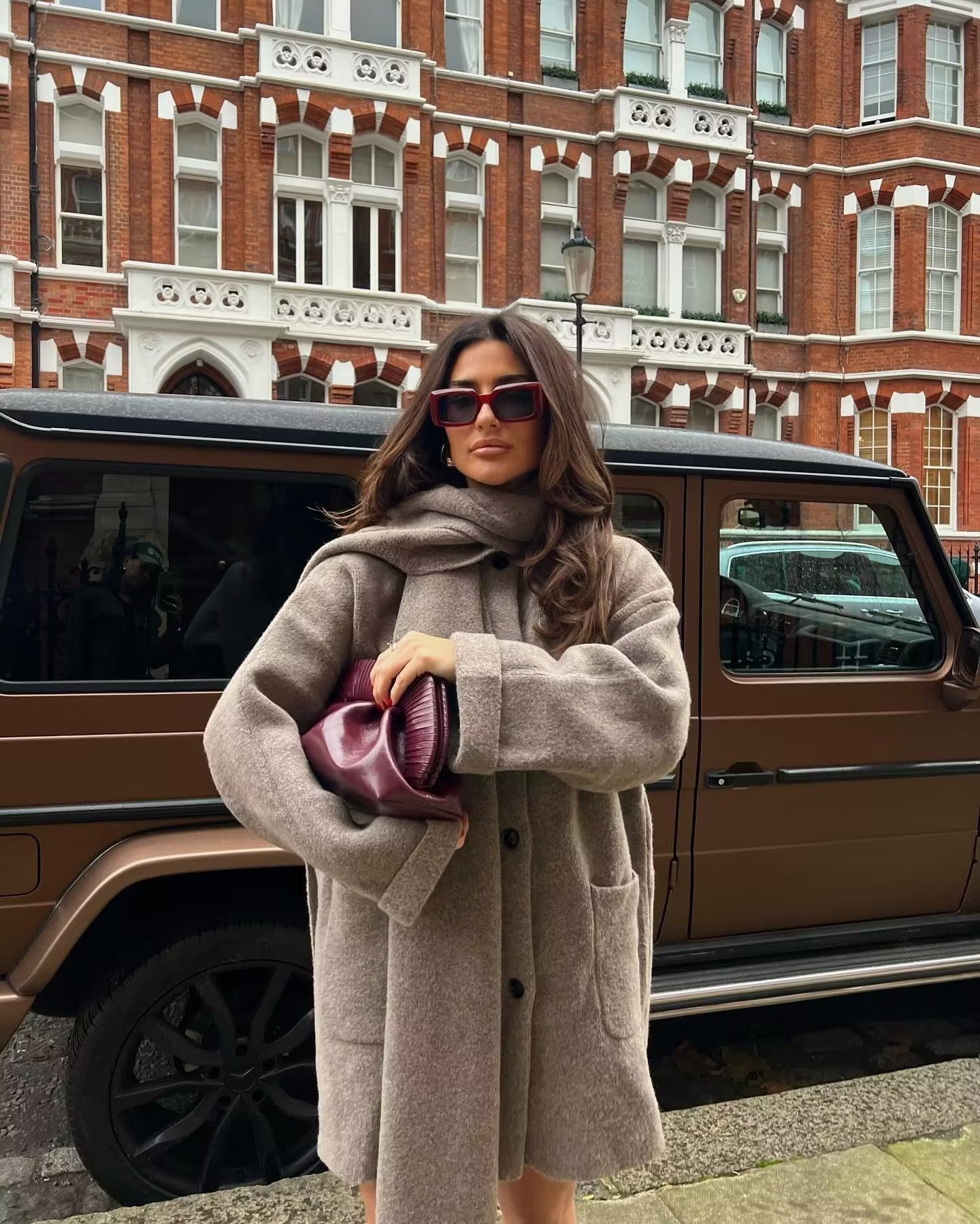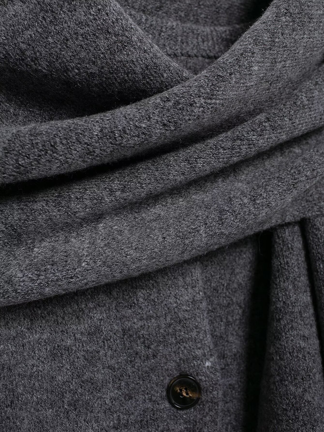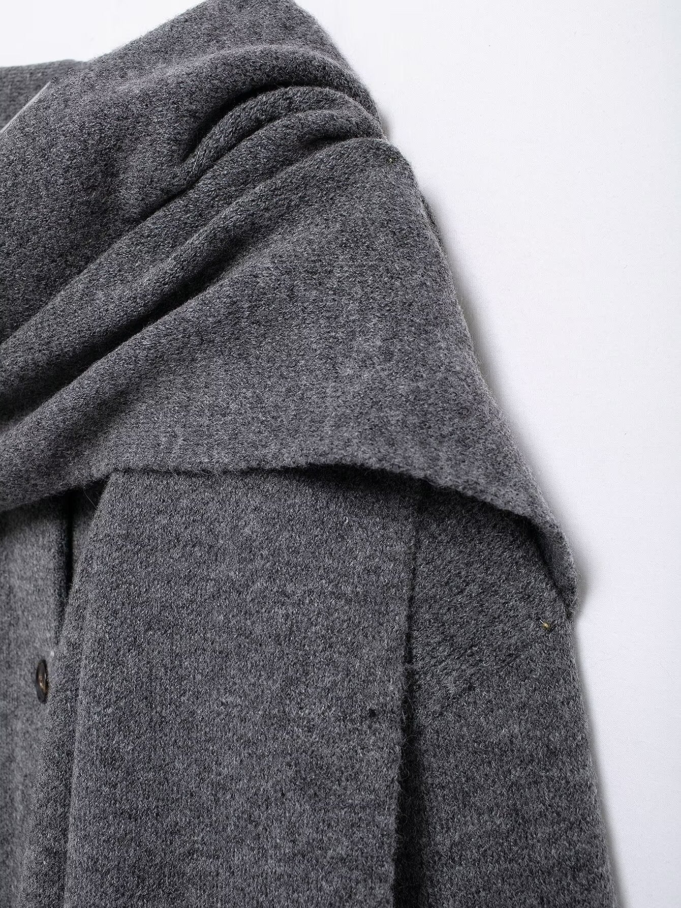Stay warm and stylish with this oversized wool-blend coat featuring a built-in wrap scarf and soft fringe detailing. Designed with wide sleeves, front pockets, and easy button closure for a relaxed, effortless look. Perfect for layering on cold days.