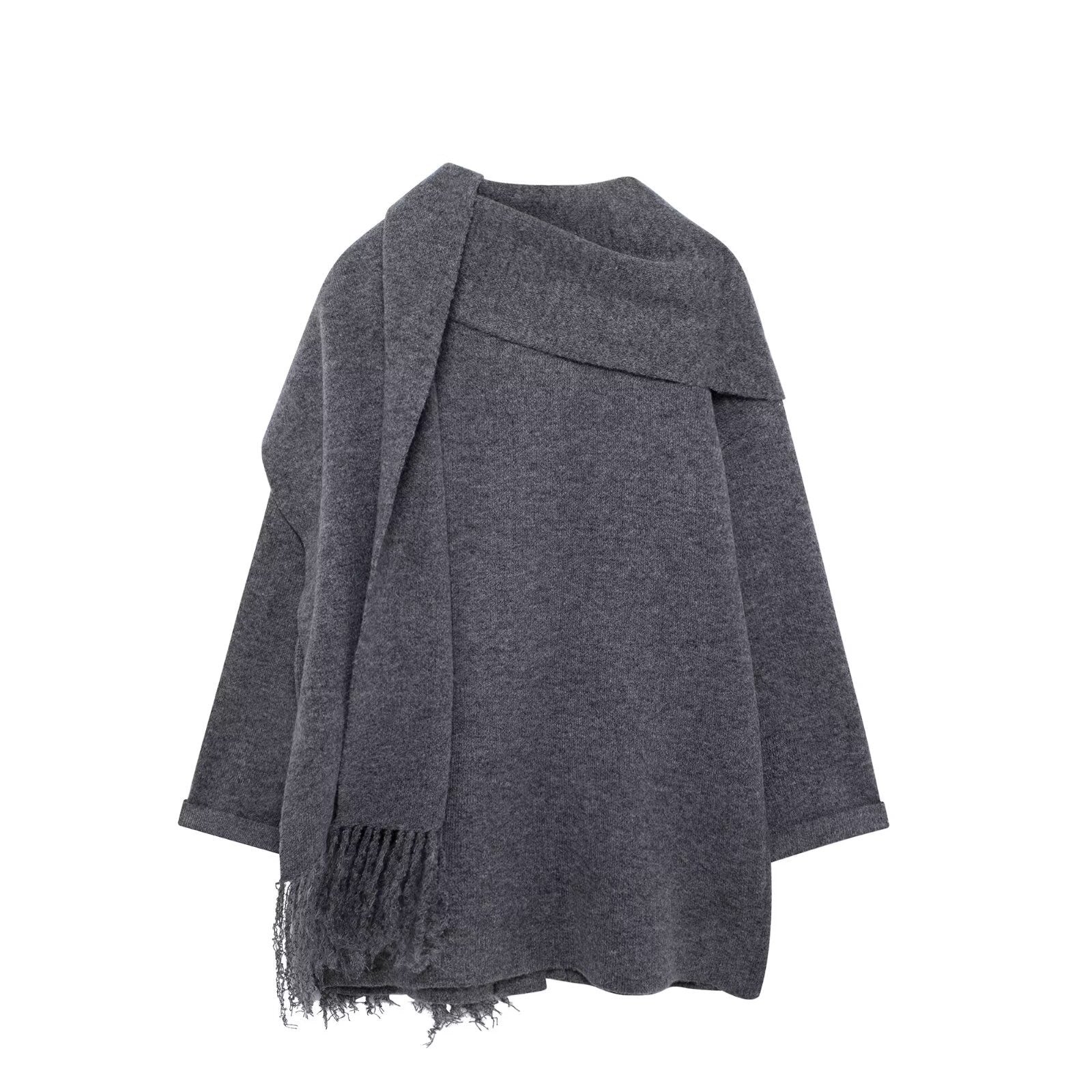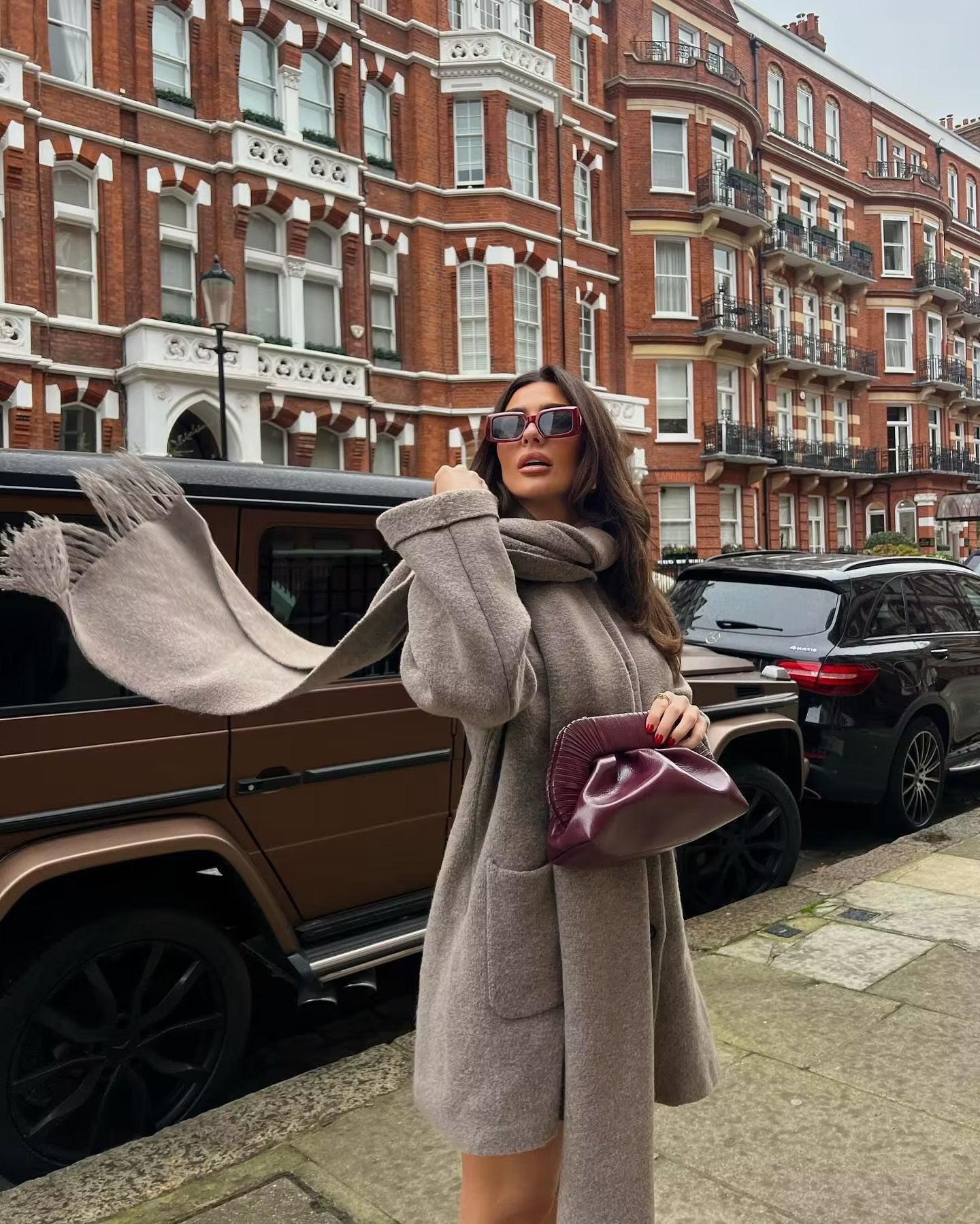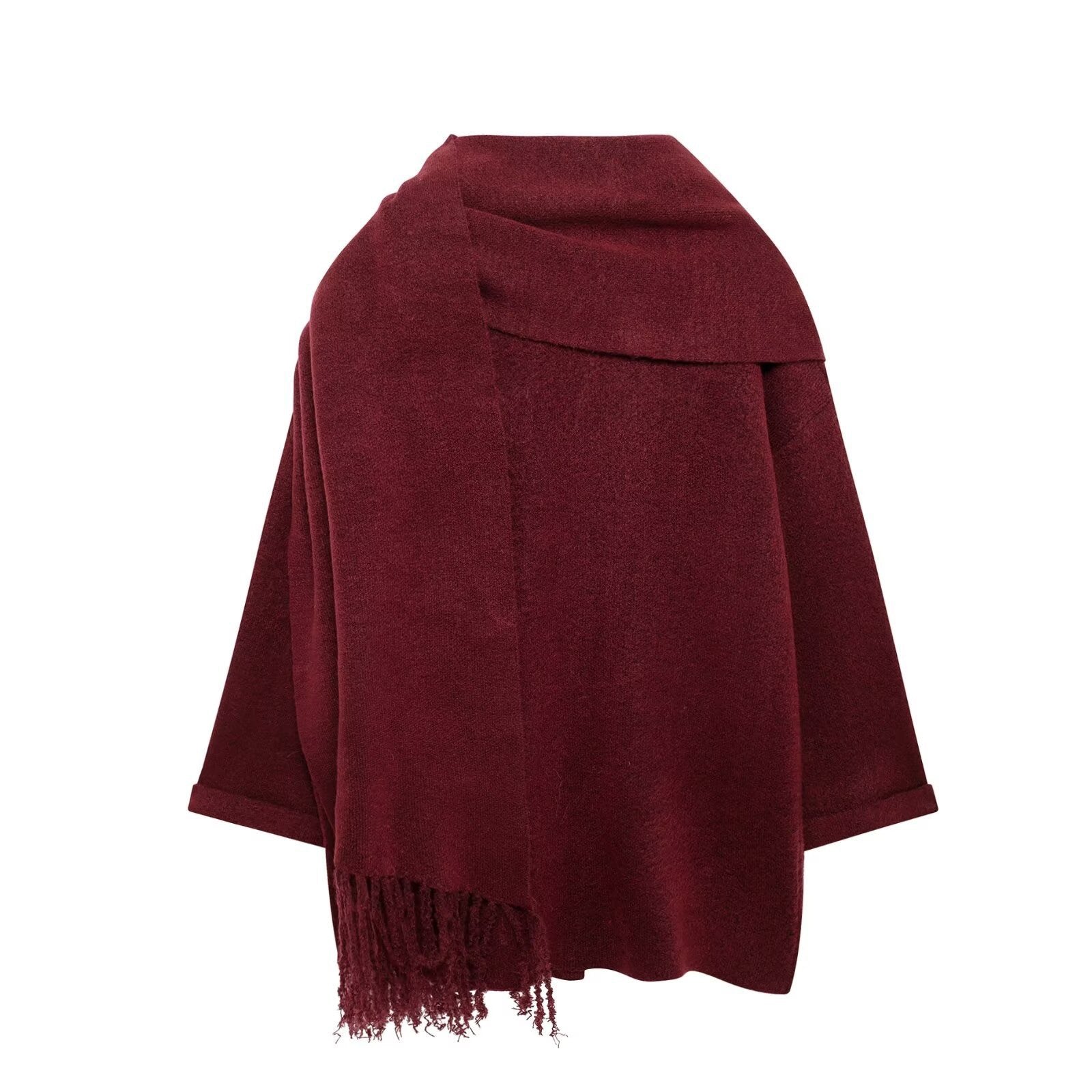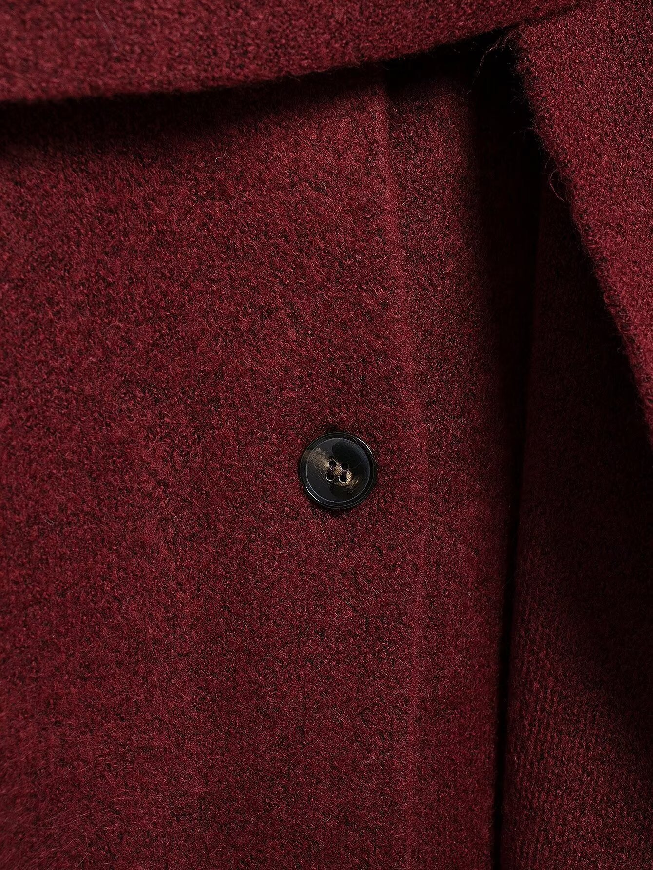 Stay warm and stylish with this oversized wool-blend coat featuring a built-in wrap scarf and soft fringe detailing. Designed with wide sleeves, front pockets, and easy button closure for a relaxed, effortless look. Perfect for layering on cold days.