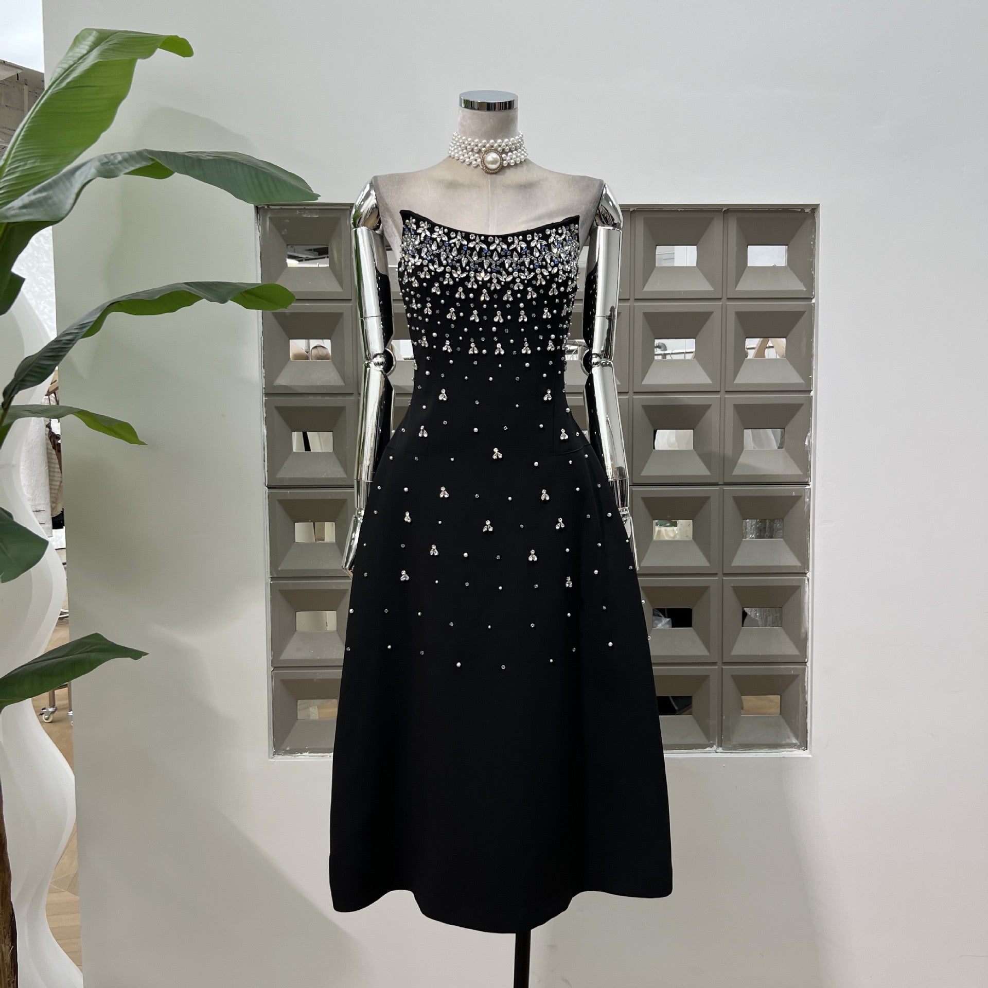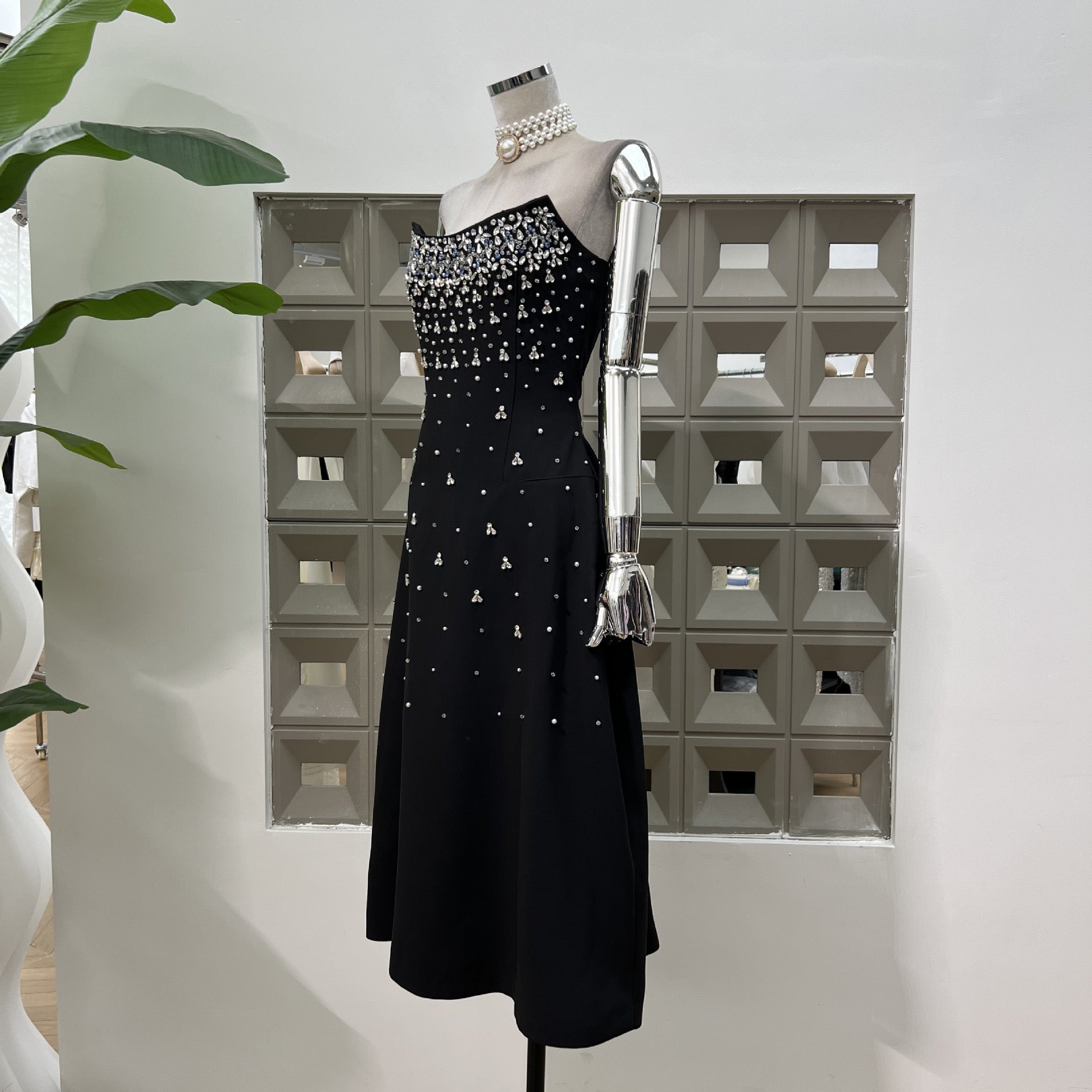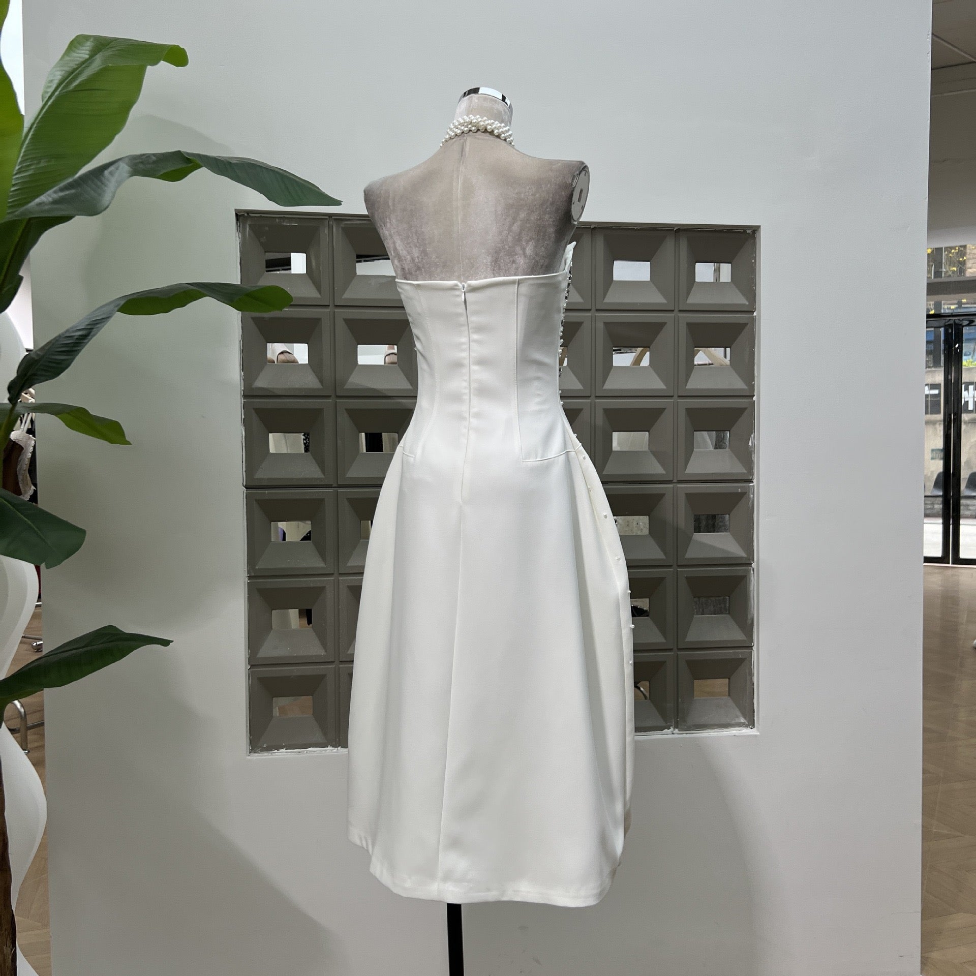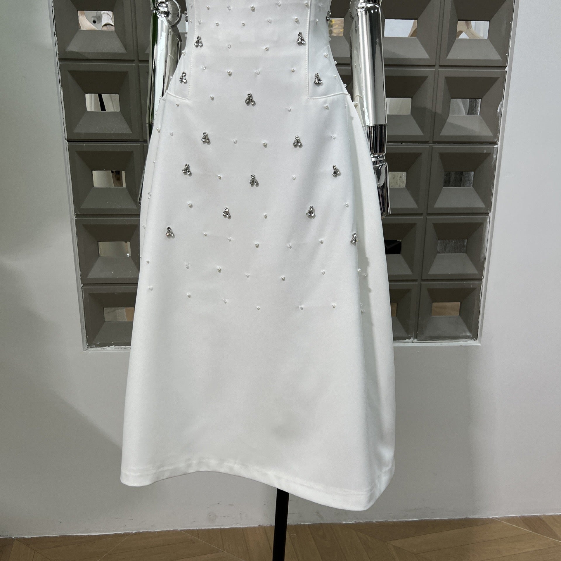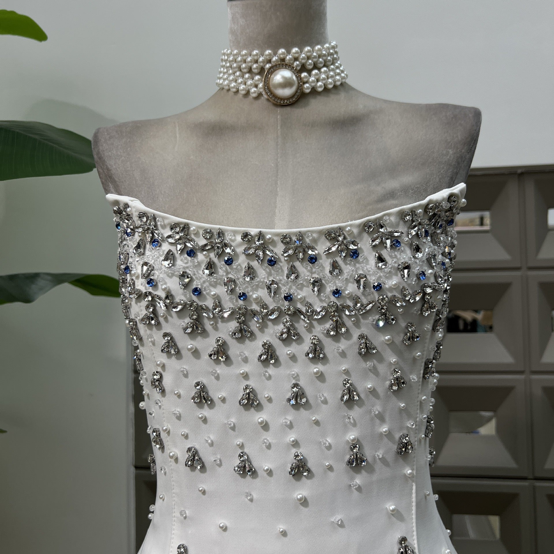 Turn heads with the timeless elegance of this Pearl & Crystal Strapless Midi Dress. Designed with a structured bodice that beautifully highlights the shoulders, it’s adorned with hand-applied pearls and shimmering crystals that catch the light from every angle.
