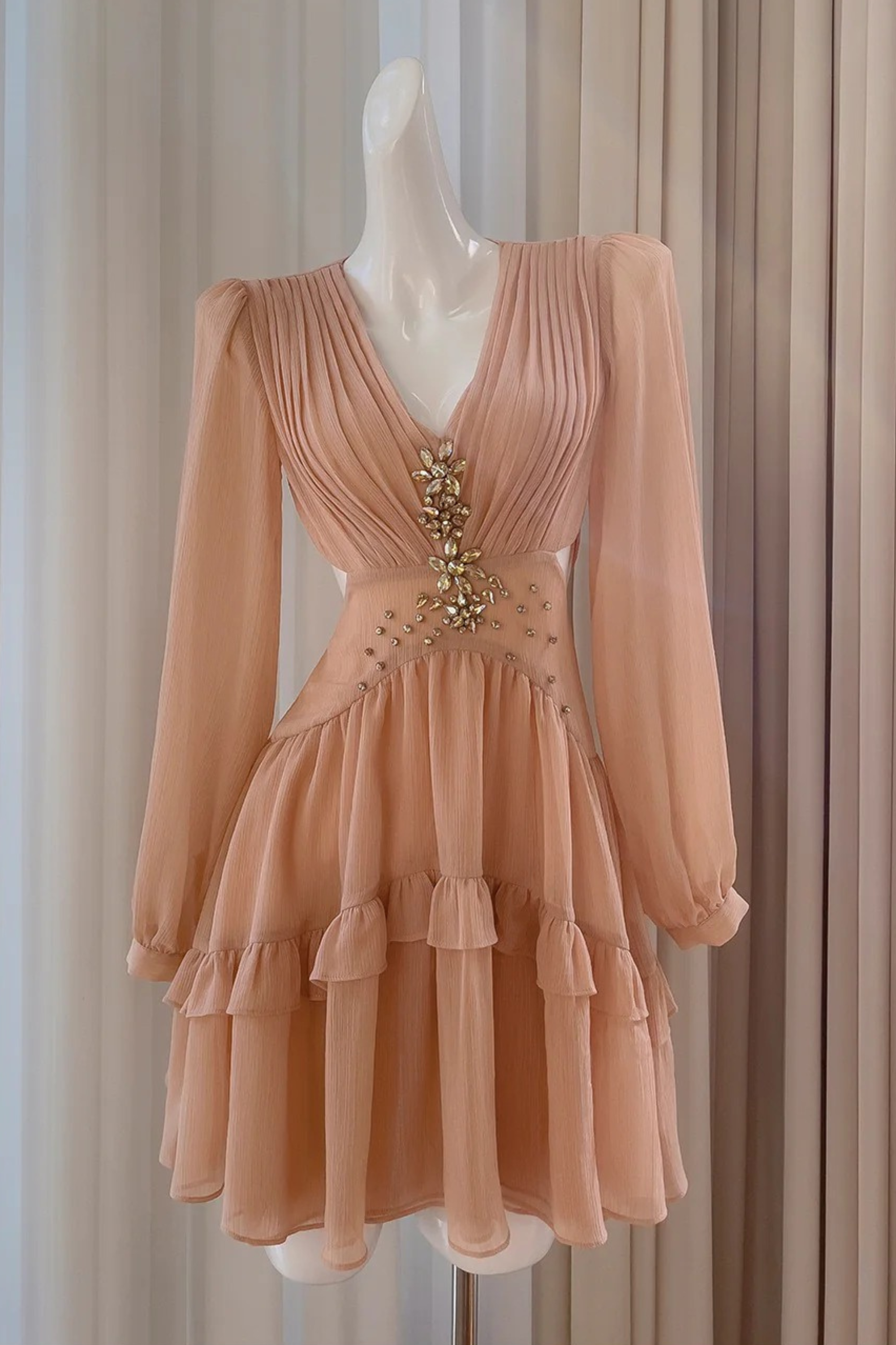 An elegant chiffon mini dress designed with softly pleated detailing and a deep V-neckline that enhances the silhouette. Featuring long sheer sleeves with button cuffs and a fitted waist adorned with shimmering crystal embellishments for a touch of glamour. The layered ruffled hem adds graceful movement, making this dress perfect for evening events, celebrations, or special occasions.