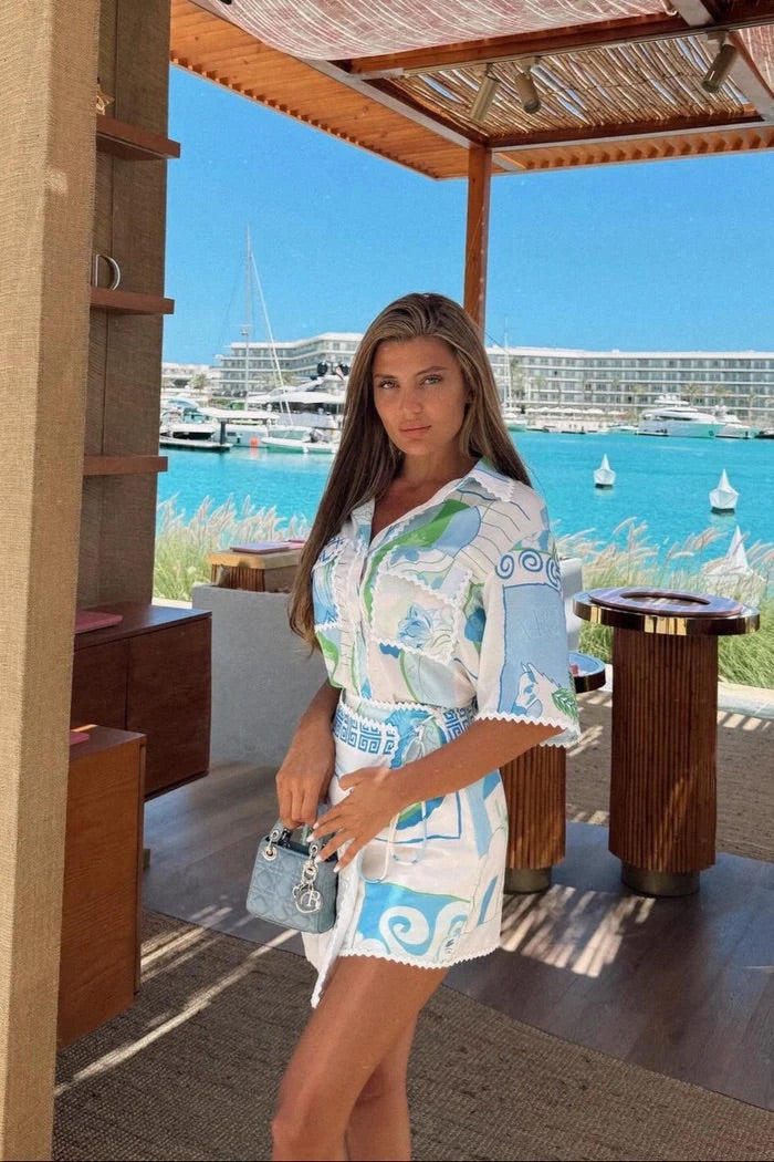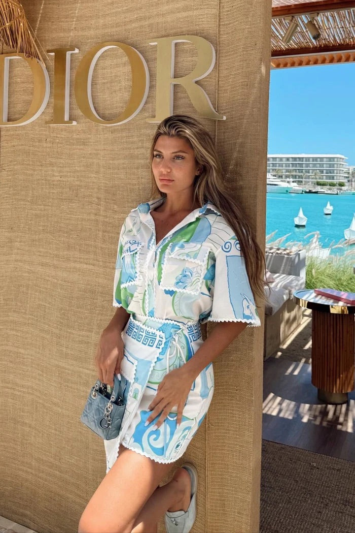 Step into vacation mode with this breezy two-piece set featuring a relaxed-fit printed overshirt and a matching high-waisted skort. Crafted from lightweight cotton, the set is adorned with a vibrant blue, green, and white mosaic-style print, and finished with scalloped trim details. The belted skort adds a flattering shape, while the short-sleeve button-up shirt offers effortless versatility. Perfect for beach days, poolside lunches, or summer getaways