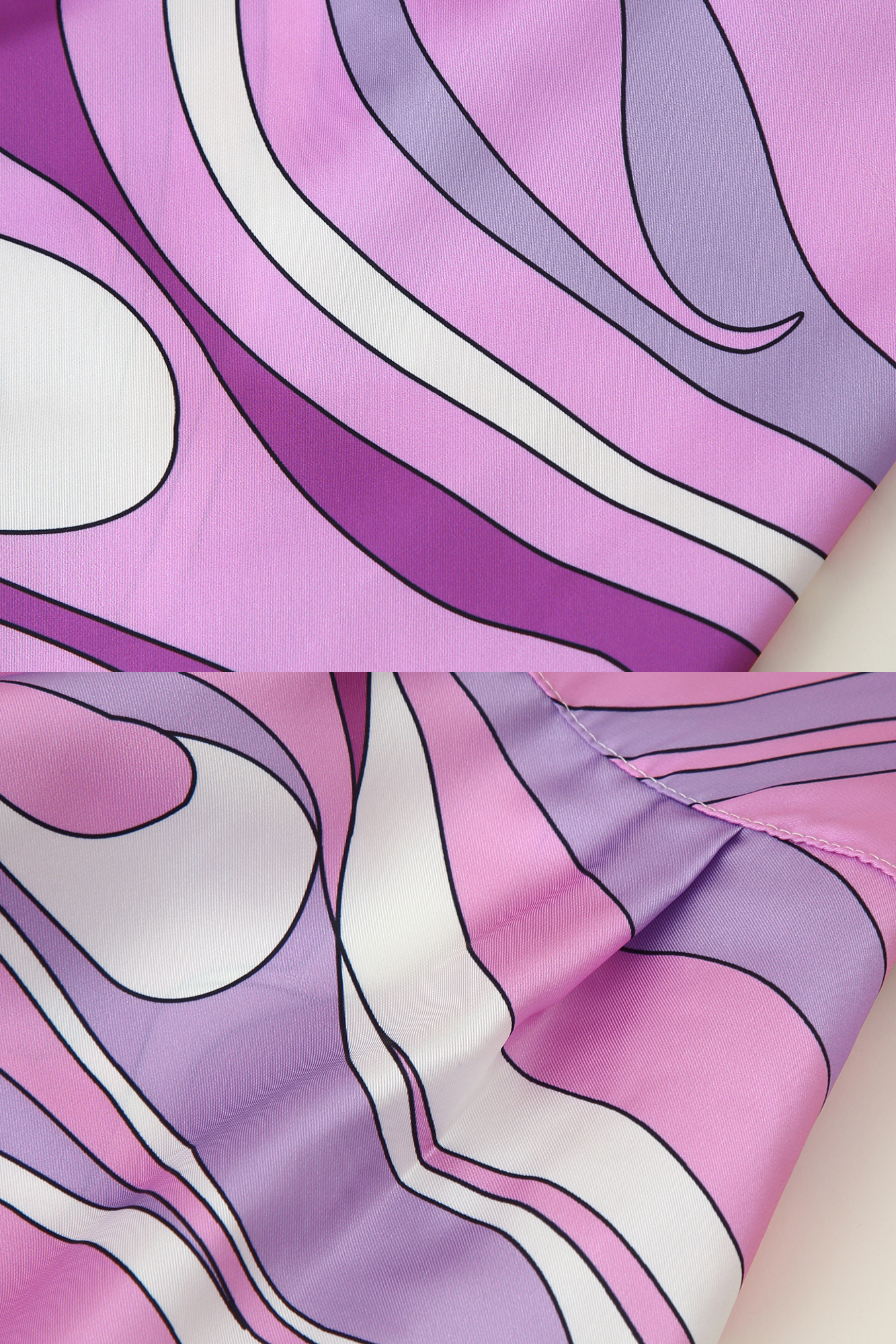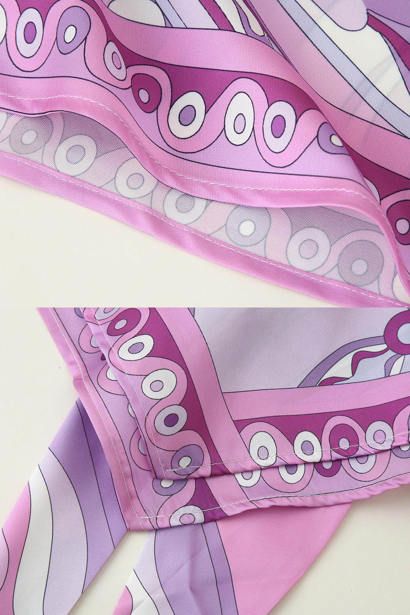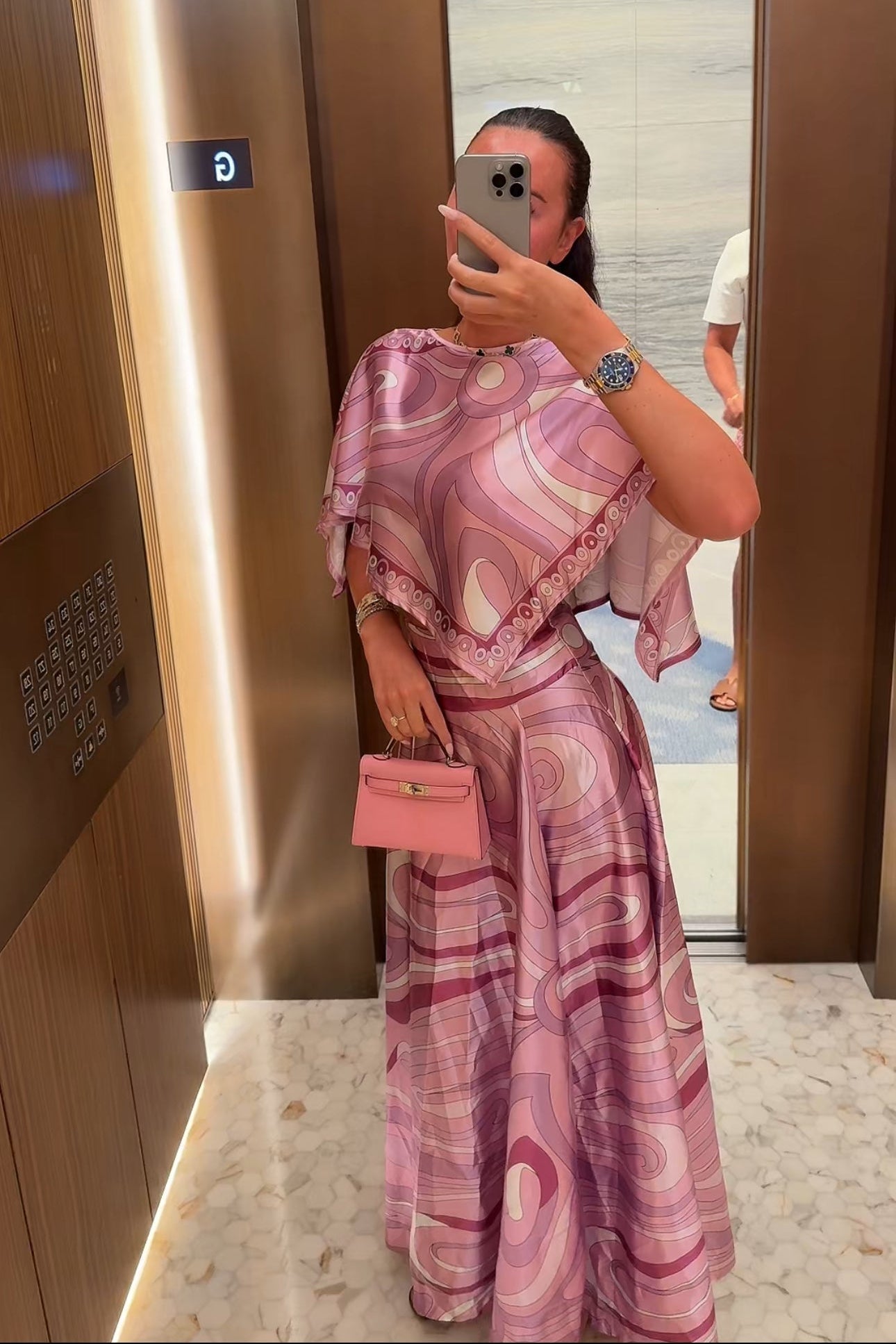 Step into bold, effortless elegance with this two-piece satin co-ord set, featuring a flowing handkerchief-style scarf top and a high-waist midi skirt. Designed in a striking retro wave print with fluid lines and abstract swirls, it radiates modern sophistication while keeping a playful vintage edge. The silky satin fabric enhances movement and adds a luxurious sheen, perfect for day-to-night styling. Available in dreamy pink tones or cool aqua shades, this set can be worn together for a statement look or styled separately for endless versatility.