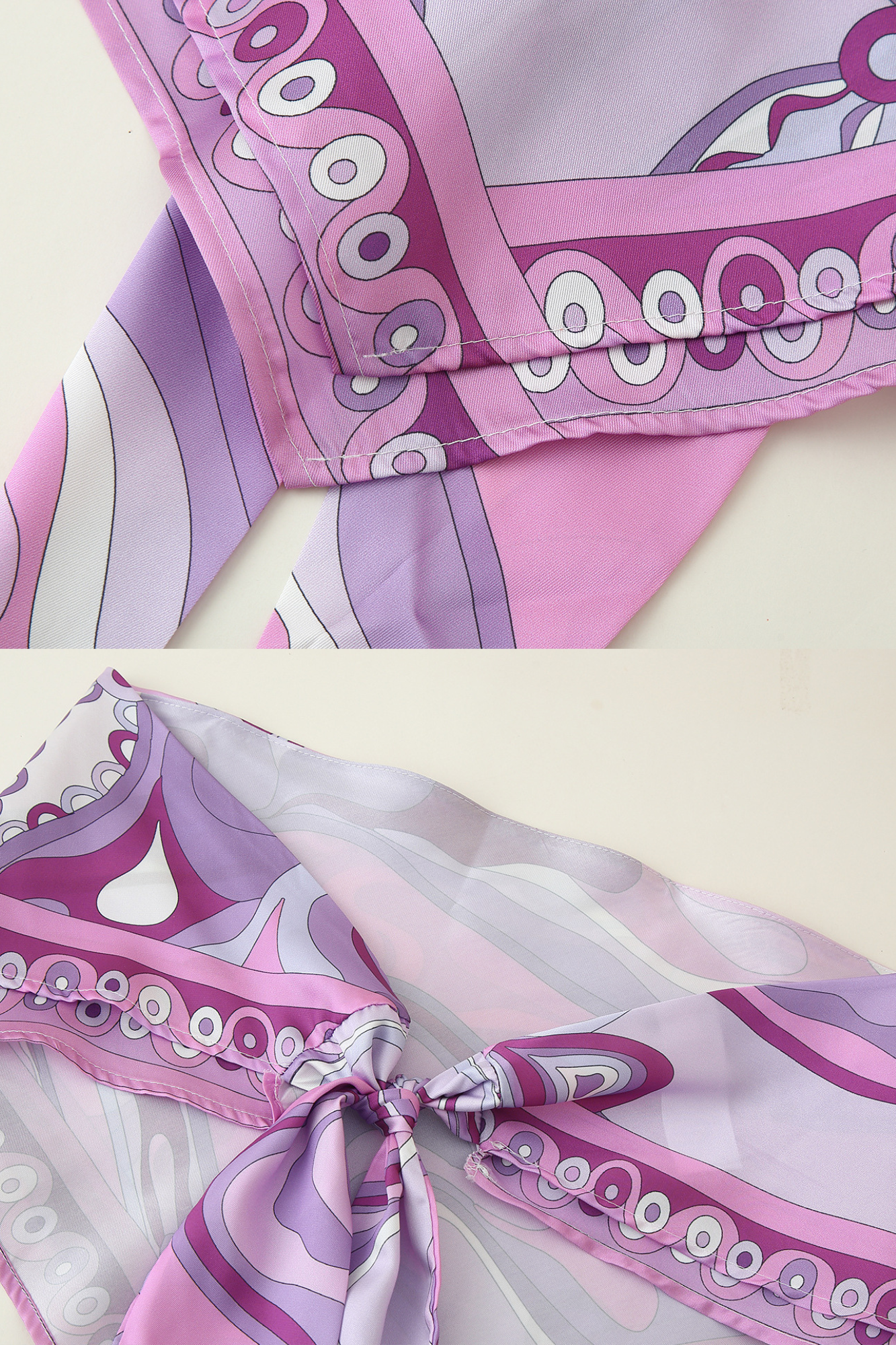 Turn heads with this vibrant retro-inspired two-piece set, featuring a scarf-style tie top and a flowy A-line midi skirt in a bold pink swirl print. Crafted from lightweight satin fabric, the top can be styled in multiple ways for a versatile chic look, while the high-waisted skirt falls gracefully with a flattering silhouette. Perfect for summer parties, beach vacations, or casual chic outings, this set blends playful prints with elegant comfort.