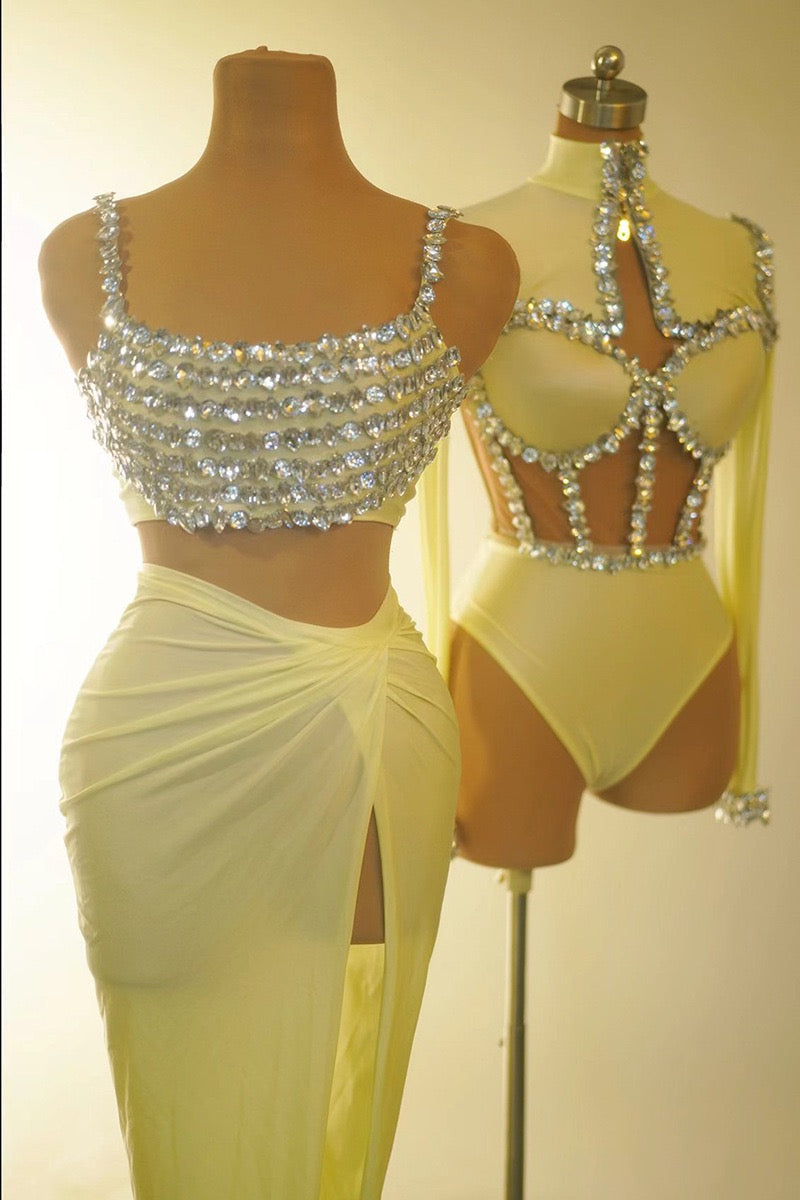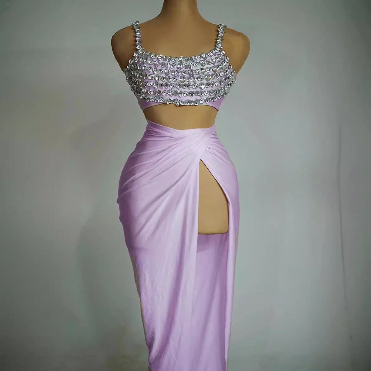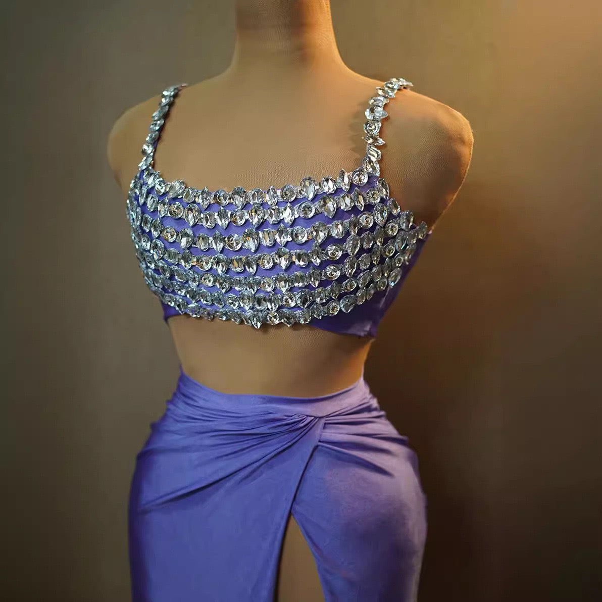 This dazzling two-piece set features a fully rhinestone-studded crop top with slender straps and a draped high-slit skirt that flatters every curve. Designed in soft stretch fabric for a sleek fit and radiant look, it’s perfect for evening events, parties, or performances.