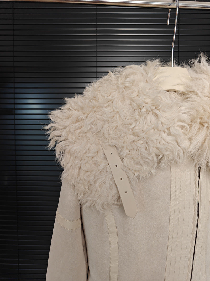 The wide shearling collar and cuffs add a luxurious touch, while the tailored seams and buckle details give it a flattering, structured fit. A versatile piece that pairs beautifully with jeans, dresses, or winter boots for a polished, cozy finish.