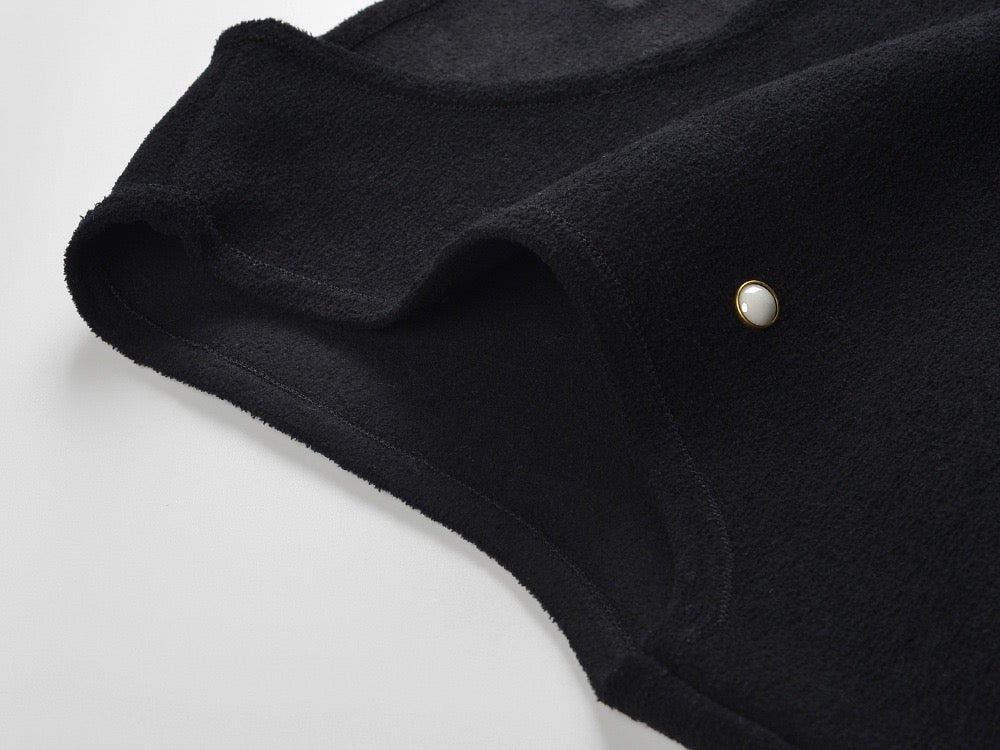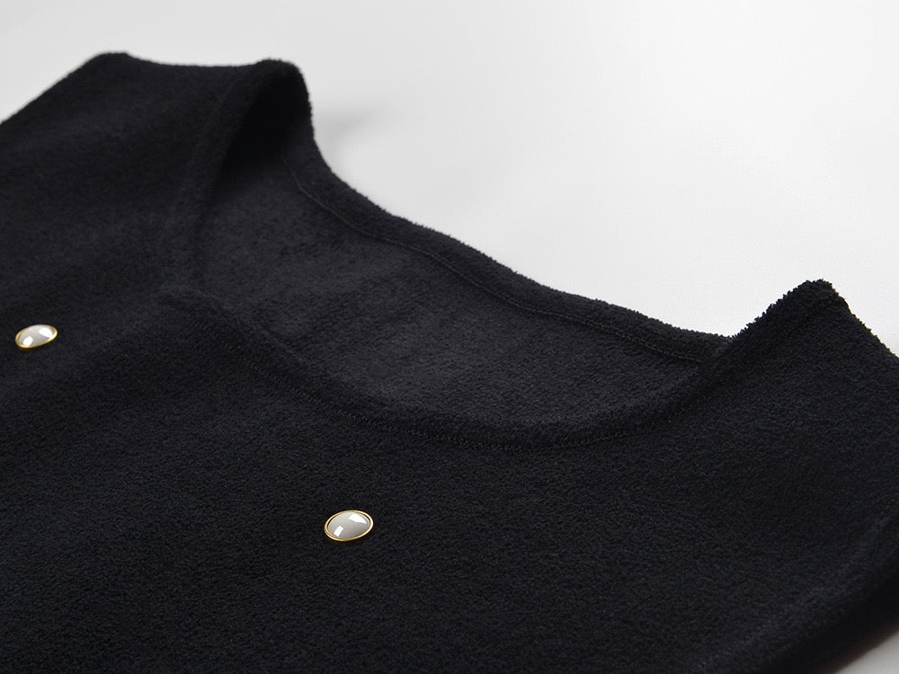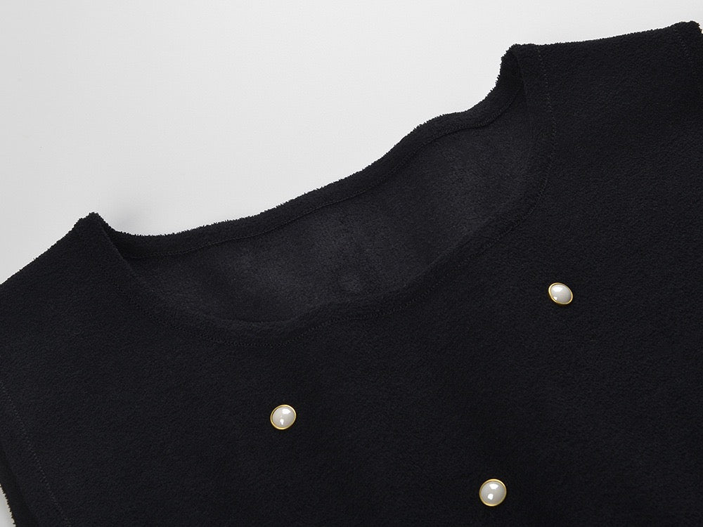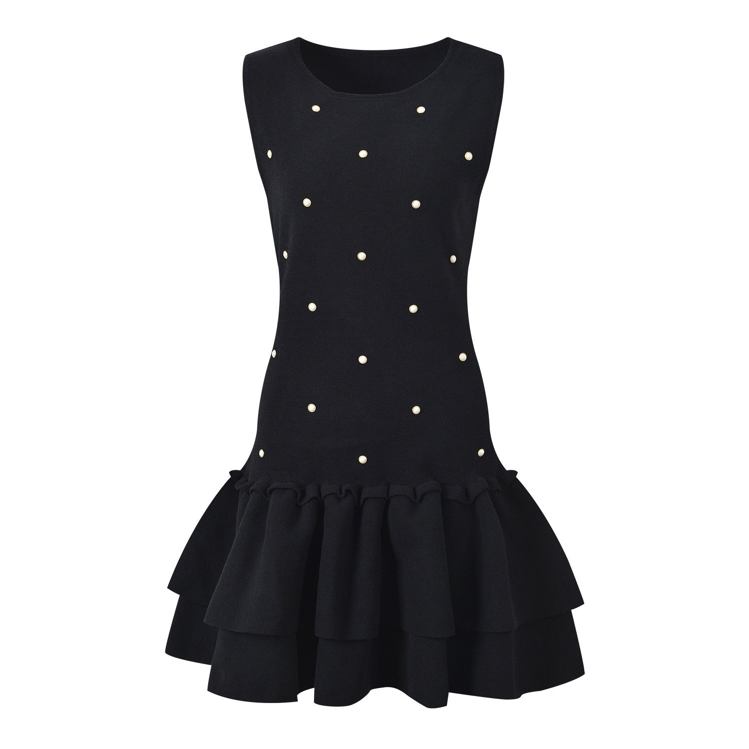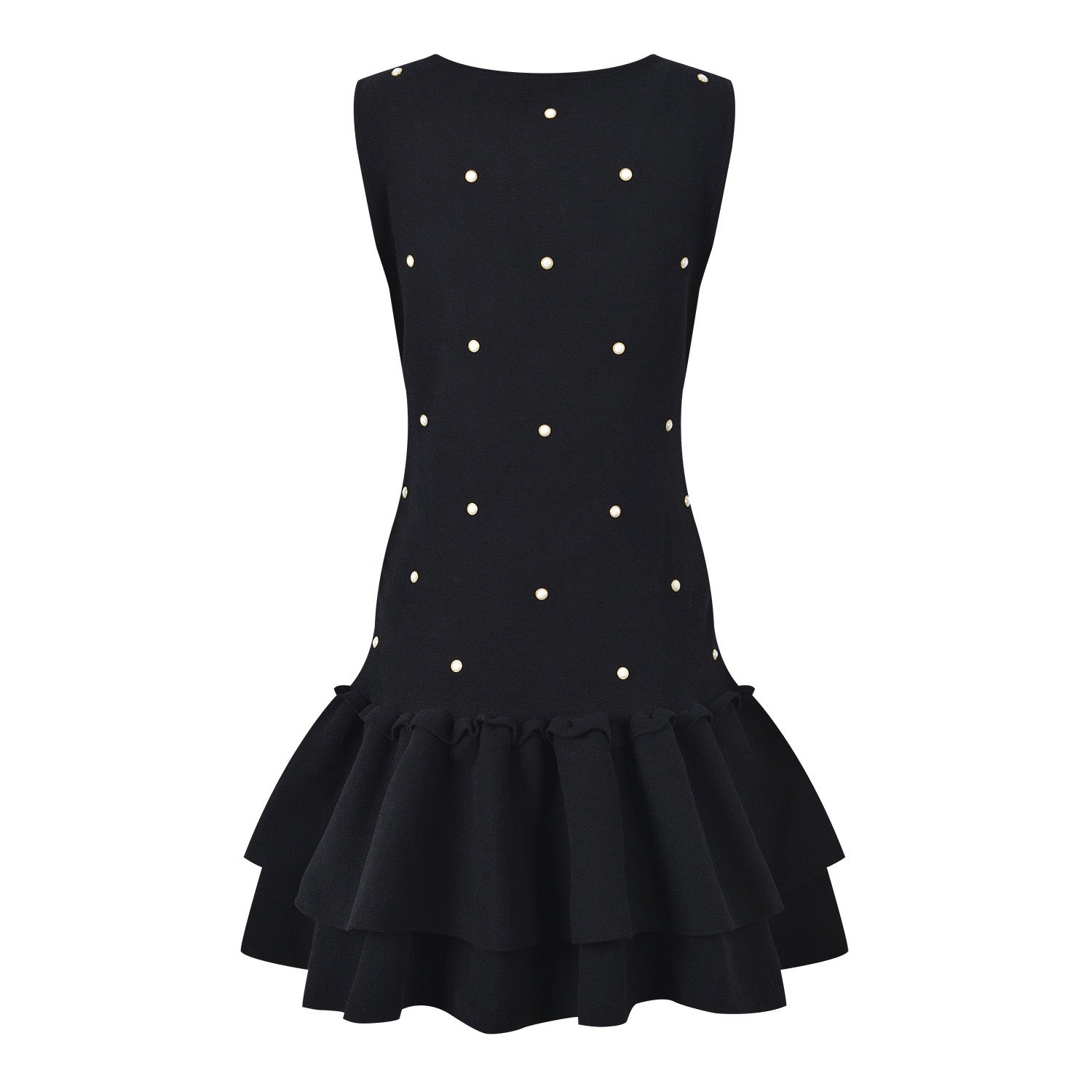 A chic sleeveless mini dress featuring scattered pearl embellishments across the front for a timeless, feminine touch. Crafted from a textured knit fabric, it offers a soft, structured silhouette with a playful double-layered ruffled hem. Perfect for elegant daytime outings or evening gatherings, this dress effortlessly balances sophistication and charm.