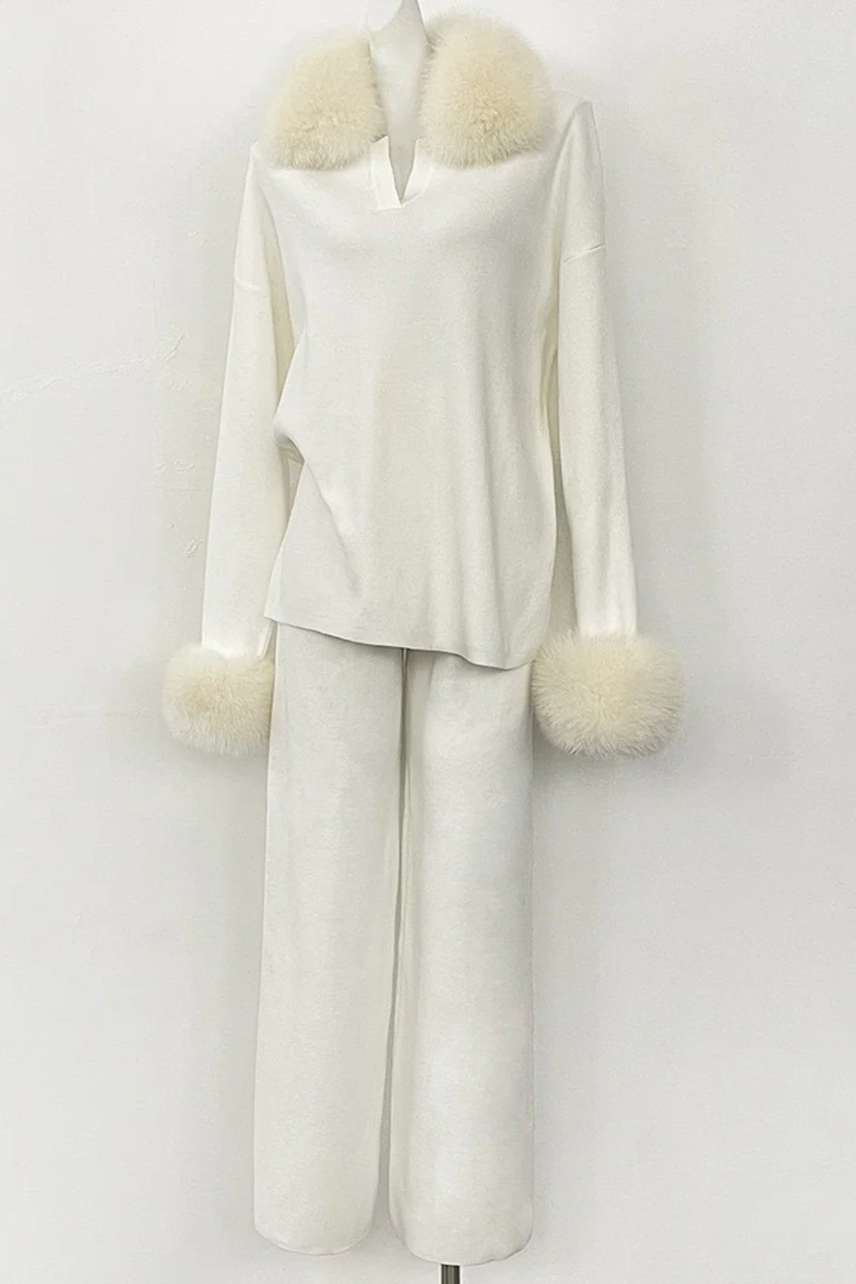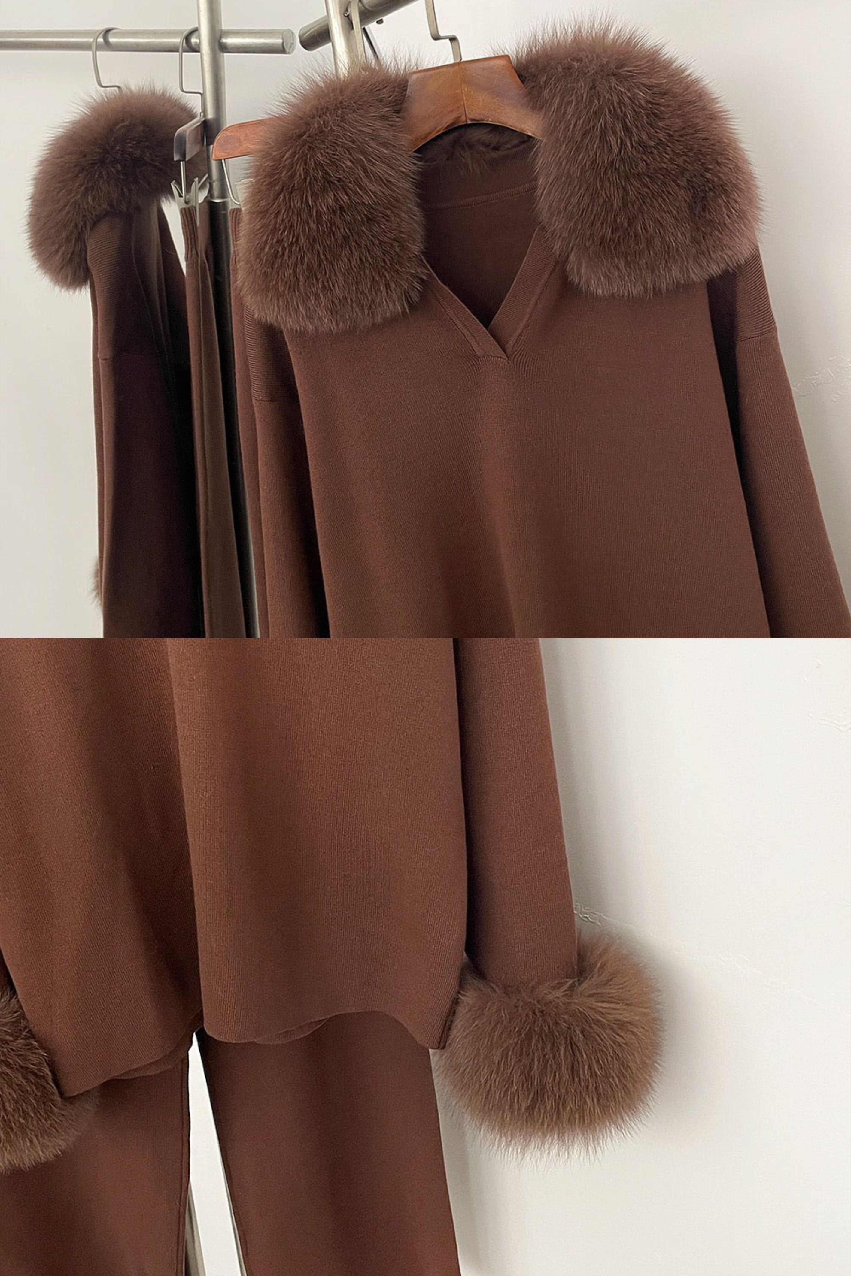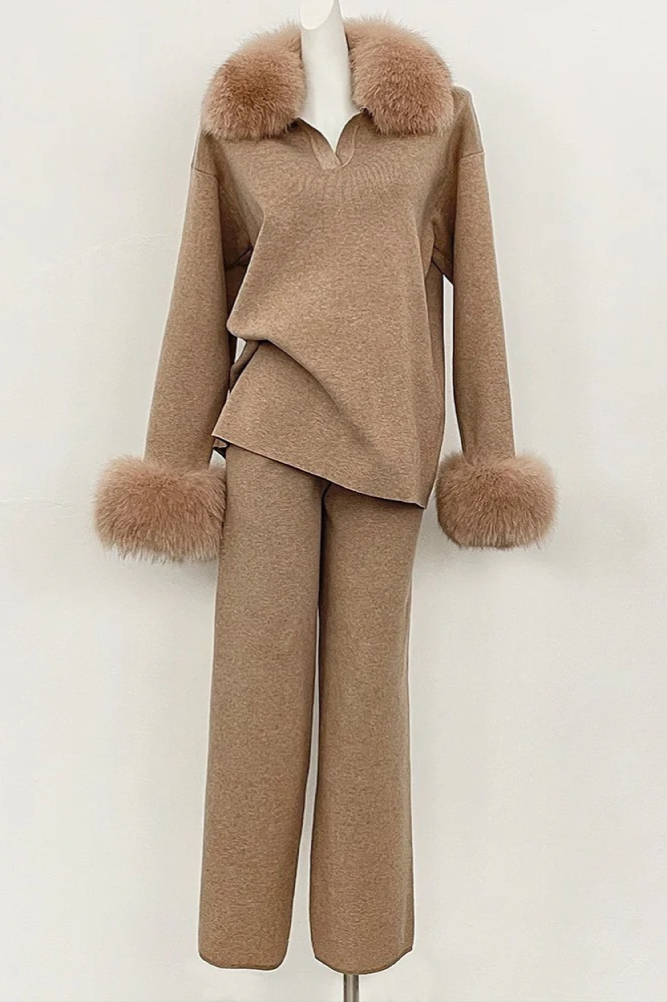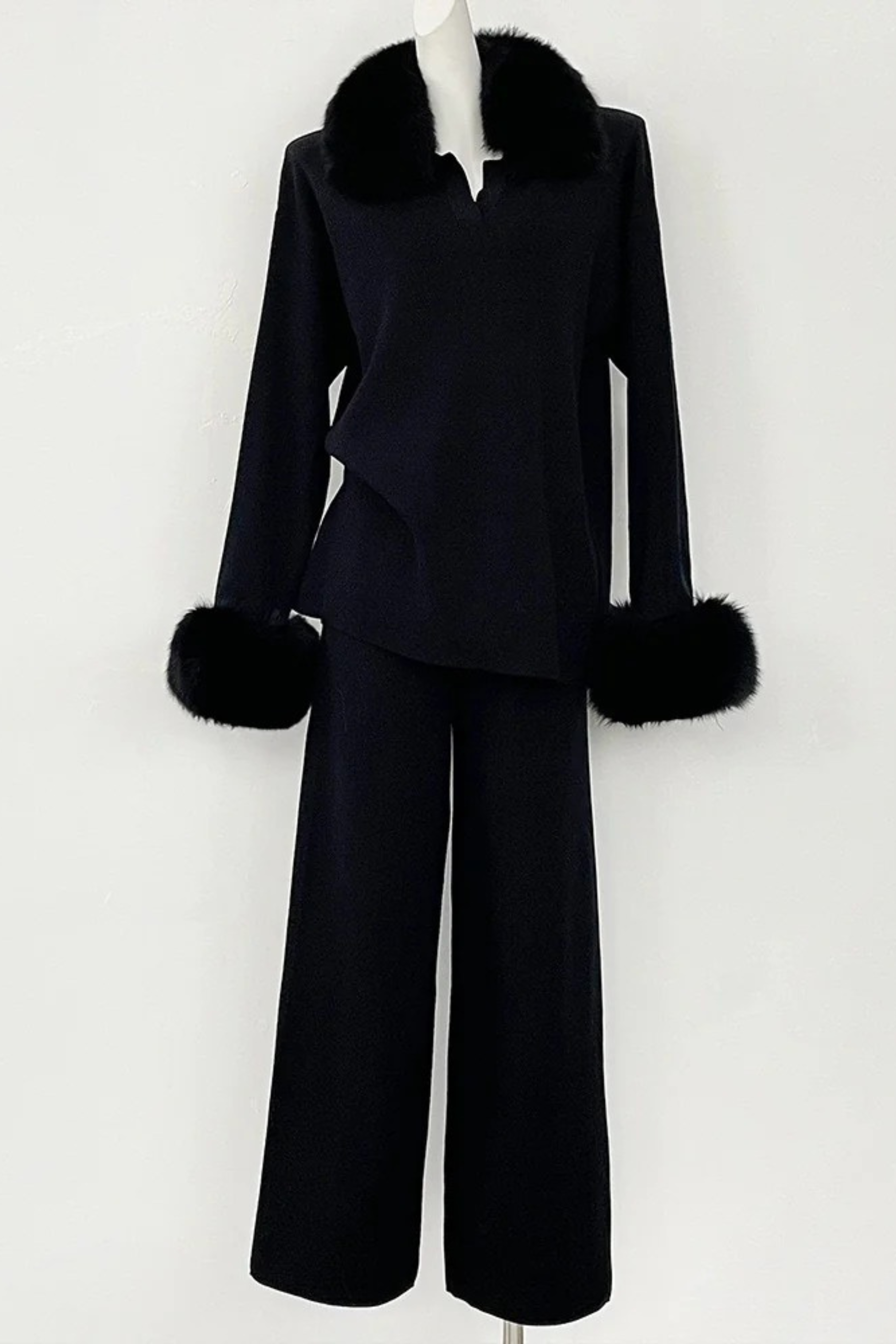 Elevate your winter style with this luxurious knit two-piece set, designed for effortless elegance and cozy sophistication. The soft knit fabric offers warmth and comfort, while the plush faux fur trim on the collar and cuffs adds a glamorous, high-end touch.