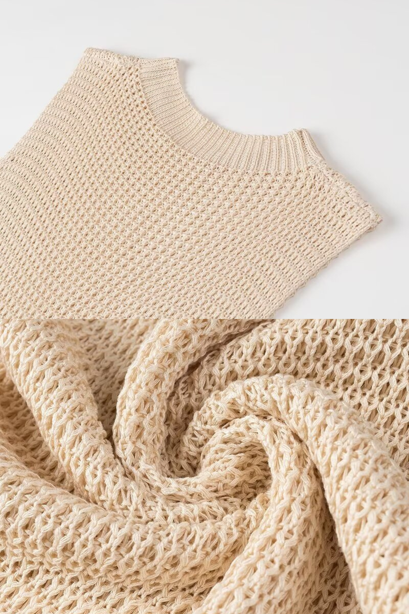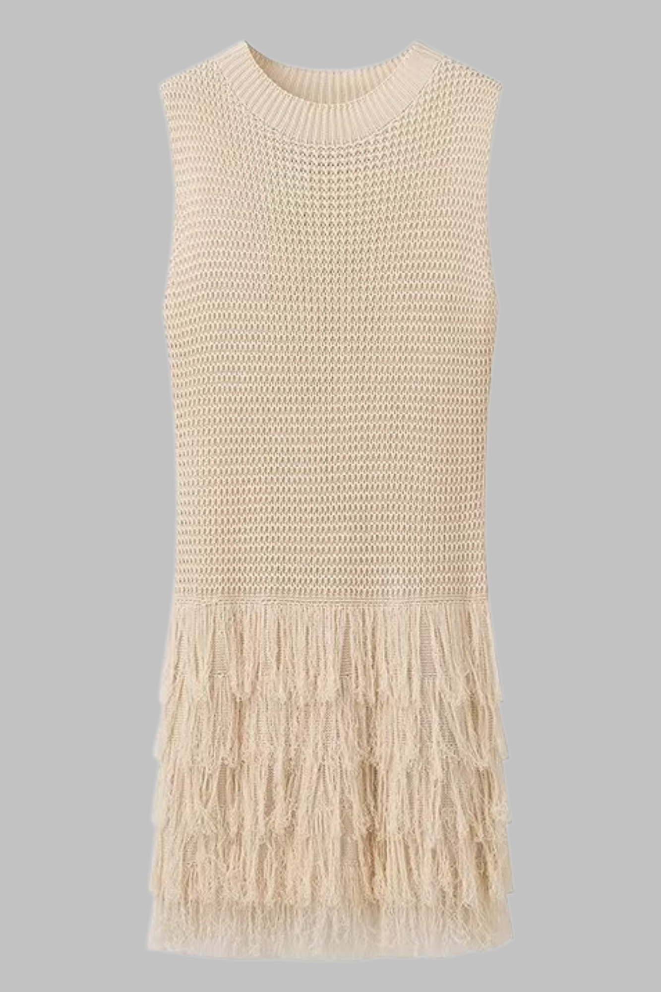 Turn heads in this stunning solid-color sleeveless knitted mini dress, designed with a modern boho-chic aesthetic. Crafted from a breathable hollow knit fabric, this dress combines comfort with style, making it the perfect summer statement piece. The round neckline adds a touch of simplicity, while the sleeveless cut enhances freedom and ease.