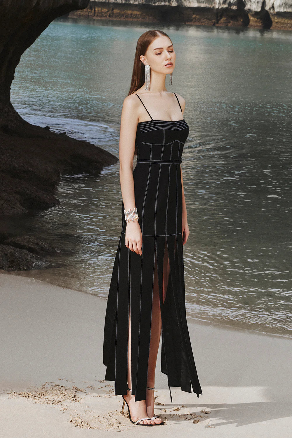 A sleek and sophisticated long dress featuring slim spaghetti straps, contouring contrast stitching, and a flattering fitted silhouette. The structured bodice and waist belt define the figure, while the front slit adds movement and allure. Perfect for elegant evenings, resort events, or modern formal occasions, this dress combines minimalist design with timeless appeal.