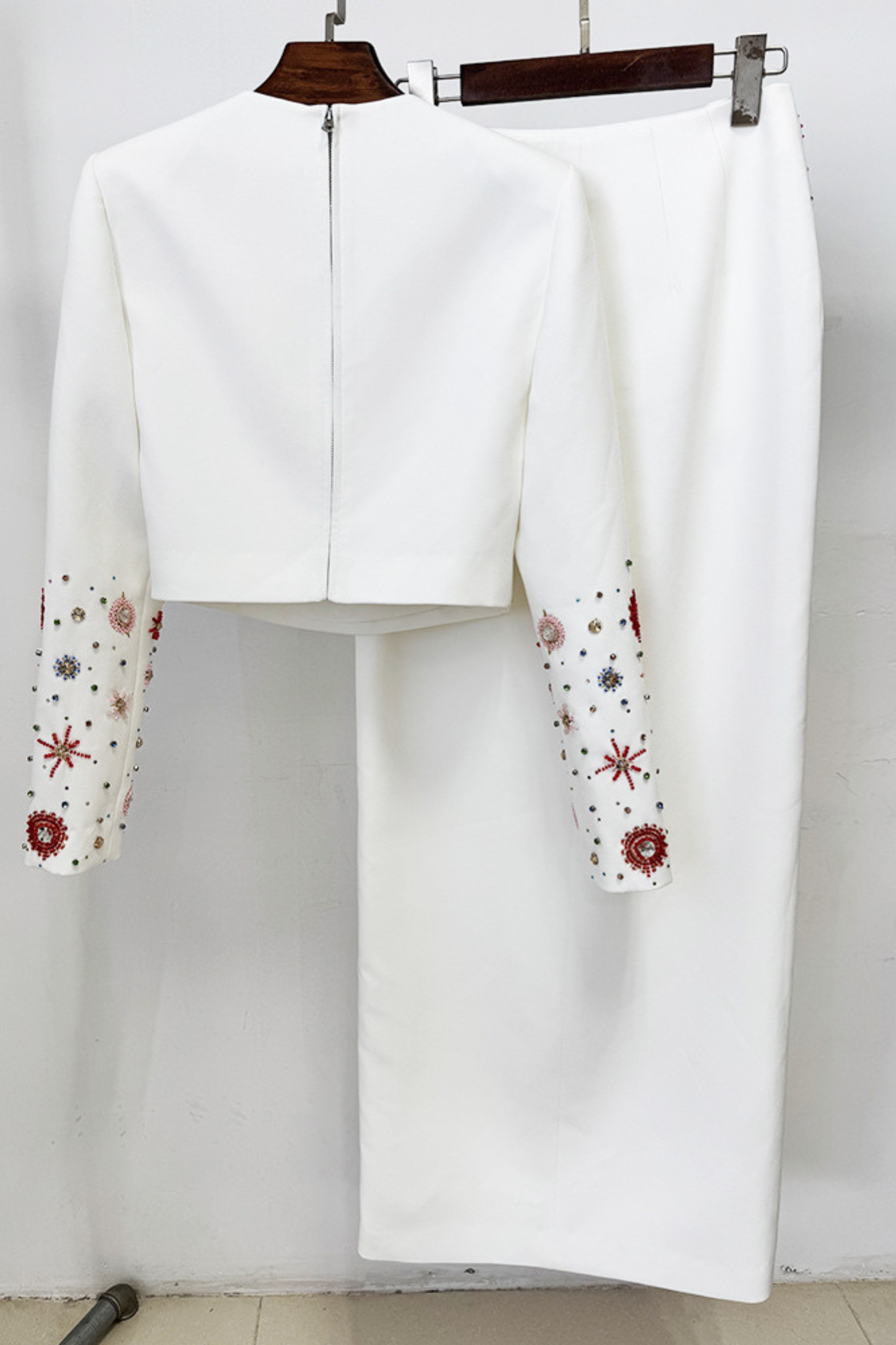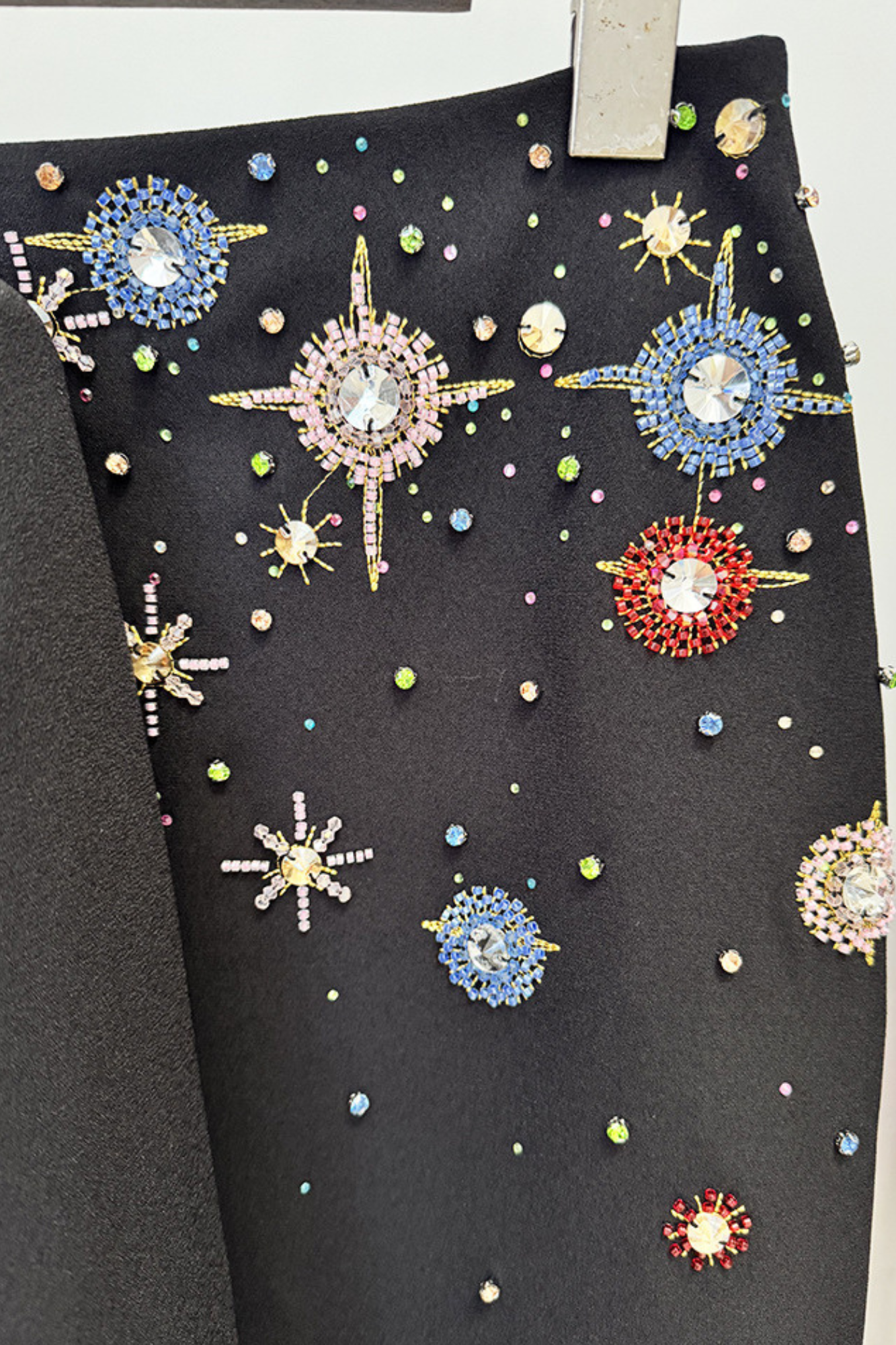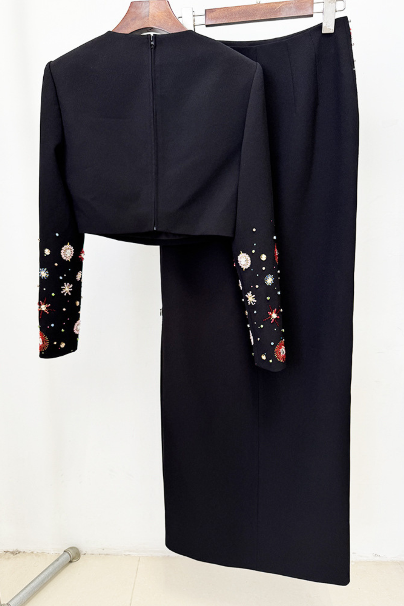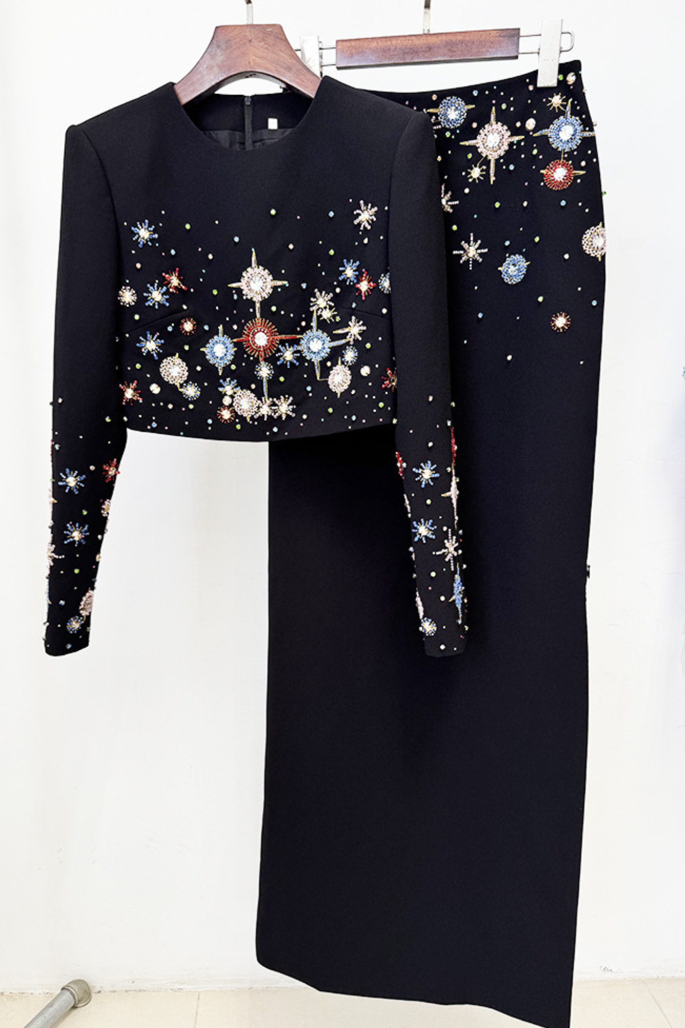 Step into celestial elegance with this stunning two-piece ensemble, designed to shine at any high-end evening event. The long-sleeve crop top features intricate hand-sewn beadwork and crystal embellishments arranged in starburst and galaxy-inspired patterns, creating a dazzling cosmic effect. Paired with a high-waisted fitted maxi skirt, the design elongates the silhouette while the daring thigh-high slit adds a bold and sophisticated touch.