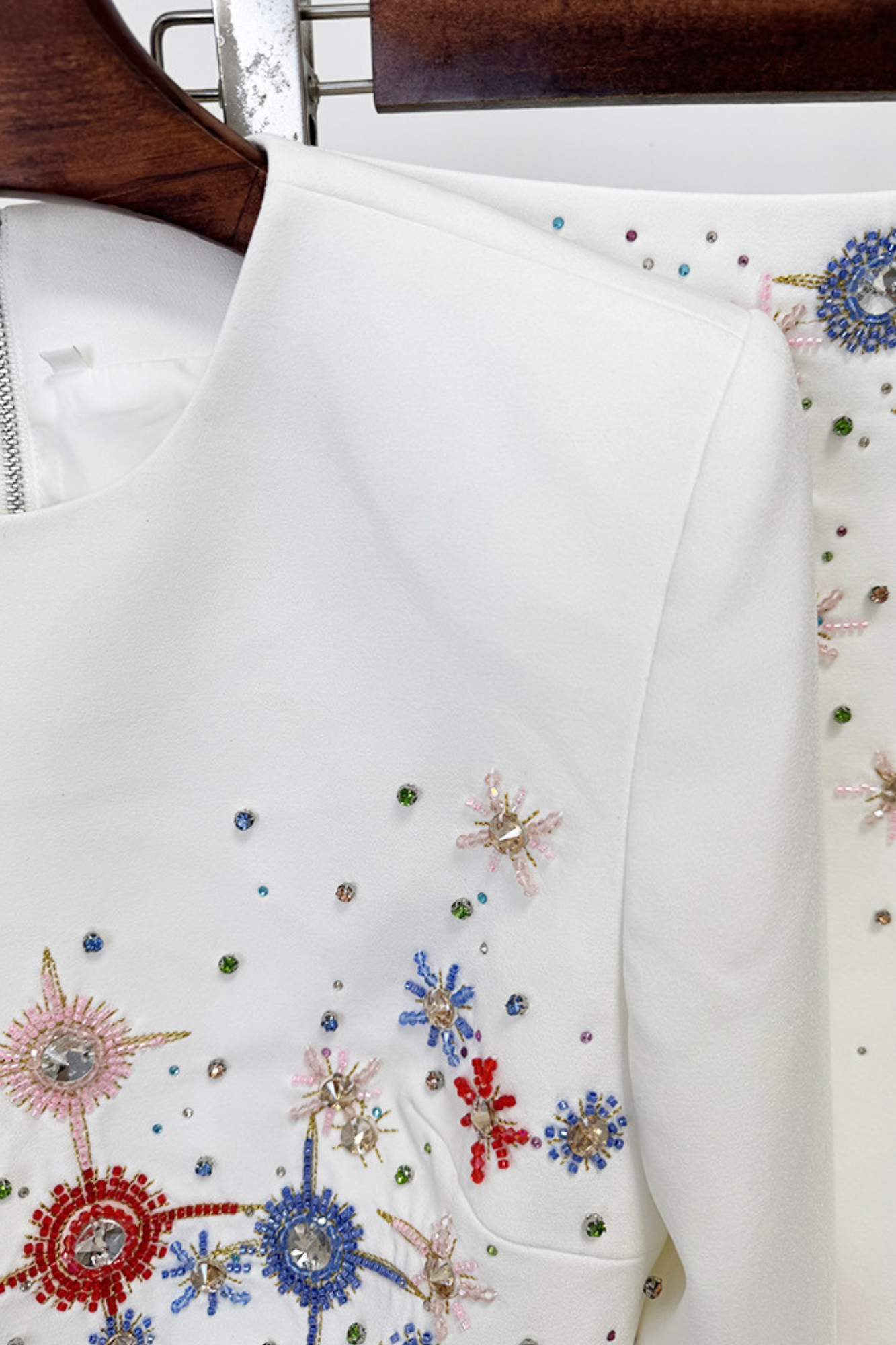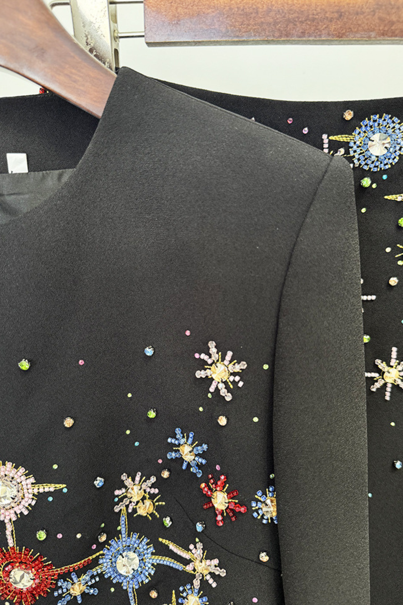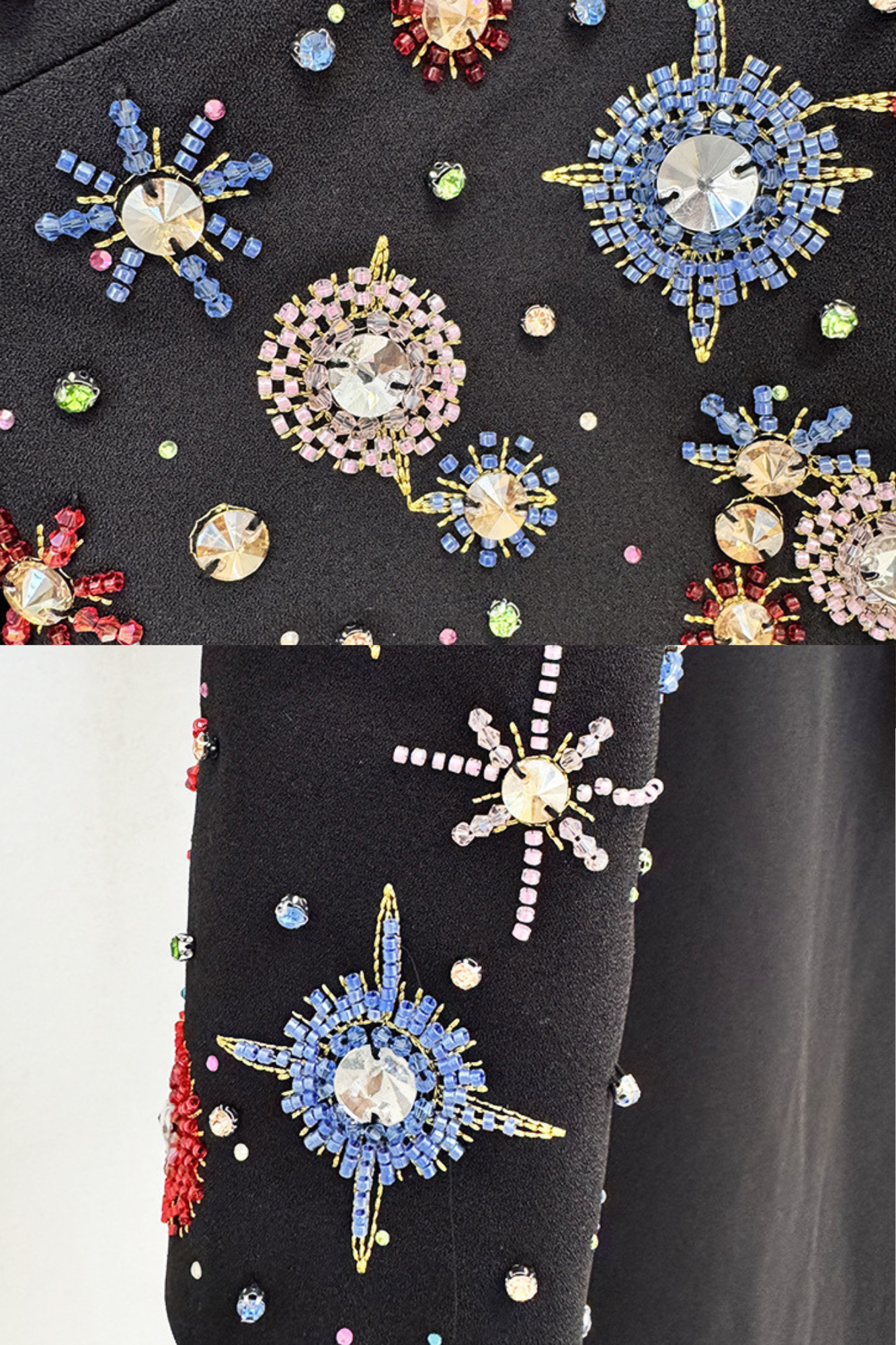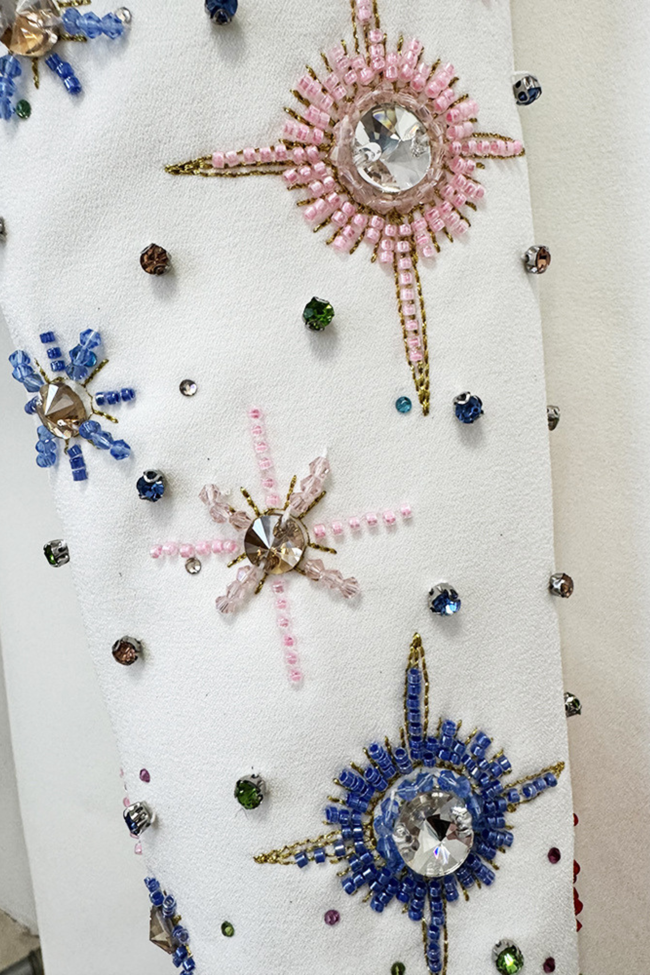 Step into celestial elegance with this stunning two-piece ensemble, designed to shine at any high-end evening event. The long-sleeve crop top features intricate hand-sewn beadwork and crystal embellishments arranged in starburst and galaxy-inspired patterns, creating a dazzling cosmic effect. Paired with a high-waisted fitted maxi skirt, the design elongates the silhouette while the daring thigh-high slit adds a bold and sophisticated touch.