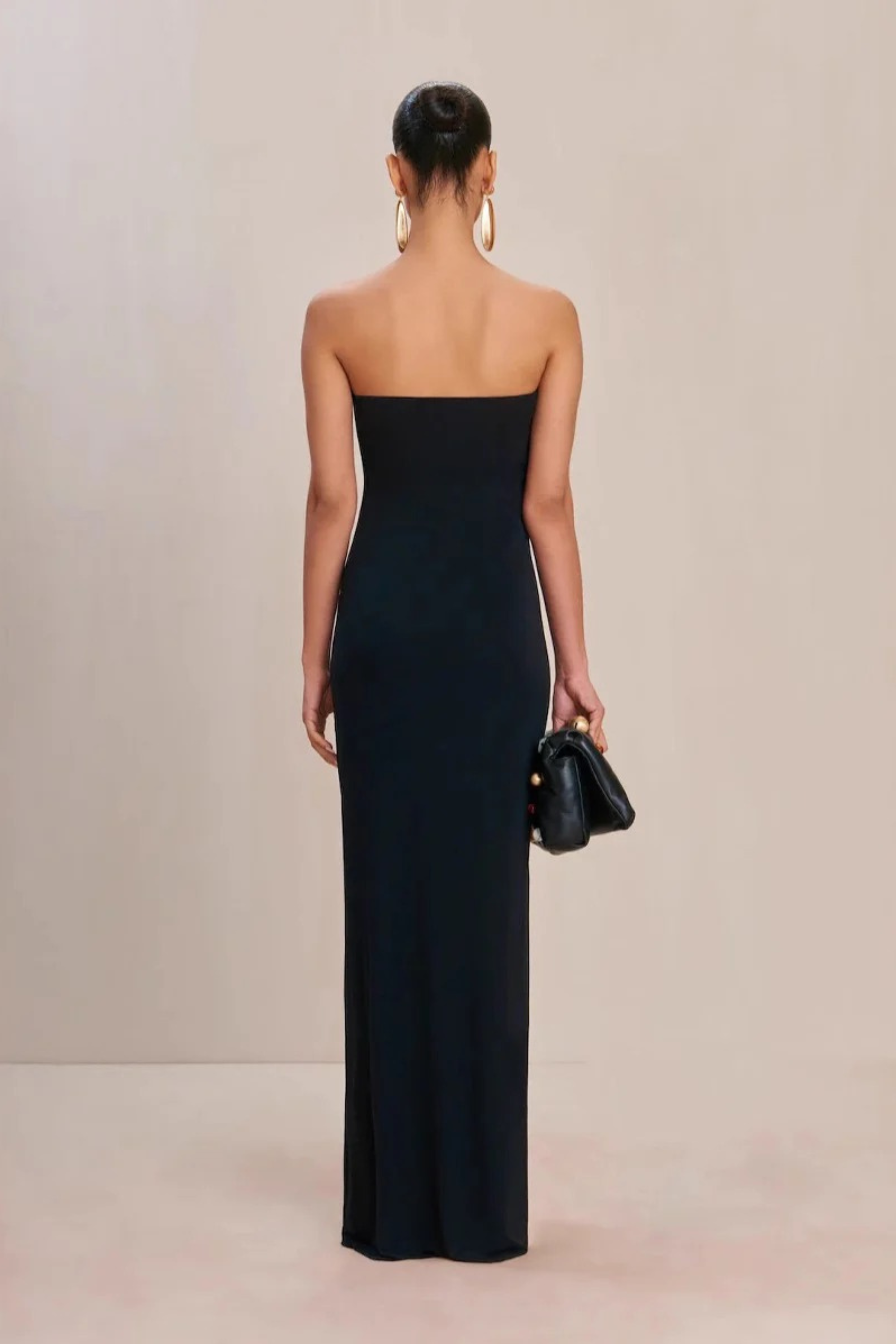 A captivating evening dress that defines sophistication and allure. This strapless bandage long dress is crafted from premium stretch fabric that hugs the body beautifully, enhancing every curve. It features a striking sculpted gold-trim neckline that adds a bold and elegant touch to the minimalist silhouette. Perfect for formal events, galas, or special occasions, this dress combines timeless glamour with modern edge for an unforgettable statement look.
