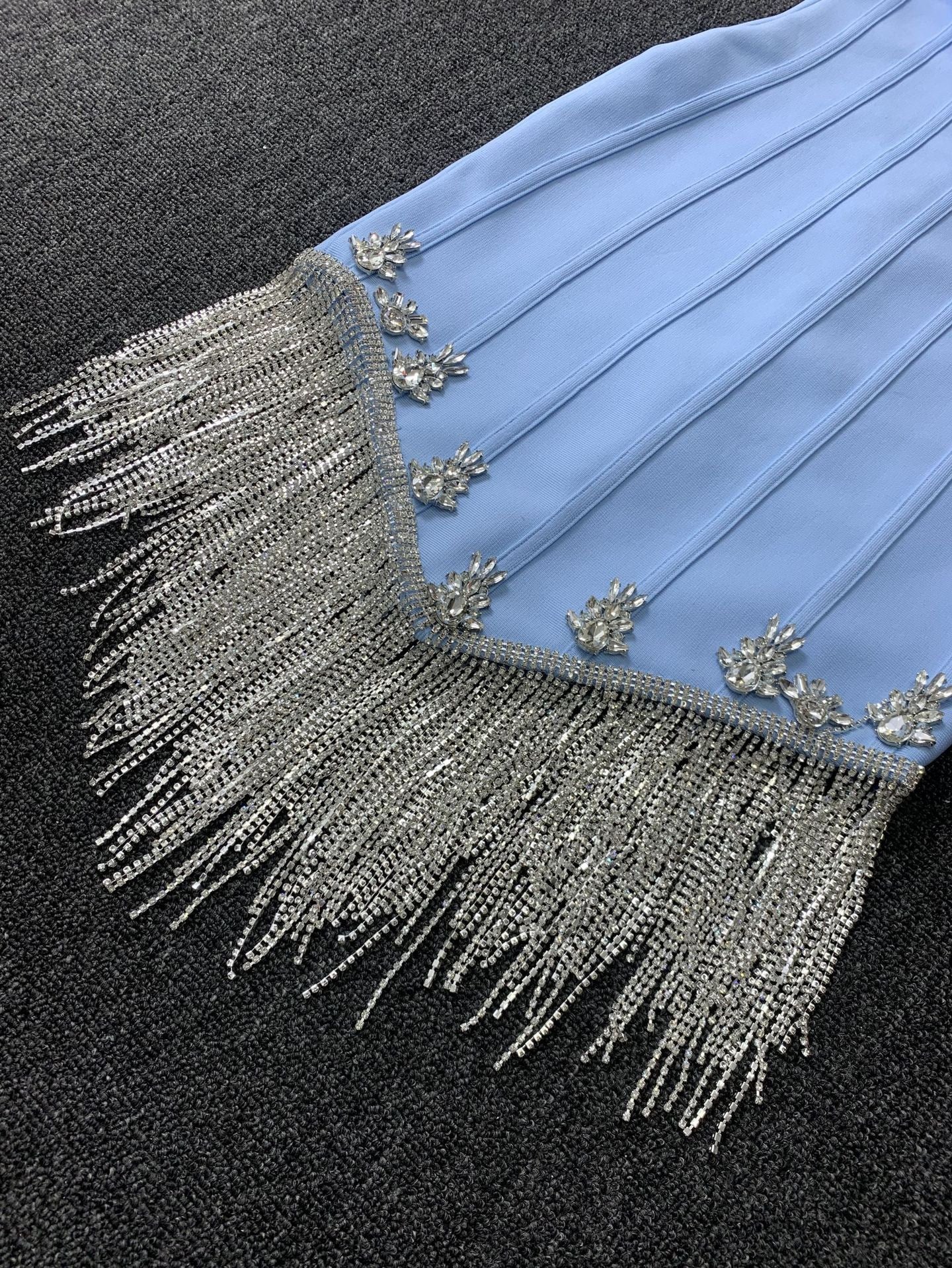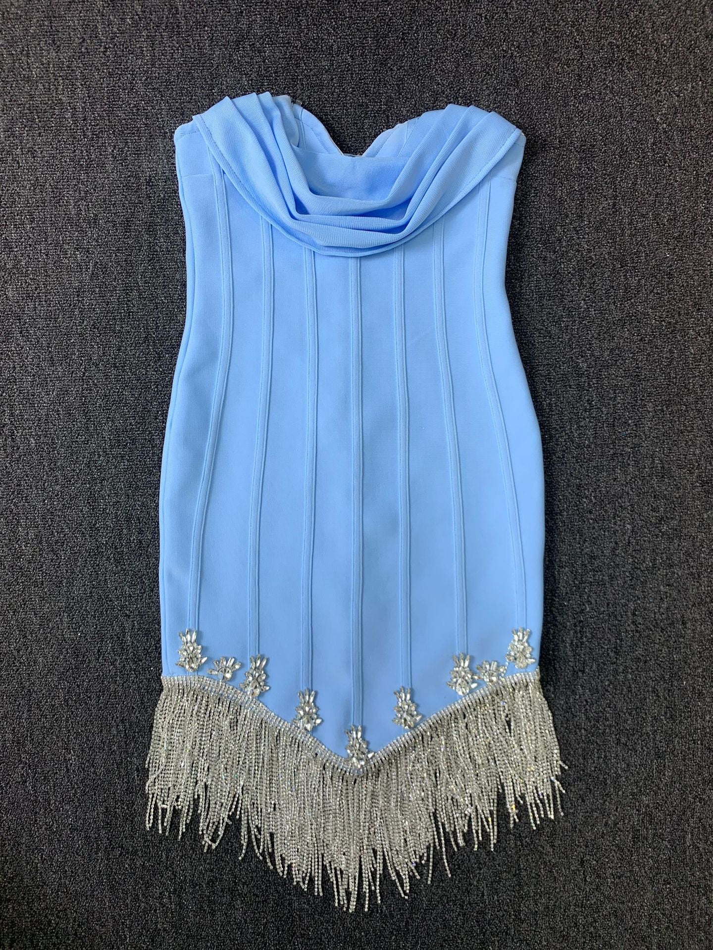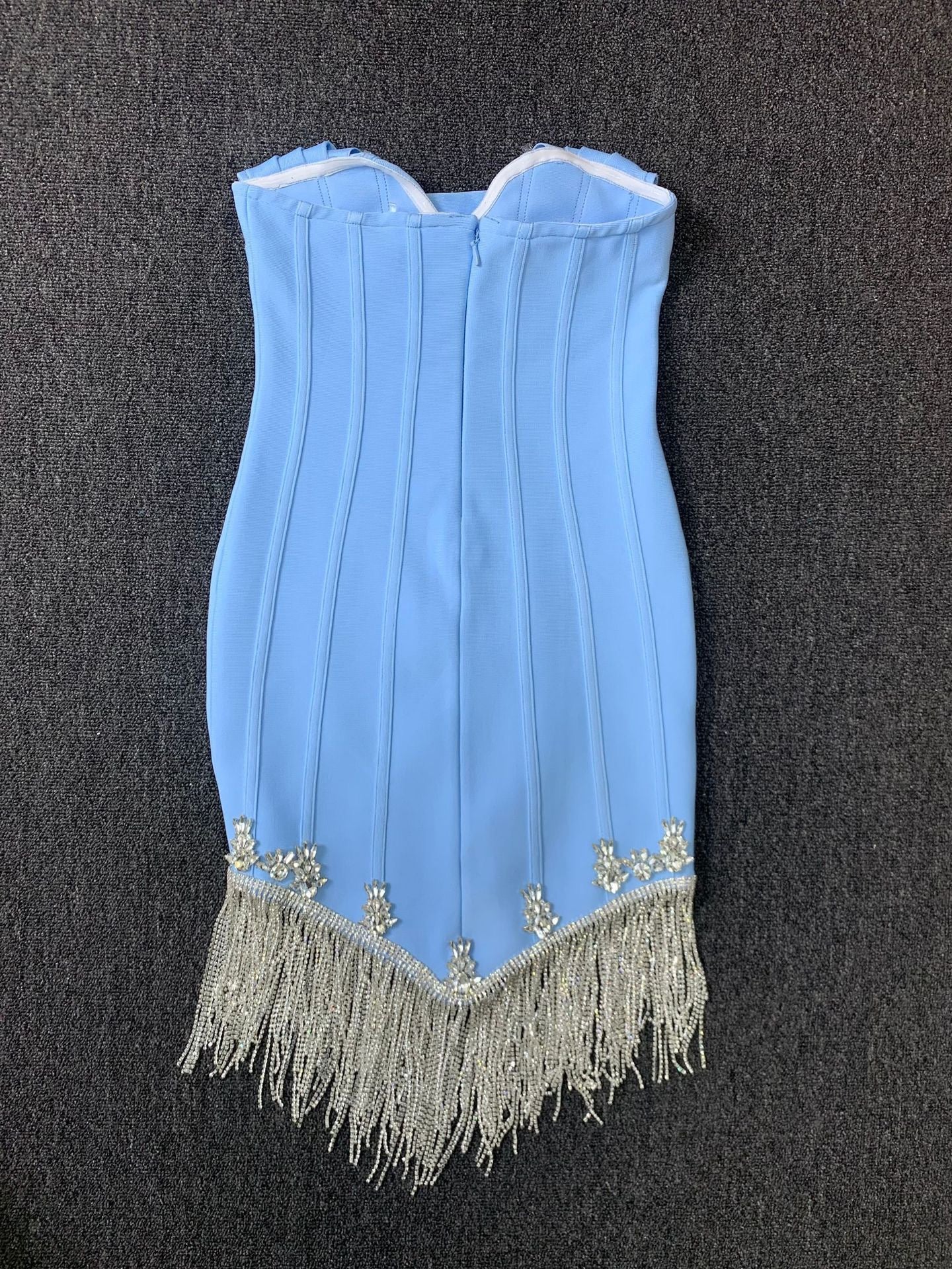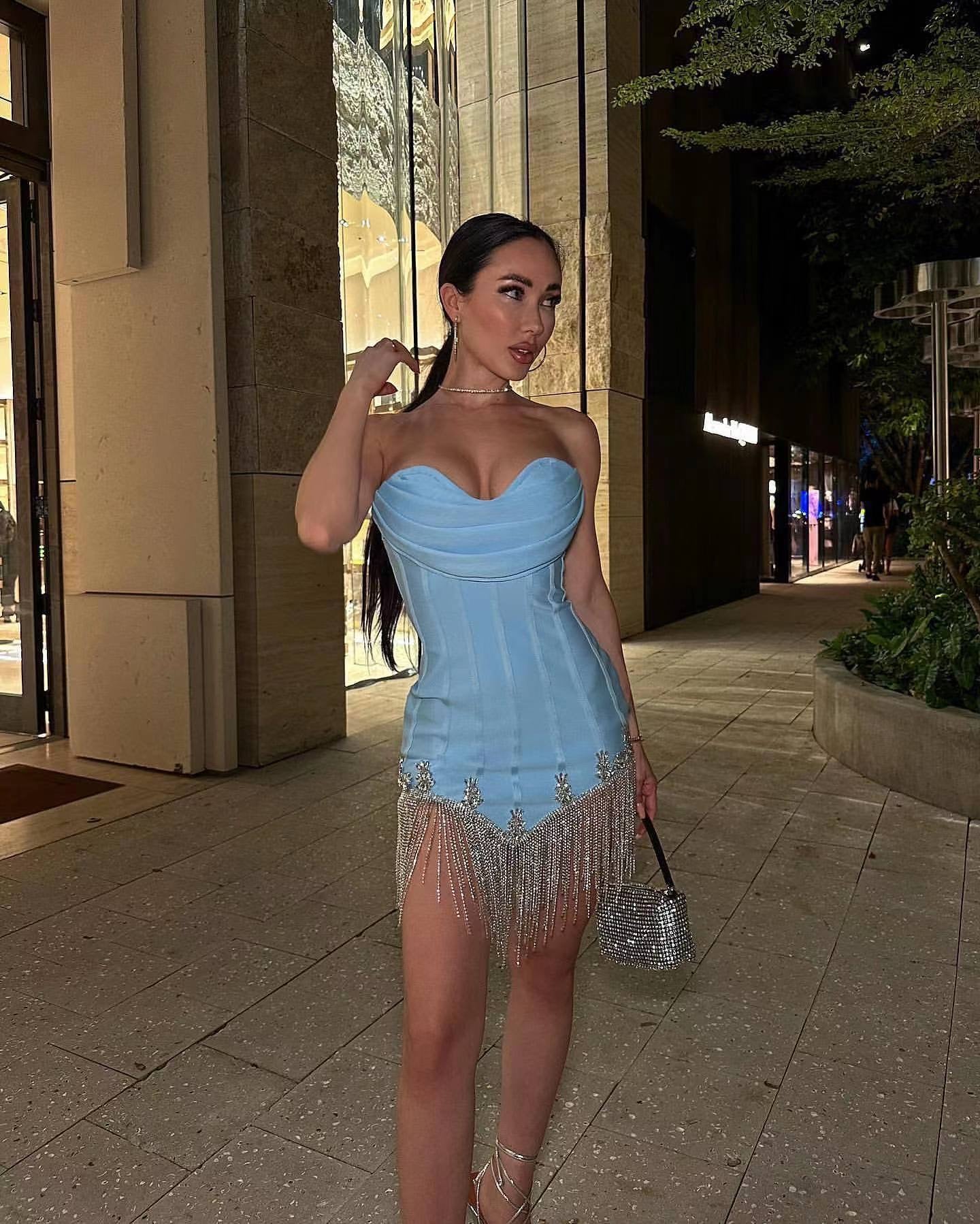 A statement-making mini dress designed with a structured corset bodice that shapes and enhances the silhouette. The strapless sweetheart neckline adds a feminine touch, while the hand-placed crystal fringe detailing creates show-stopping movement with every step. Perfect for nights out, celebrations, and special occasions.