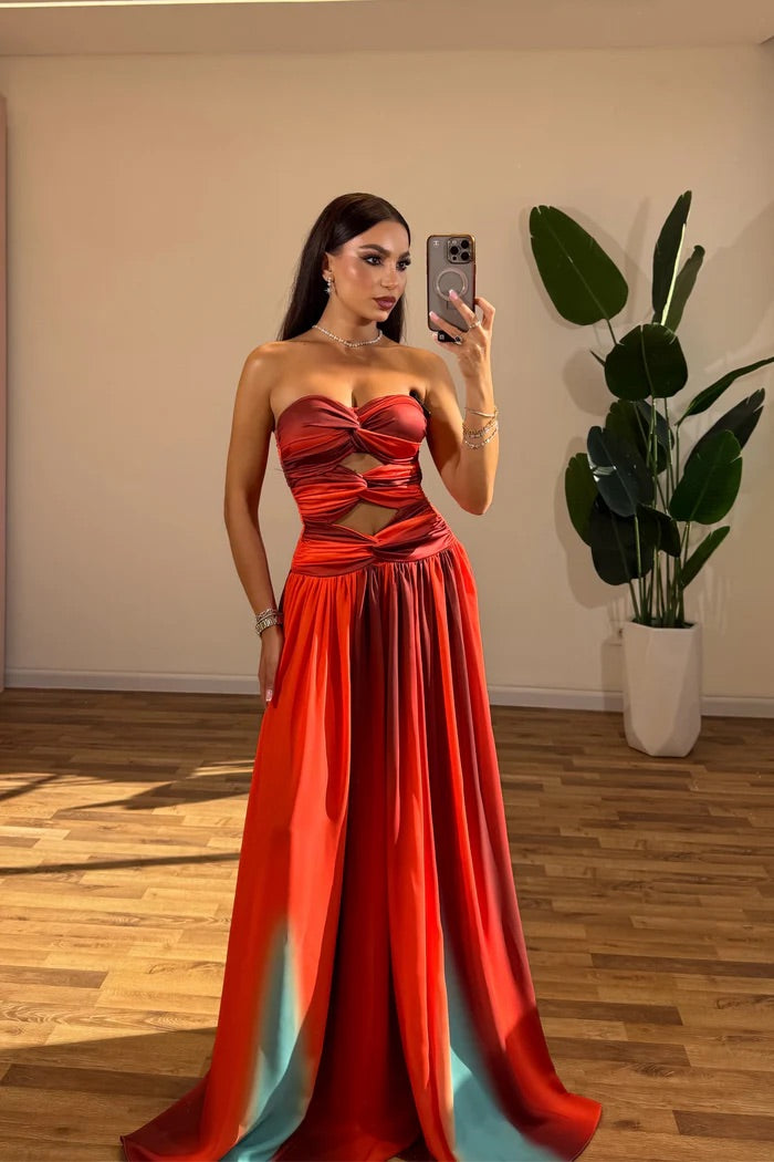 Turn heads in this bold strapless maxi dress, featuring a sculpted bodice with front cutouts and a flattering gathered waist. The flowing skirt stuns with a vibrant red-to-teal ombre effect, creating an elegant yet edgy silhouette perfect for evening events, galas, or special occasions.